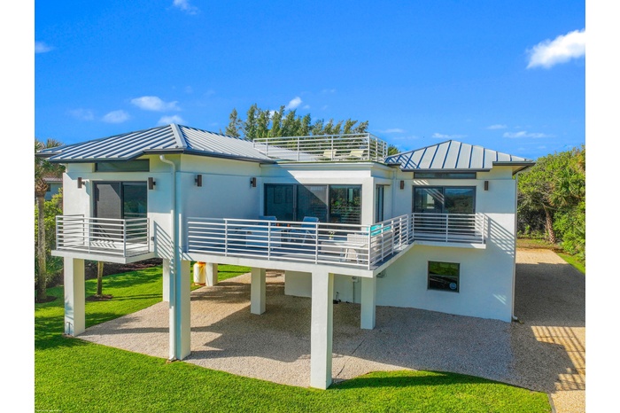 Completely renovated in 2023 this beautiful modern home has commanding ocean views just yards from the surf. The poured cement home has impact glass windows, doors and is set high on concrete pilings. Solar array panels on it's galvalume metal roof keep utility bills to a minimum. Located on a quiet stretch of Jupiter Island yet minutes to restaurants, shopping and Palm Beach International Airport it's the perfect blend of privacy and convenience. Open floor plan with ocean views from living, dining and primary bedroom suite There is room for a pool. Landscape plans with pool placement are located under documents tab on MLS.