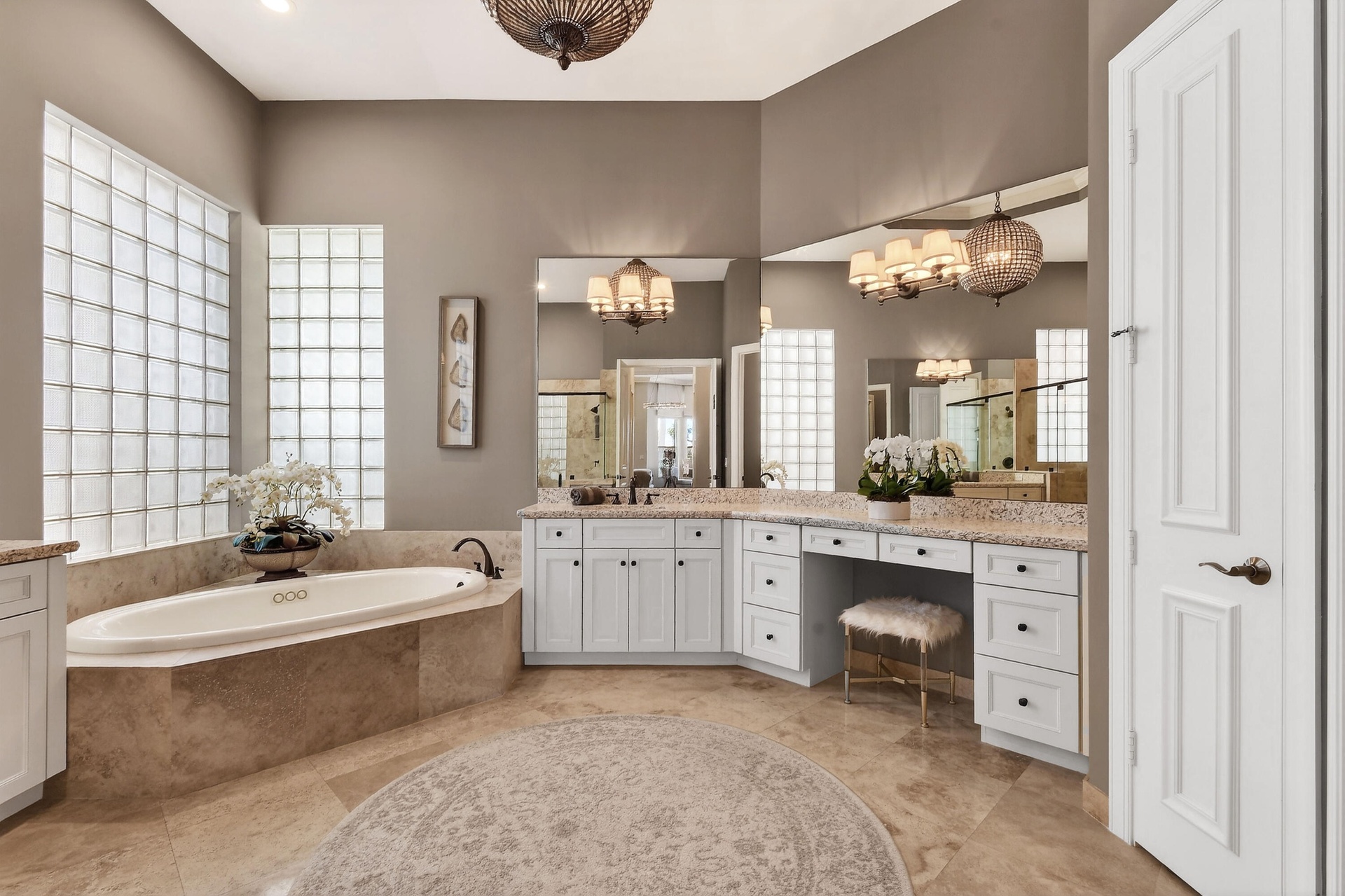 The bedroom suites are thoughtfully positioned for privacy. The primary suite offers serene views, direct pool access, generous walk-in closets, and a spa-inspired bathroom with dual vanities, a soaking tub, and a separate walk-in shower. Each guest suite includes its own private full bath, creating a luxurious experience for family or visiting guests. A fourth full bathroom, conveniently located near the main living area, also serves the pool and entertaining spaces.