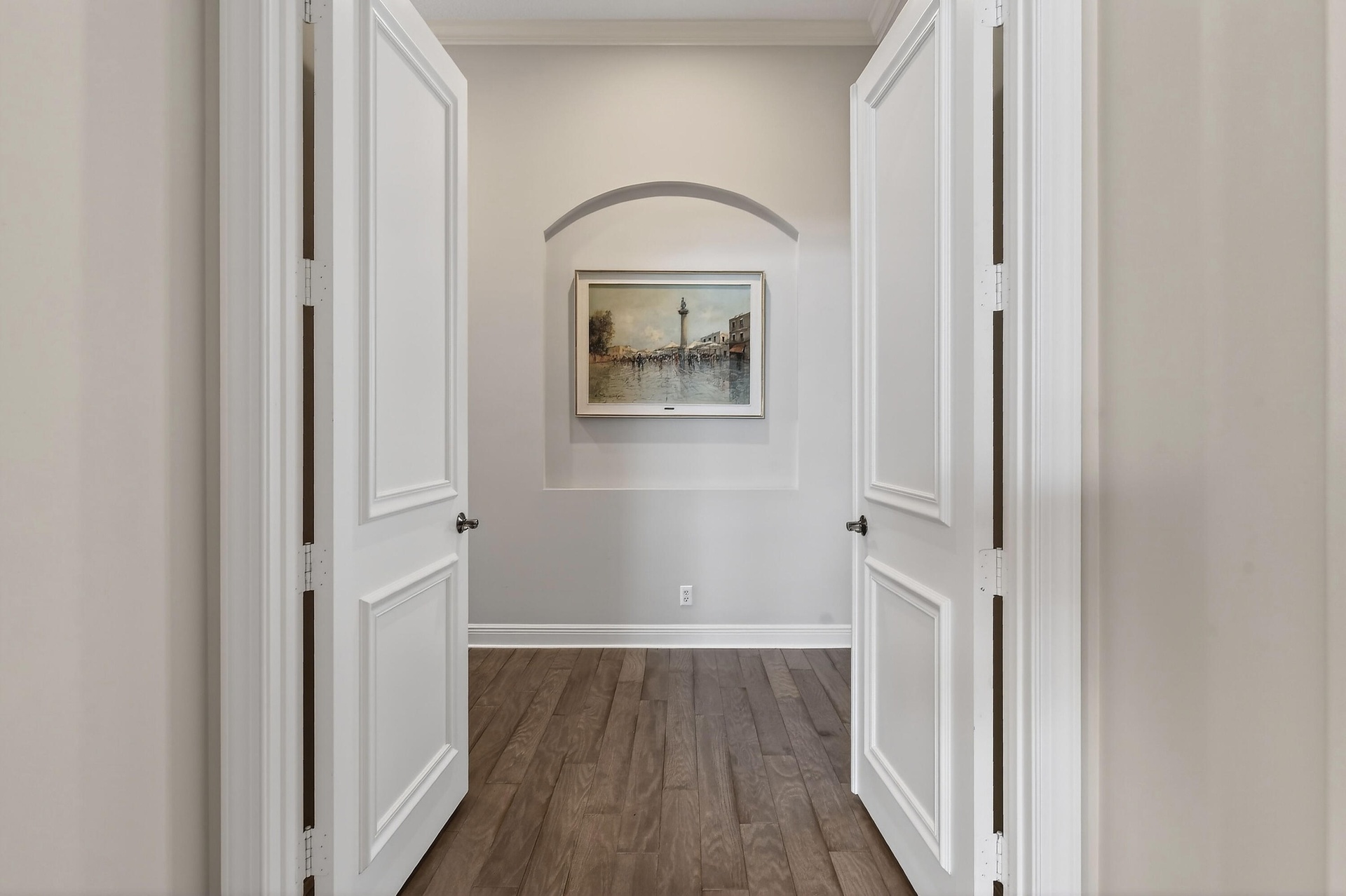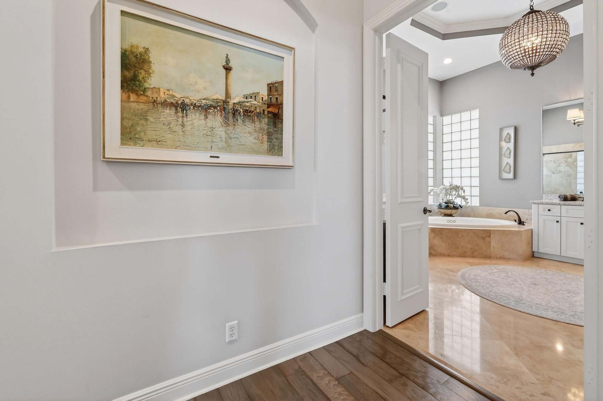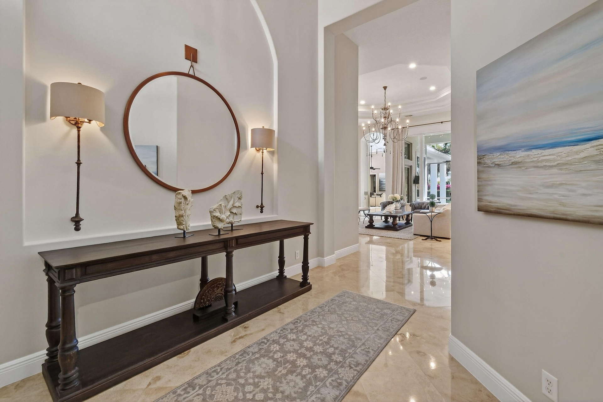 Within the prestigious, guard-gated community of Frenchman's Reserve, this elegantly reimagined single-story residence offers refined luxury, privacy, and timeless architectural appeal. Situated at the beginning of a quiet cul-de-sac on an oversized pie-shaped lot, the home enjoys expanded backyard space and tranquil golf and partial lake views across the 7th and 8th fairways, framed by mature landscaping and soft morning light. Offering more than 3,400 square feet of living space, the residence features three ensuite bedrooms, a dedicated office, and four full baths, all thoughtfully designed for both gracious entertaining and effortless everyday living. A grand foyer opens to expansive living and dining areas with soaring ceilings, elegant archways, marble flooring, custom millwork, recessed lighting, and a statement chandelier. Large windows fill the home with natural light while showcasing views of the pool, backyard, and fairways. These formal spaces transition seamlessly into the family room and the fully renovated chef's kitchen, appointed with quartz countertops, a substantial center island, custom paneled cabinetry, and professional-grade appliances including Sub-Zero and Thermador, along with a U-Line wine cooler and stainless-steel farm sink.