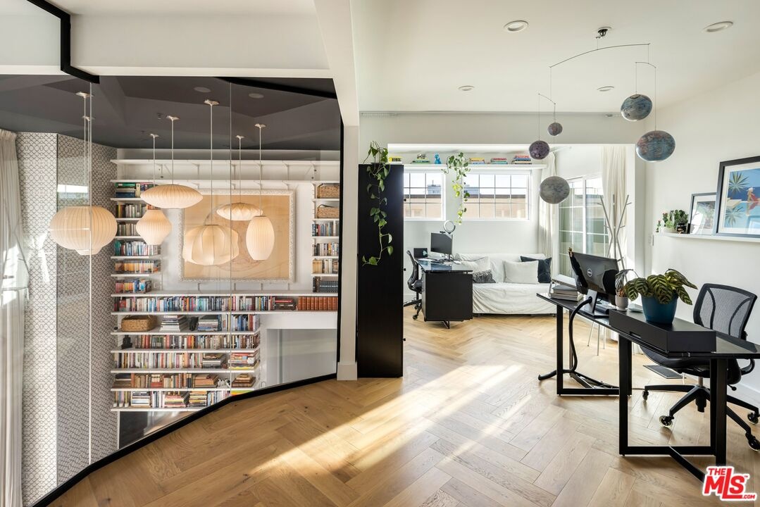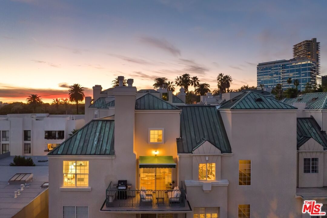 DRAMATIC TOP-FLOOR CORNER UNIT IN DOHENY'S MOST SOUGHT-AFTER LOW RISE. Exceptionally redesigned from top to bottom, this thoughtful and extraordinary 2-bedroom, 2.5-bath loft-style residence showcases sublime craftsmanship and unsurpassed attention to detail. The main level features two spacious bedrooms and two beautifully appointed bathrooms, while the upper level offers an open office or flex space, a powder room, and direct access to a private rooftop outdoor deck. The living room opens to a private balcony complete with a retractable awning, creating an ideal shaded outdoor retreat. The remodeled modern kitchen is a true centerpiece, featuring a Bosch gas range, sleek contemporary cabinetry, and a generous pantry area. The kitchen opens seamlessly to the expansive open floor plan, making it perfect for entertaining and everyday living alike. Every element was custom-designed specifically for this home, creating a refined blend of form and function. The sun-filled interior is highlighted by dramatic architectural details, including a floor-to-ceiling glass-enclosed loft, a striking statement bookcase, and an elegant fireplace. High-end finishes include heated bathroom floors, Italian marble, and French oak hardwood flooring throughout. Located on one of West Hollywood's most sought-after streets, this is a rare opportunity to own a truly special condominium in the prestigious Doheny Place, an exclusive 41-unit full-service luxury building. Amenities include 24-hour security and concierge service, a heated swimming pool, spa, his-and-hers sauna and steam rooms, a fully equipped fitness center, gated side-by-side parking, and a private storage unit. HOA dues include earthquake insurance, internet service, and basic Spectrum