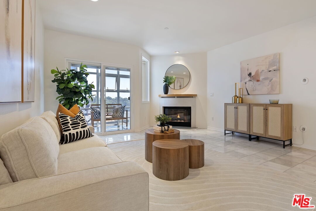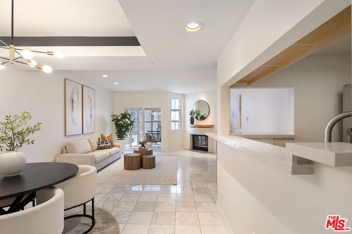 Located in a desirable central Brentwood location, this private and well appointed 2-bedroom, 3-bath townhouse style condo offers a spacious, comfortable layout spanning 1,576 square feet. The upper level features an open-concept design with a modern kitchen equipped with stainless steel appliances, a dedicated dining area, and a generous living room with marble floors, city and mountain views, a gas fireplace, and a large guest powder room. A sun-drenched glass-enclosed bonus space makes the perfect office or reading nook. Downstairs, both bedrooms offer privacy and comfort. The expansive primary suite includes a sitting area, two closets (including a walk-in), and en-suite bath with a soaking tub and separate shower. The second bedroom also enjoys its own full bath. This level also includes a side-by-side laundry area, extra storage, and direct access to a private outdoor patio. Additional amenities include Nest thermostats on each level, side-by-side parking spaces, ample guest parking, and a dedicated storage cage. There are dual entrances, one on each level, providing added flexibility and convenience for daily living, guests, or a work-from-home setup. The secure building offers resort-style living with a pool, spa, sauna, and gym. Ideally located near UCLA, the 405, top-rated schools, and Brentwood's premier shops and dining.