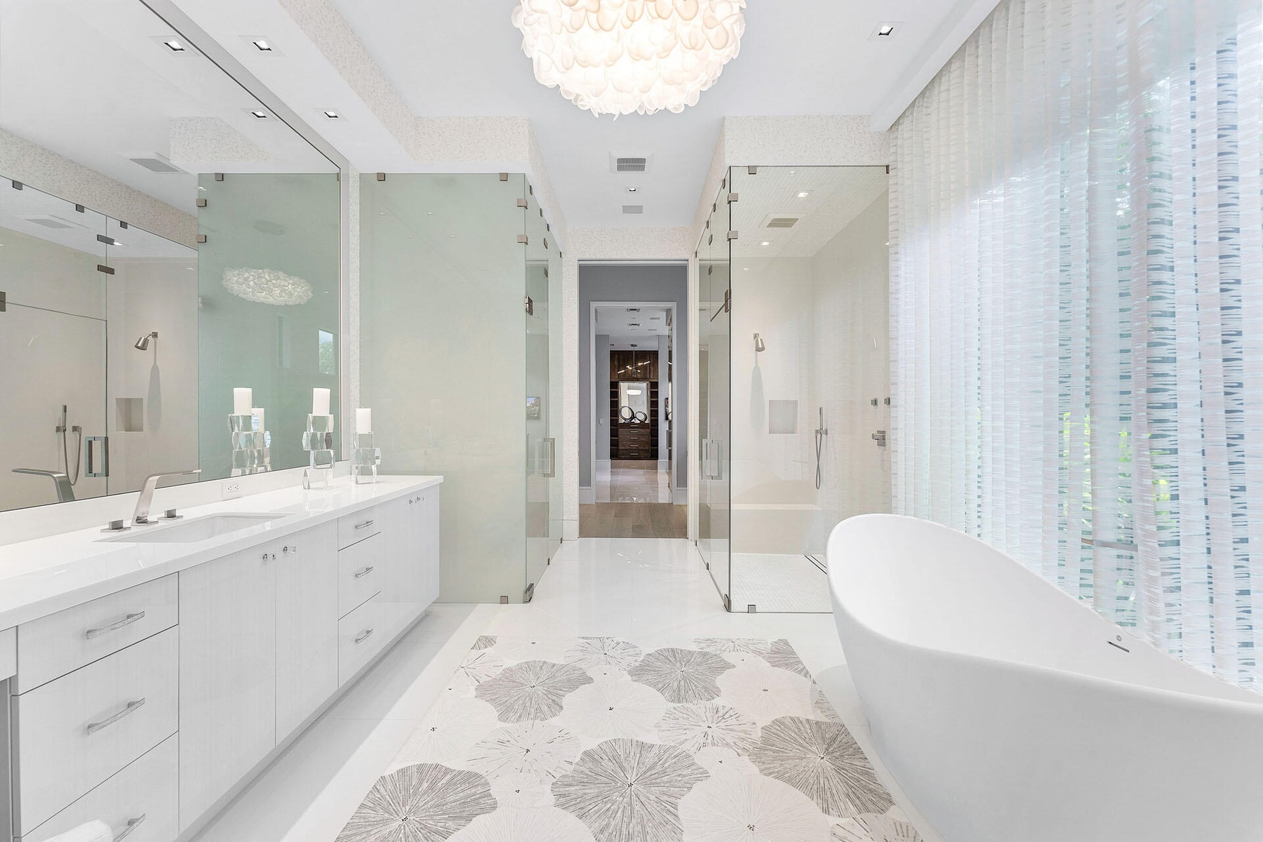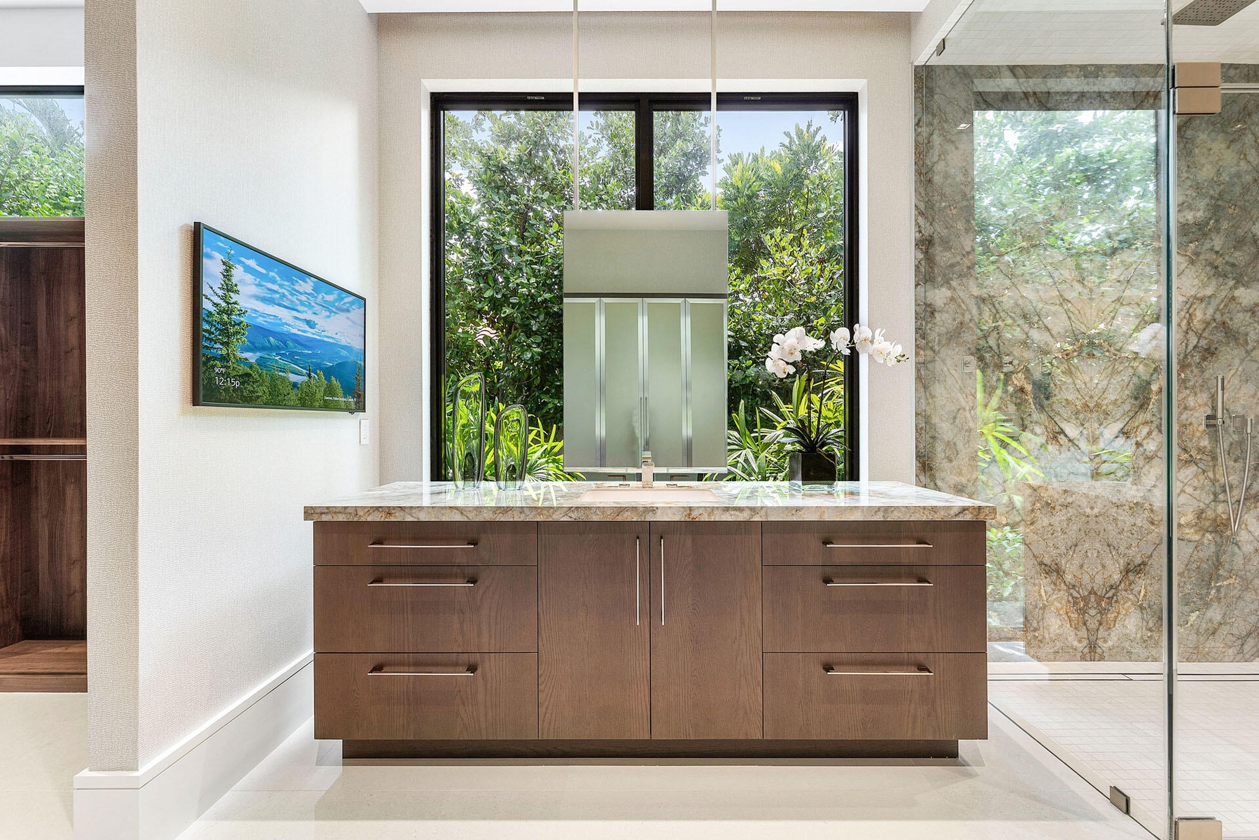The property features five exquisite bedroom suites, including a first-floor master suite, six full bathrooms, and two half bathrooms. The master suite showcases both his and her bathrooms; each outfitted with lavish steam showers for ultimate relaxation. Designed with convenience and style, the estate also boasts a four-car garage equipped with air conditioning and EV charging stations, ensuring comfort and functionality. The driveway, constructed with a durable concrete base and finished with porcelain, exudes sophistication and longevity.
