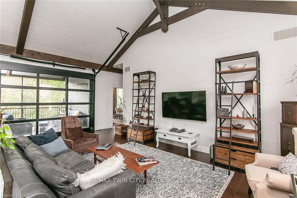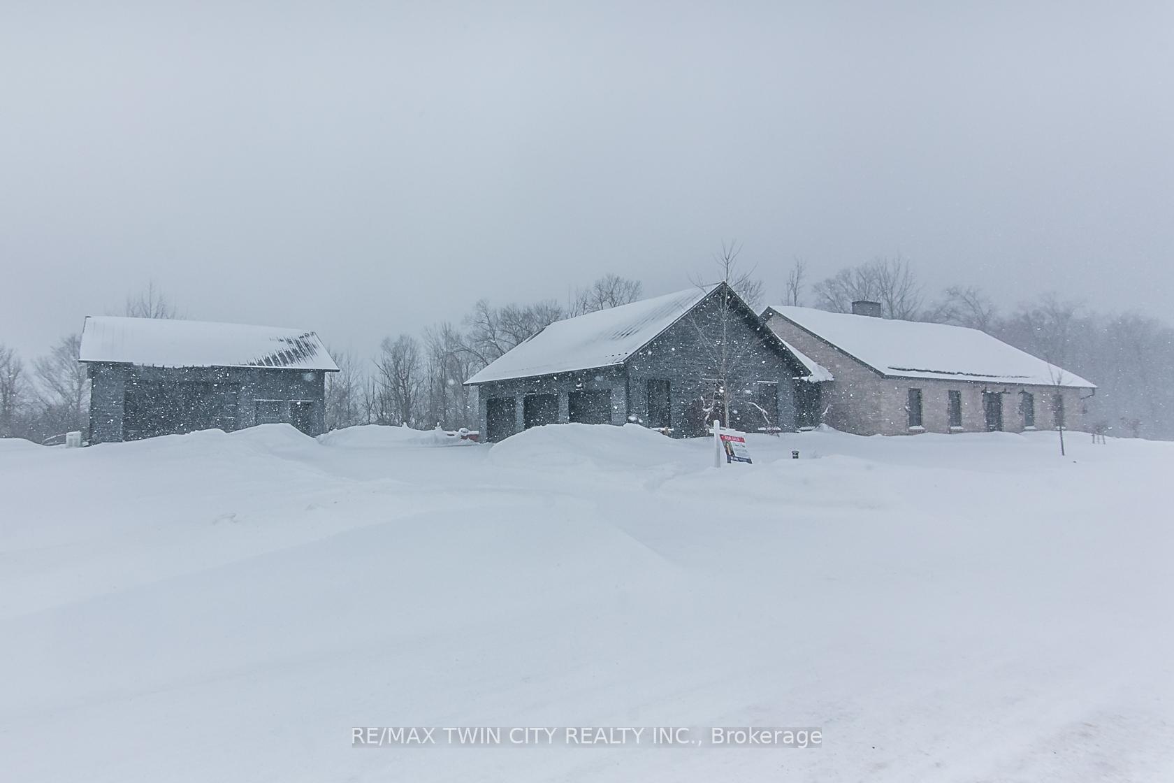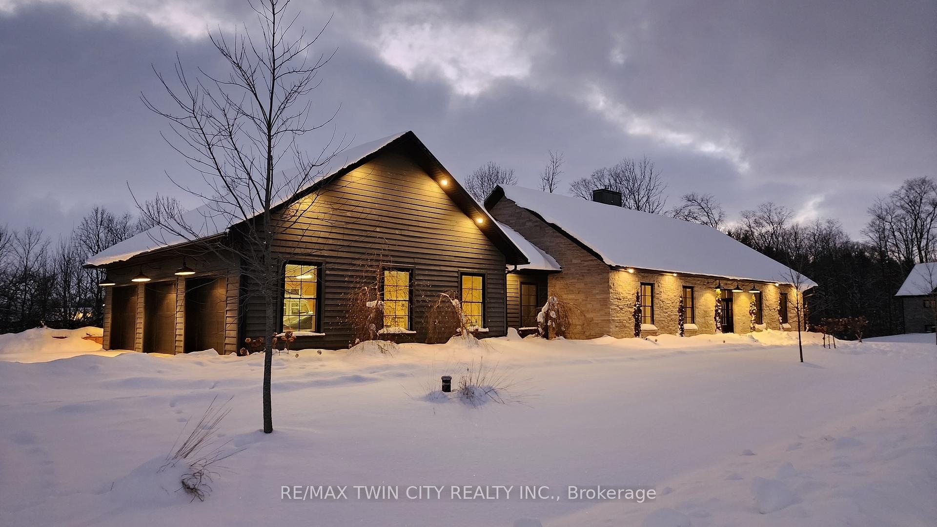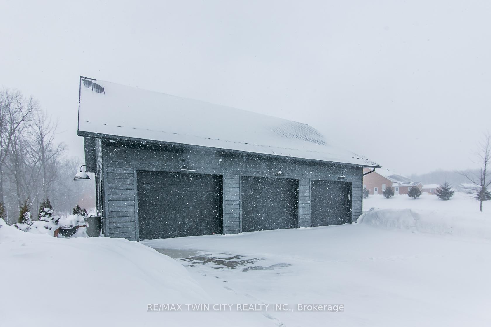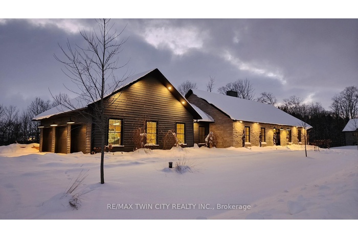 Spectacular Custom-Built Bungalow with Walk-out Basement, Triple Car Garage & Detached 2-Storey Garage & Shop on Two Acres-just 35-45 min from Waterloo! Nestled in an exclusive enclave of executive homes in Moorefield, this property offers a peaceful country setting with easy city access. Built like no other, it showcases structurally superior ICF (insulated concrete form) construction & a lifetime metal roof-the same quality extends to the det garage. Inside, the open-concept layout features exposed timber-frame details, soaring vaulted ceilings & 2 glass garage doors that open onto a 3-season porch.The kitchen, dining & living area impress w/ a stone f/p, concrete counters, oversized island & fantastic walk-in pantry w/ floor-to-ceiling storage. At its heart: an 8-burner Wolf gas stove, double ovens & upgraded range hood-over $40,000 in luxury appliances! Entertain year-round w/ the screened porch, complete w/ outdoor kitchen, brick hearth & fume hood for your bbq. The main floor also boasts a stunning primary suite w/ walk-in closet, spacious dressing rm & spa-inspired ensuite. A 2nd bedroom, currently an office, offers lovely treed views. A stylish mudrm, laundry rm & powder rm w/ live-edge barn door complete the main level. The fin w/o basement features heated floors, 2 bedrooms, 4-pc bath & expansive rec spaces-perfect for family gatherings or games night. 2 more w/o garage doors lead to the backyard & patio. For hobbyists, the 3-car gar is wired for an EV, while the sep insulated 2 storey wrkshp w/ electrical & wood stove provides endless options for projects, vehicles or gym. The nearly 2-acre property incl a pool-sized lot, new tiered deck, firepit area, treehouse & almost an acre of forest w/ a creek running through it. Your own private retreat!