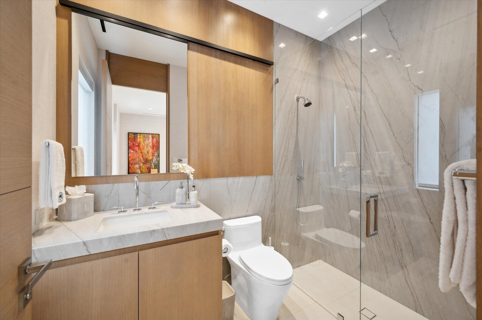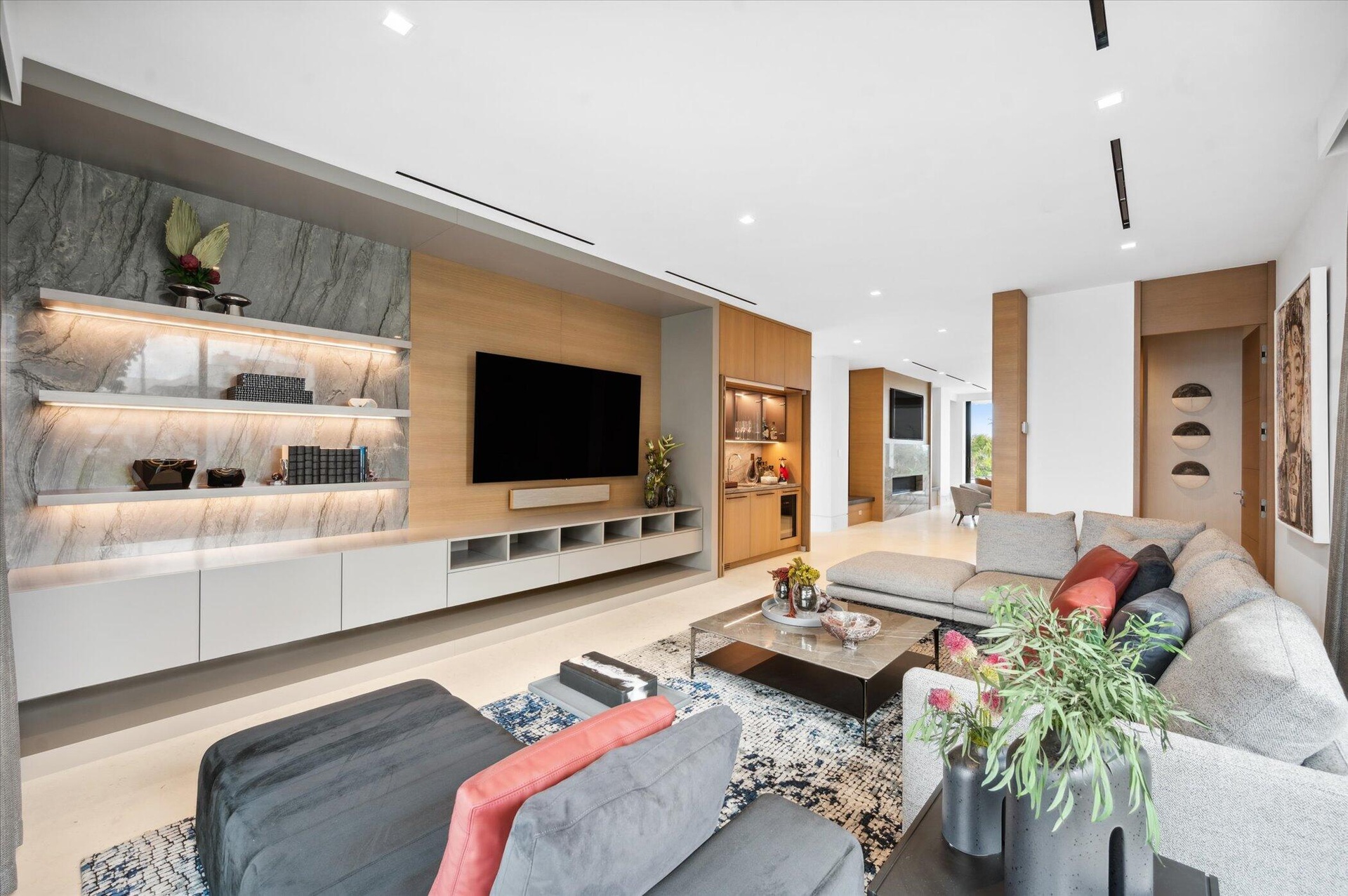 This brand new built home is being sold TURN-KEY, so simply bring your clothes and personal items. 999 Hillsboro is built like a fortress using the latest building code with waterproofed concrete exterior and hurricane resistant impact doors/windows. The matching porcelain exterior complements the 74-foot lap saltwater pool, making this home not just a place to live, but a With nine AC units and a full-house generator, comfort is guaranteed year-round. The lavish kitchen, featuring white roots marble and Neff cabinets, is a culinary dream, while the D'kor custom furniture and oak hardwood floors elevate the aesthetic to new heights. Enjoy seamless control over your environment with Lutron surround AV system lighting and Savant app technology for music, doorbell, and security cameras.
