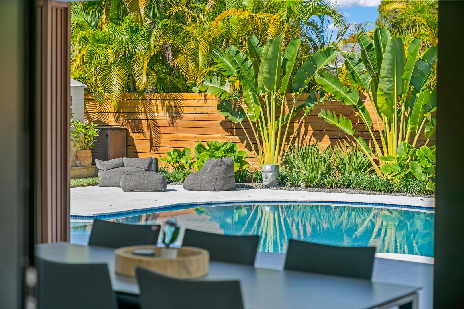 The open floor plan offers spacious living areas, a large family room, and an oversized primary suite. The covered patio overlooks the sparkling pool and landscaped yard, perfect for entertaining or relaxing.