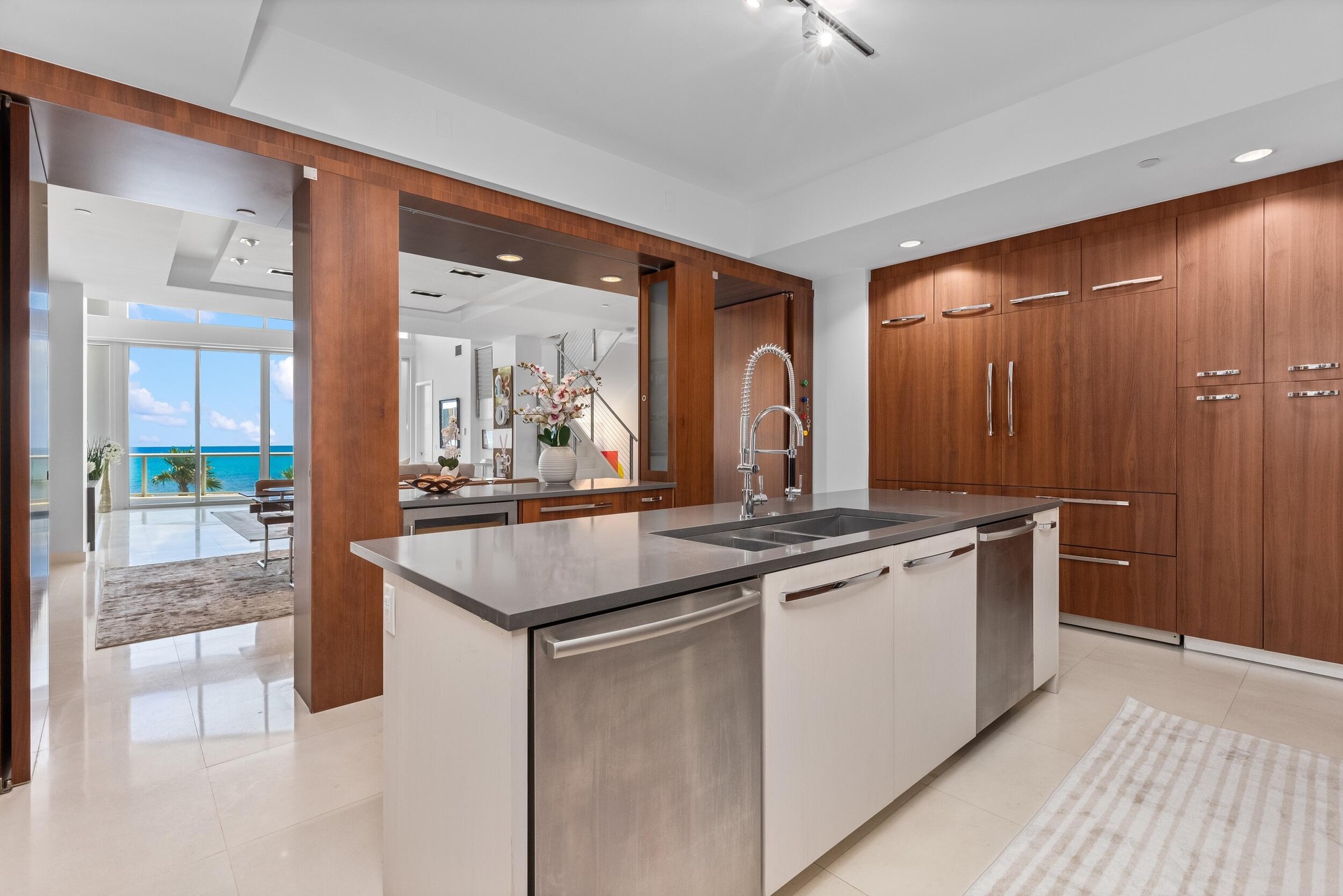 Set within the prestigious One Thousand Ocean, Beach Villa 103 is a true generational offering—an irreplaceable, two-level condominium whose rarity and distinction place it in a class of its own, unmatched both within the building and along the entirety of Boca Raton's oceanfront. As you step inside, you're greeted by dramatic ceiling heights and an infusion of natural light that flows effortlessly throughout the home, accentuating its sleek, modern aesthetic and amplifying the spacious ambiance. Thoughtfully designed with a seamless, open-concept layout and desirable southeast oceanfront orientation, this singular property captures expansive, tranquil views of the Boca Raton inlet and the Atlantic Ocean, offering a daily display of natural beauty that defines elevated coastal living. Spanning two levels, the home features four spacious bedrooms, complemented by six full baths and a powder room, each appointed with sophisticated finishes, as well as a full den which can be easily converted to a 5th bedroom. A unique private in-residence elevator serves both levels of the home and offers direct access to the garage, ensuring unparalleled privacy and effortless convenience. Four bedrooms are oceanfront private retreats, filled with light and designed to maximize comfort while showcasing the surrounding scenery. At the core of the home is the designer kitchen, where high-performance appliances, custom cabinetry, and streamlined details converge. From here, the kitchen flows seamlessly into the dining and family areas, creating a harmonious setting equally suited for sophisticated entertaining or the effortless enjoyment of everyday life.