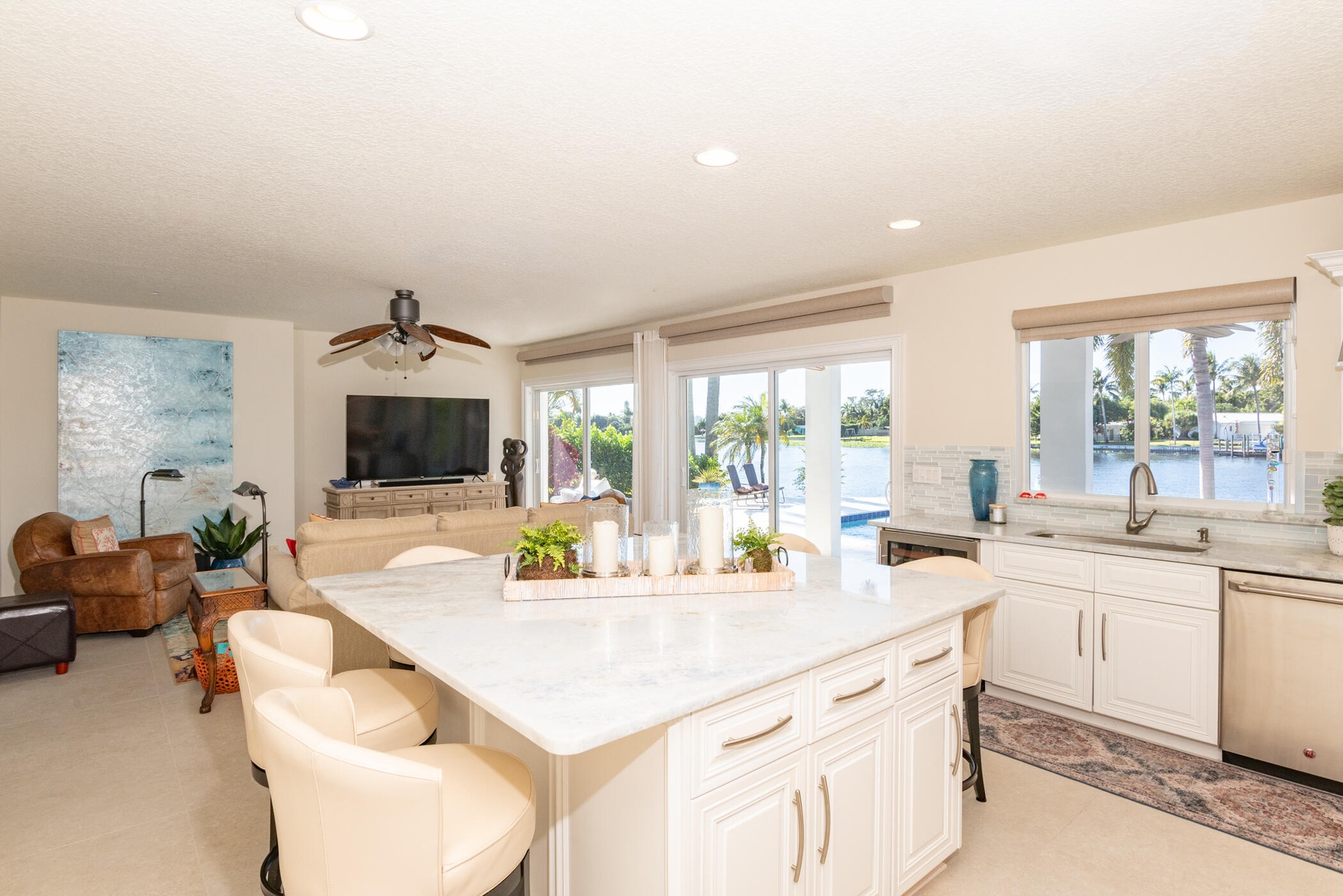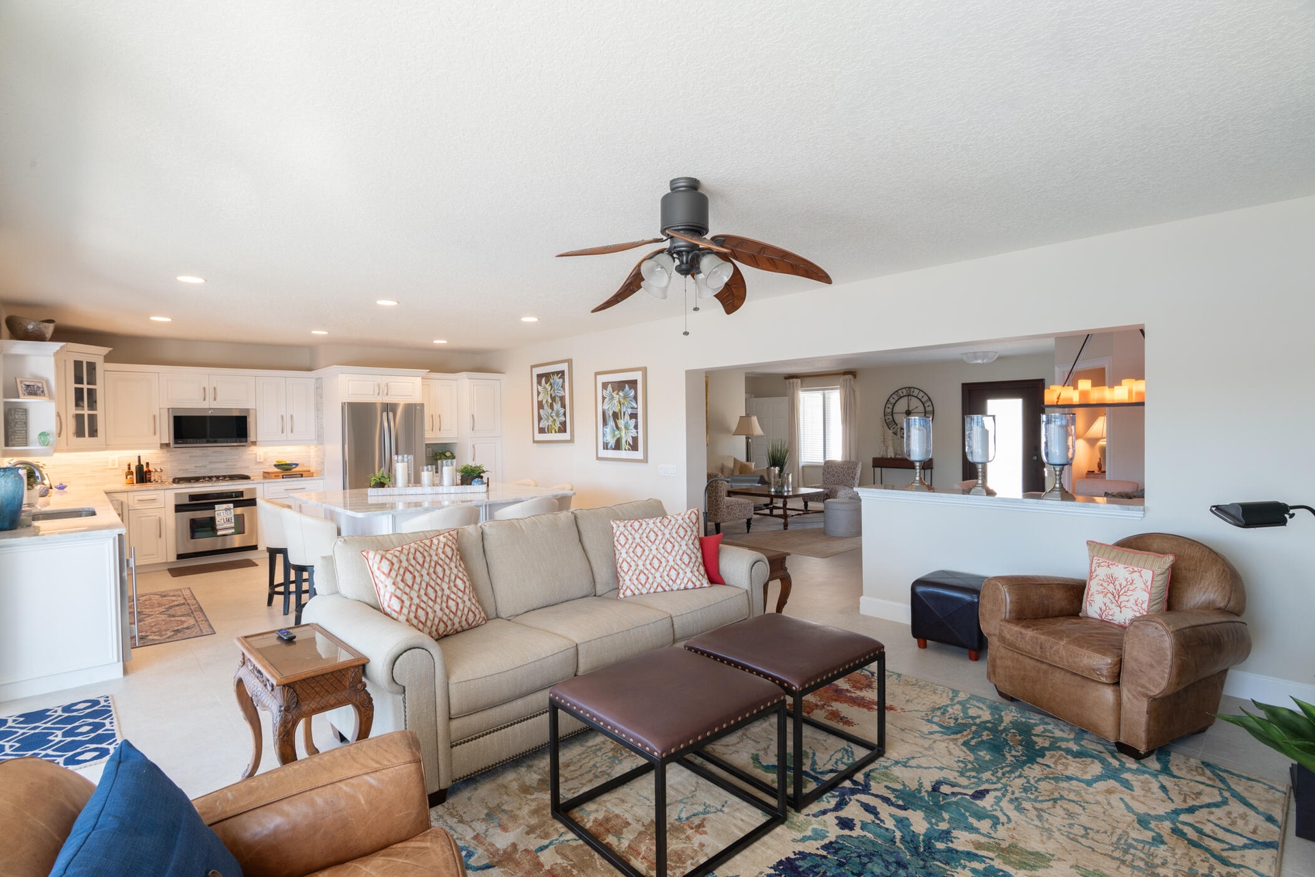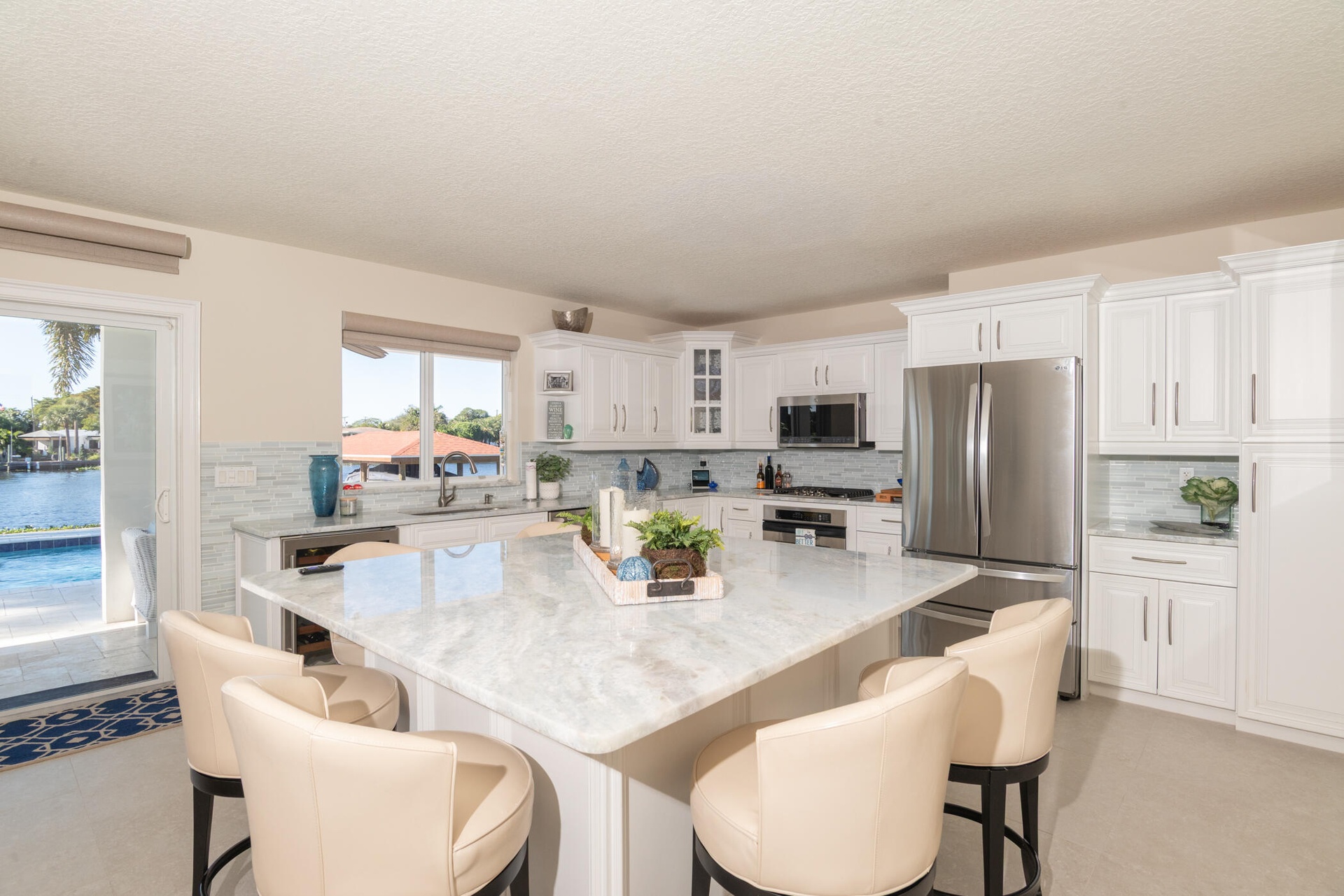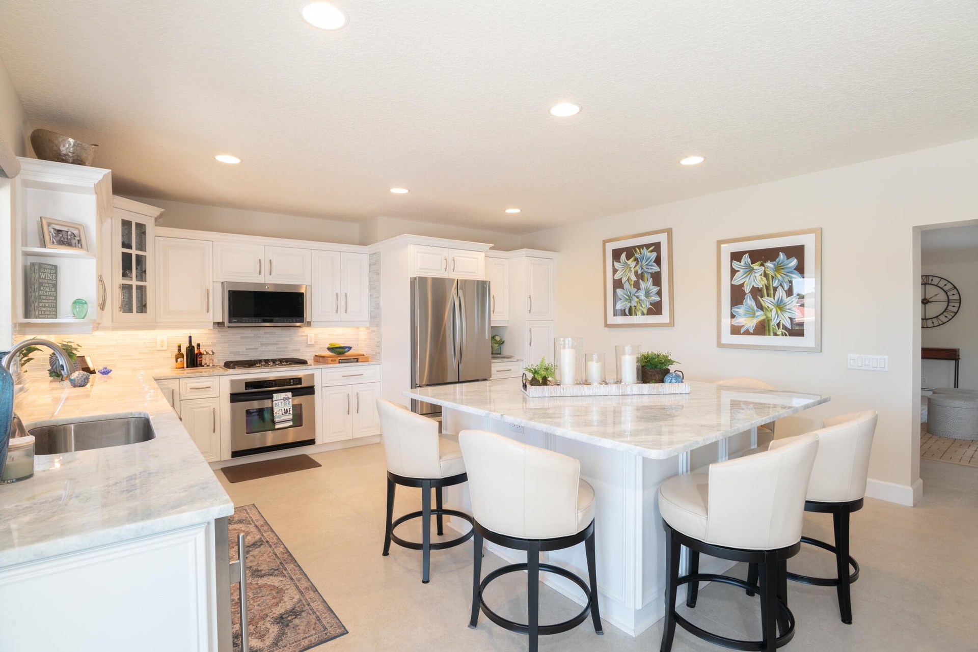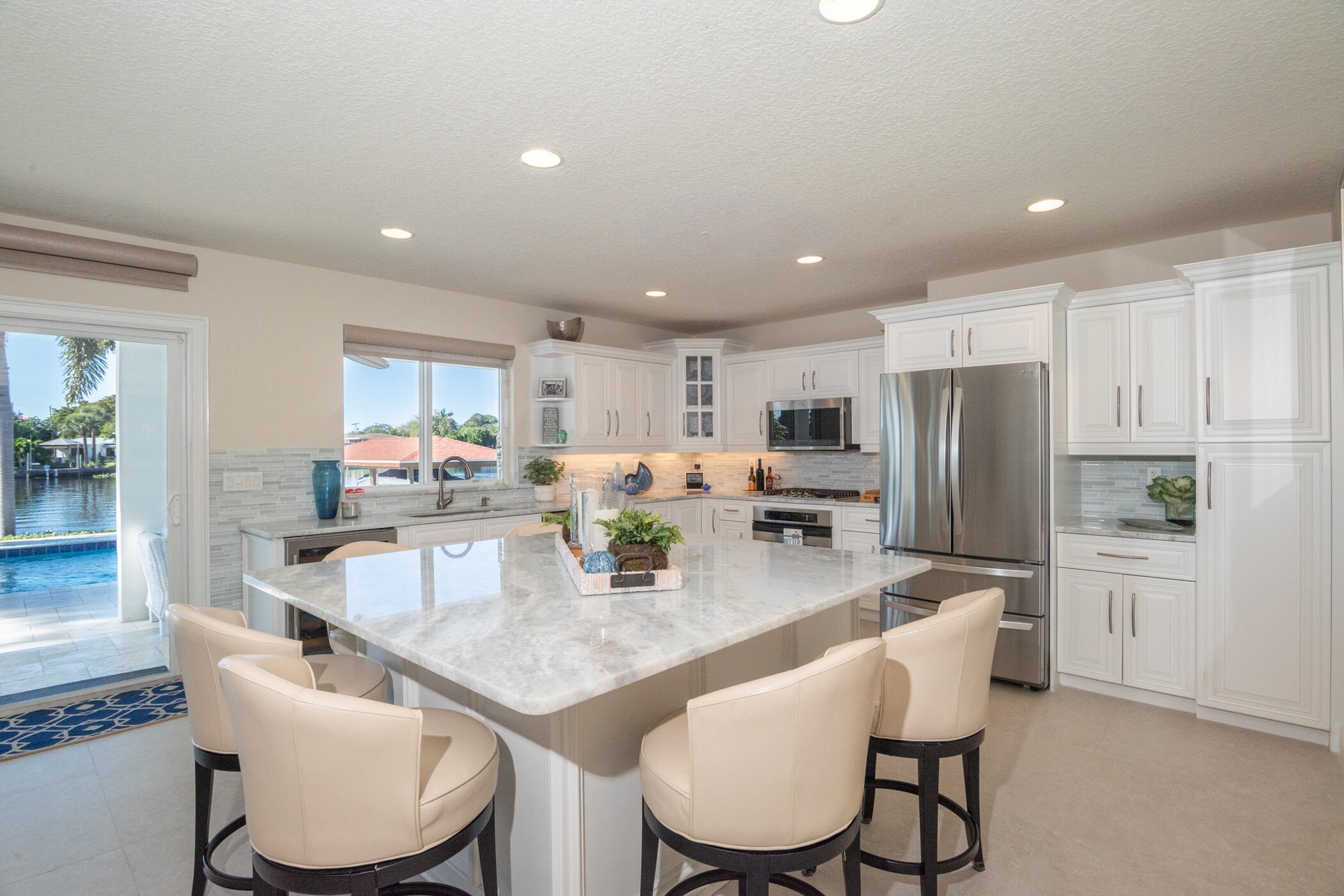 The modern kitchen, remodeled in 2016, is exceptionally large and features quartzite countertops, stainless steel appliances, and ample storage perfect for cooking and entertaining.