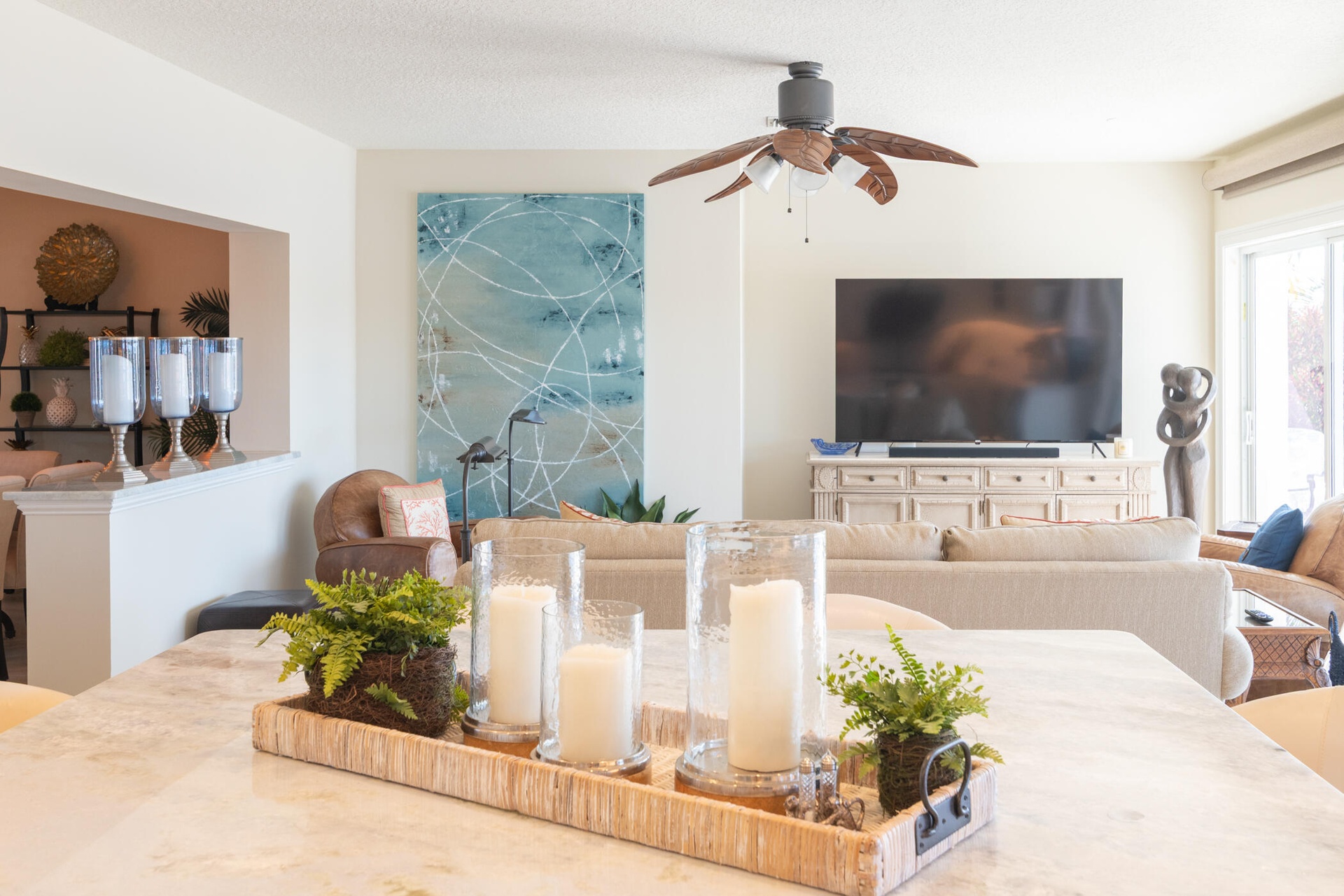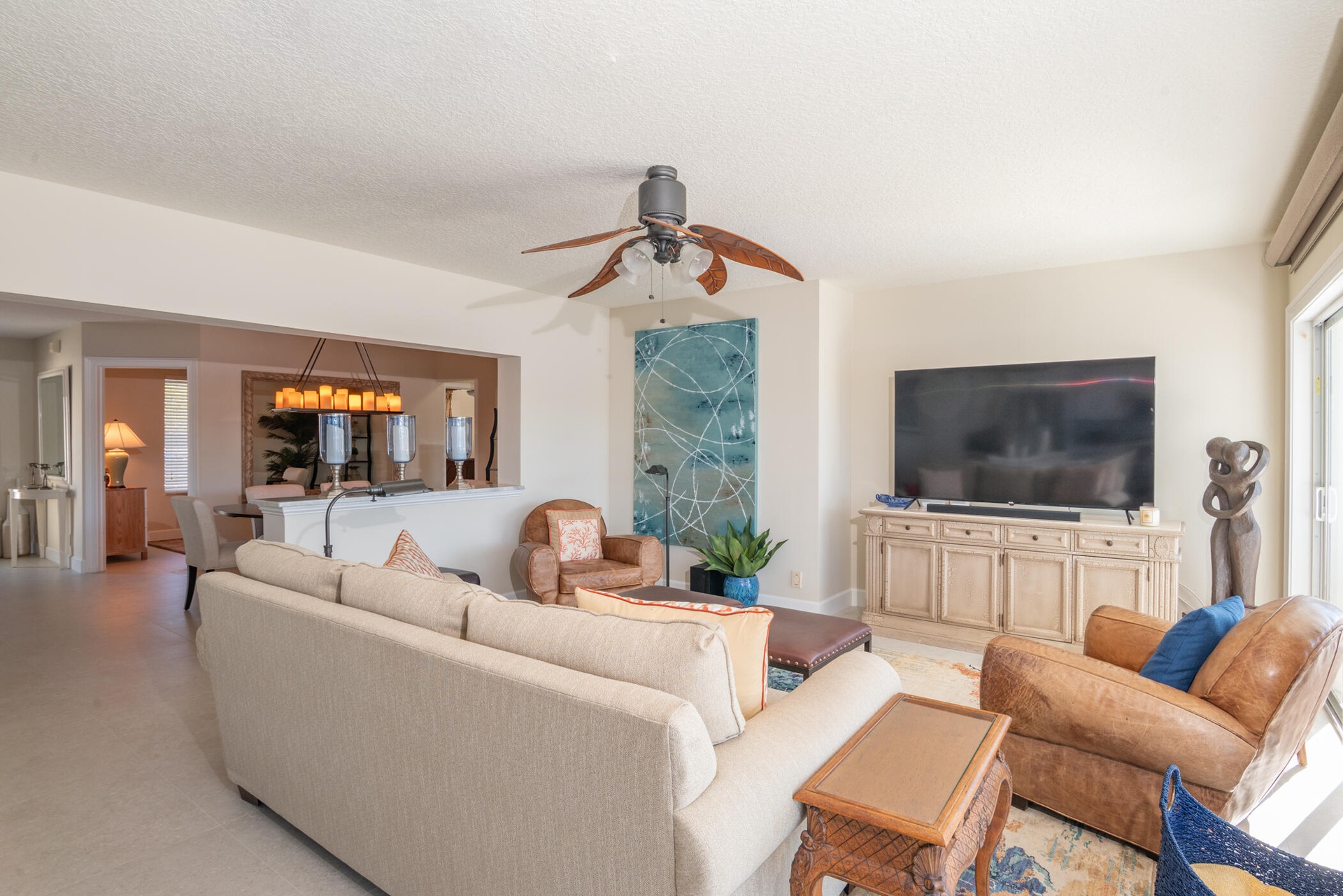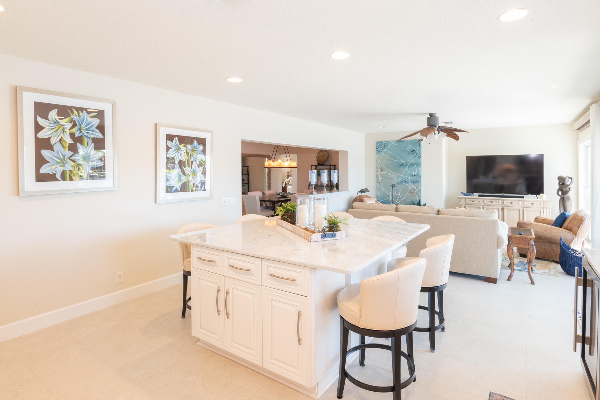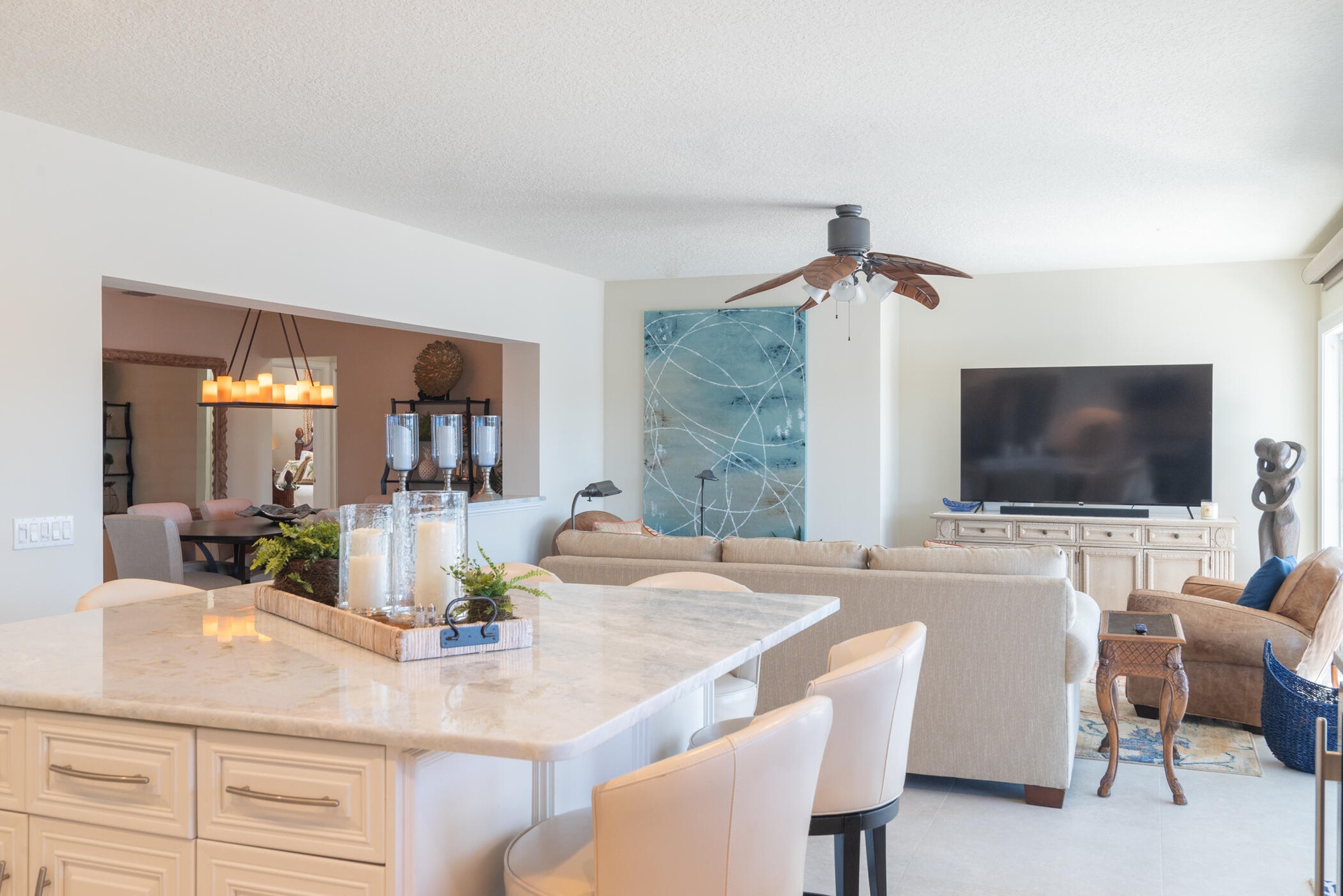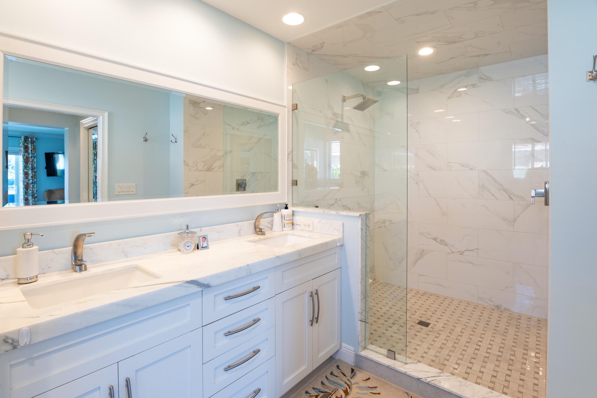 The modern kitchen, remodeled in 2016, is exceptionally large and features quartzite countertops, stainless steel appliances, and ample storage perfect for cooking and entertaining.