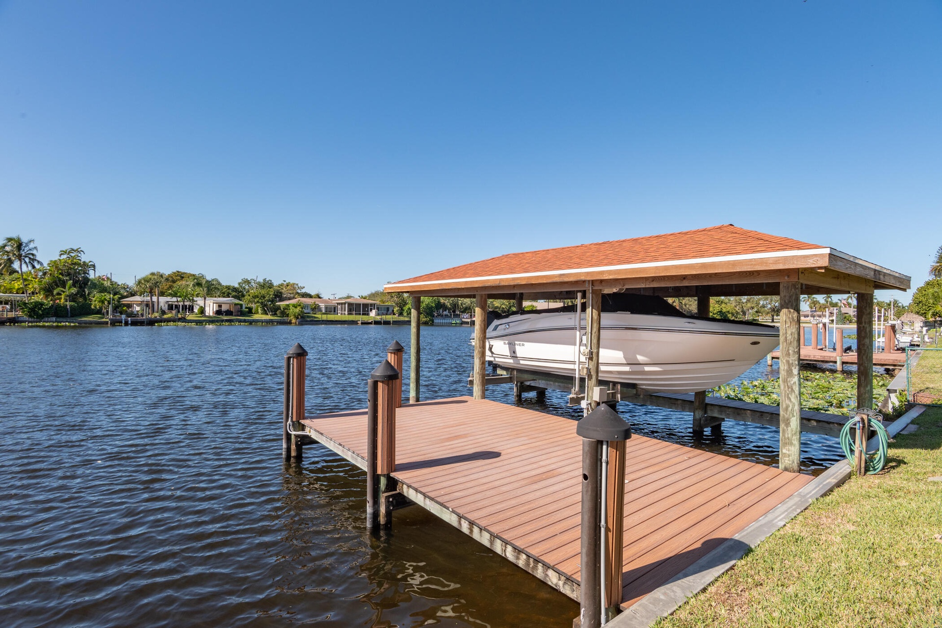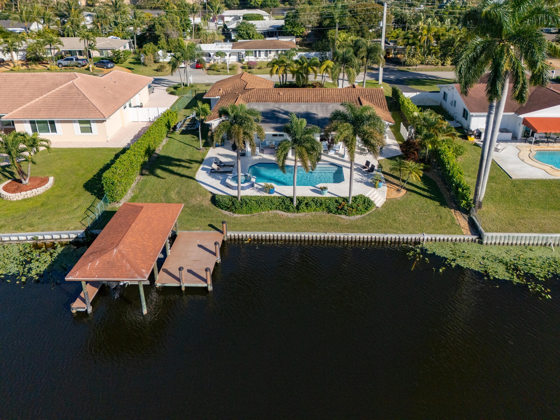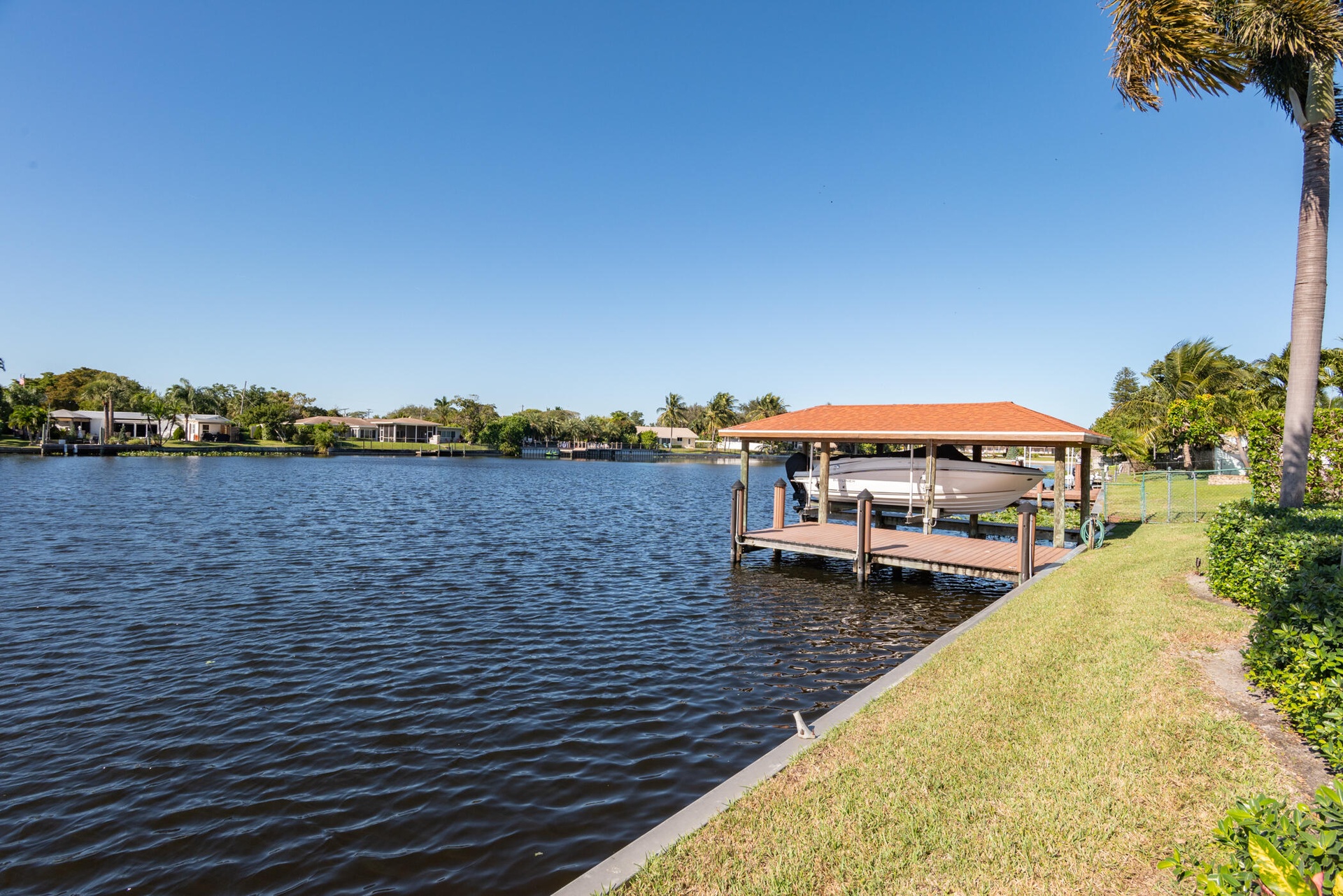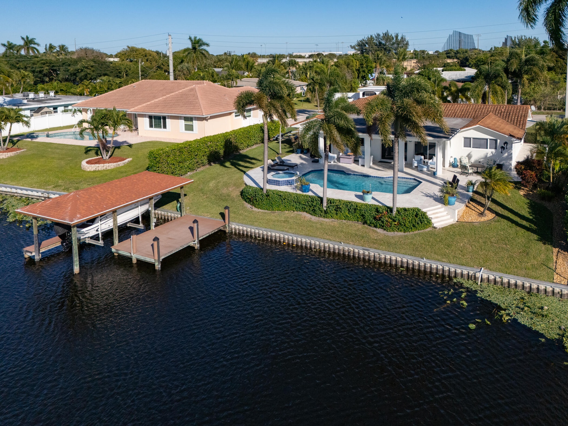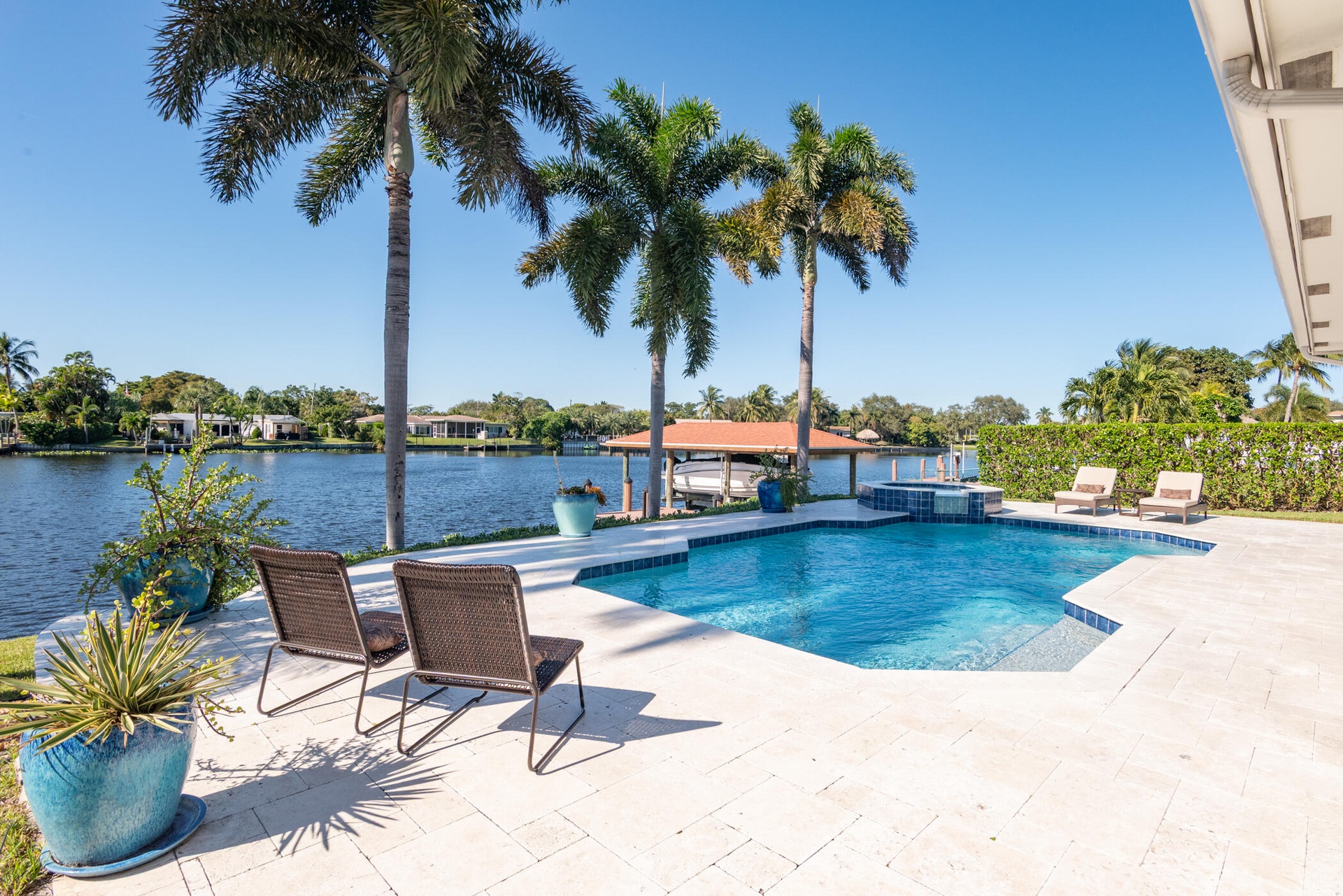 Enjoy true Florida waterfront living with a Enjoy true Florida waterfront living with a heated pool, Hot Tub, stone pool deck, and private dock complete with boathouse and lift. Major upgrades include a new A/C (2021), water heater (2022), pool pump (2024), and boathouse (2017).