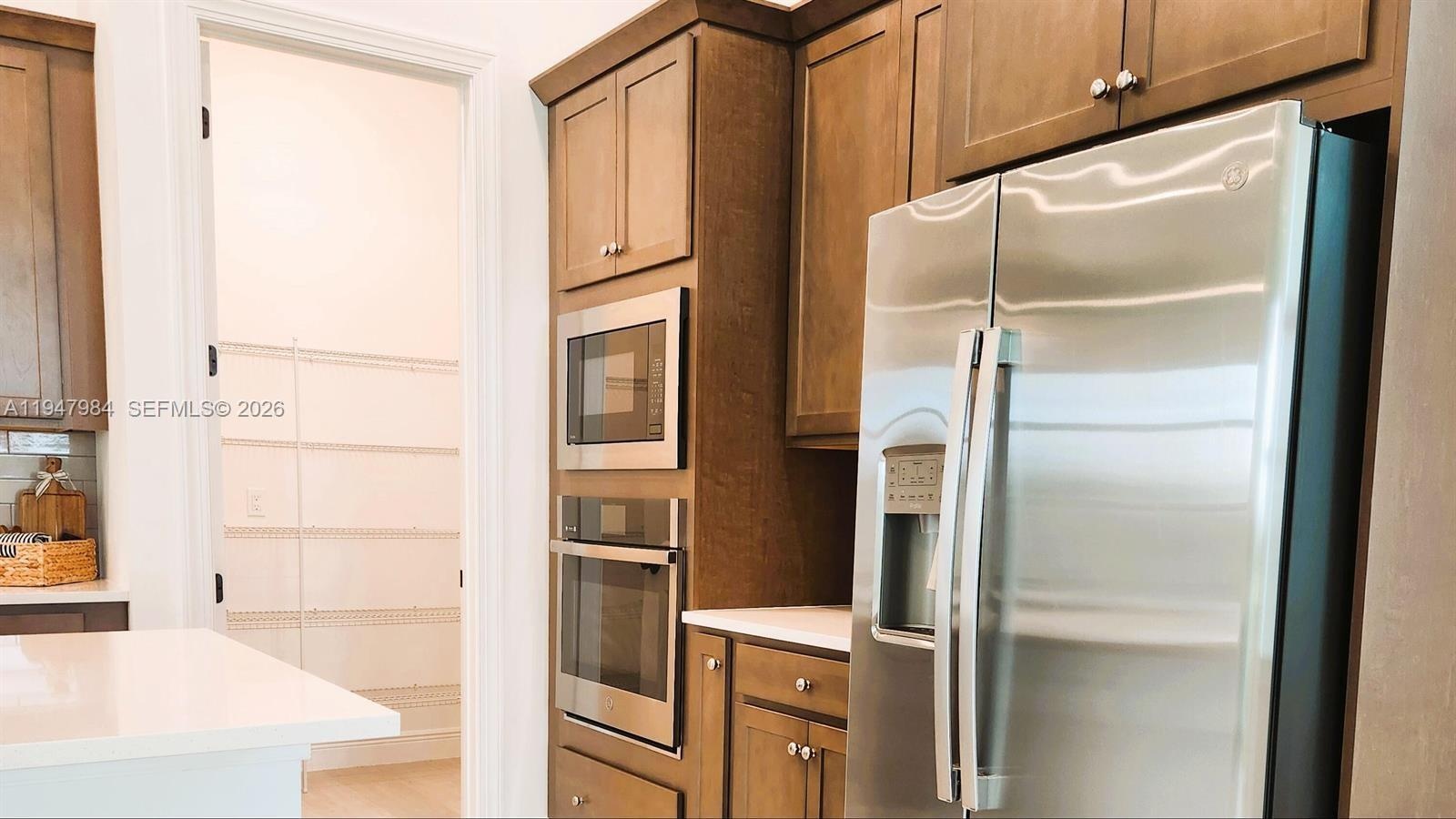 The chef’s kitchen showcases White Ice quartz countertops, GE Profile appliances, a single-bowl undermount granite sink, 42" soft-close cabinets with crown molding, and built-in drawer organizers.