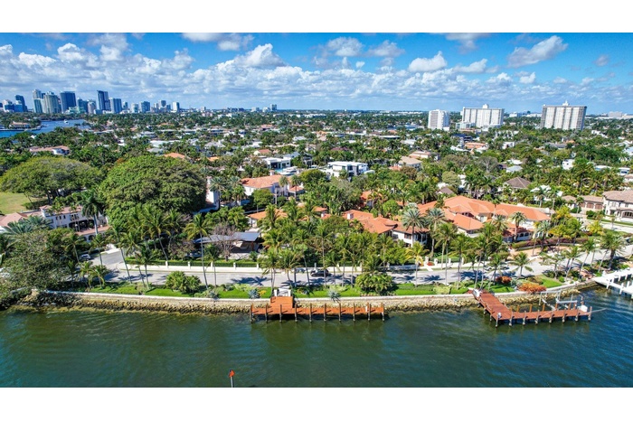 Magnificent two-parcel .82 acre Idlewyld waterfront estate with over 14,000 sf in total. Ultimate deep water compound! 338ft+/- straight-line waterfront (no wake) with two docks. Main house 6,336 sf under air with 2,050 sf covered outdoor living off Chef’s kitchen, fully renovated and expanded in 2012 with option for apartment over garage. In 2018, guest house with pool pavilion added, 1,330 sf under air plus 2,504 sf terraces with dining bar for 18, caterer’s kitchen, cabana, gym, and office. Estate includes 2,029 sf of air-conditioned garage space for seven cars. Walled and gated for privacy, award-winning grounds and rare tropical landscaping surround two pools and spa. Timeless Marc Michaels design with custom detailing and high-quality finishes throughout. Most desirable & extremely private South end of Idlewyld Drive. Estate is entirely walled & gated, creating a Four Seasons type environment that must be seen to be appreciated! Main House 815 Idlewyld Certificate of Occupancy with 2012 renovation which included entire Primary Suite with separate baths & closets, plus large private balcony intracoastal facing. 2012 new roof over entire main residence & all air conditioners replaced in last 12 months. First Level: formal living room with gas fireplace & covered front terrace overlooking the intracoastal. Separate bar area with 1,000-gallon saltwater live aquarium. Back-lit custom onyx bar, ice maker, refrigeration & storage. Overlooks the totally private courtyard pool (one of two pools).Elegant & welcoming formal dining room (access to pool area), custom wine refrigeration & storage. First level bedroom suite 1, library/home office (potentially bedroom suite 2)Cabana bathroom off the 2,000 sf covered outdoor living area/terrace with Summer Kitchen, grill & refrigeration, cabana bathroom & outdoor shower. Easy access to garage for caterers. 4 bay garage includes 1 lift. Potential apartment over garage for housekeeper or boat captain. Totally private & heated court yard pool with spa. Second level comprises loft area, primary suite, club room & bedroom 5 suite. Club room (potential VIP bedroom suite 4) with acoustic soundproofing built-in, including large projection theater with automatic/motorized black out shades & private balcony. Bathroom with sauna - potential to be a VIP bedroom suite & included in bedroom count. Expansive & ultra-luxurious primary suite offers private intracoastal facing balcony, separate spa style baths and custom closets/dressing rooms.833 Guest House & Pool Pavilion - Award Winning Architectural & Landscape Design Incredible intracoastal views while still enjoying privacy! Professional landscape lighting, outdoor speakers & fountains. Connected by wide open lawn areas & surrounded by tropical landscaping. Covered area includes water feature & secondary splash pool/spa. Stunning bar seats 18 with refrigerator, sink & storage.. Dining loggia with seating for 14, all covered with beautiful, beamed ceilings to create a tropical & private resort oasis. Large separate BBQ area separate to bar. The Guest House offers a full caterer's kitchen, cabana bath & access to the additional 3 car garage (potential 7 car when garages are combined). Stair access to second level of Guest House, terrace opens to gym and home office, both with amazing views. Spa style bathroom. Potential for additional bedrooms if required. DOCKS - Two separate docks, 70' & 90' both with 100amp/2 x 50 amp service 17,000 lb boat lift. Please note approximate measurements obtained from the builder & should be verified by the buyer for accuracy.