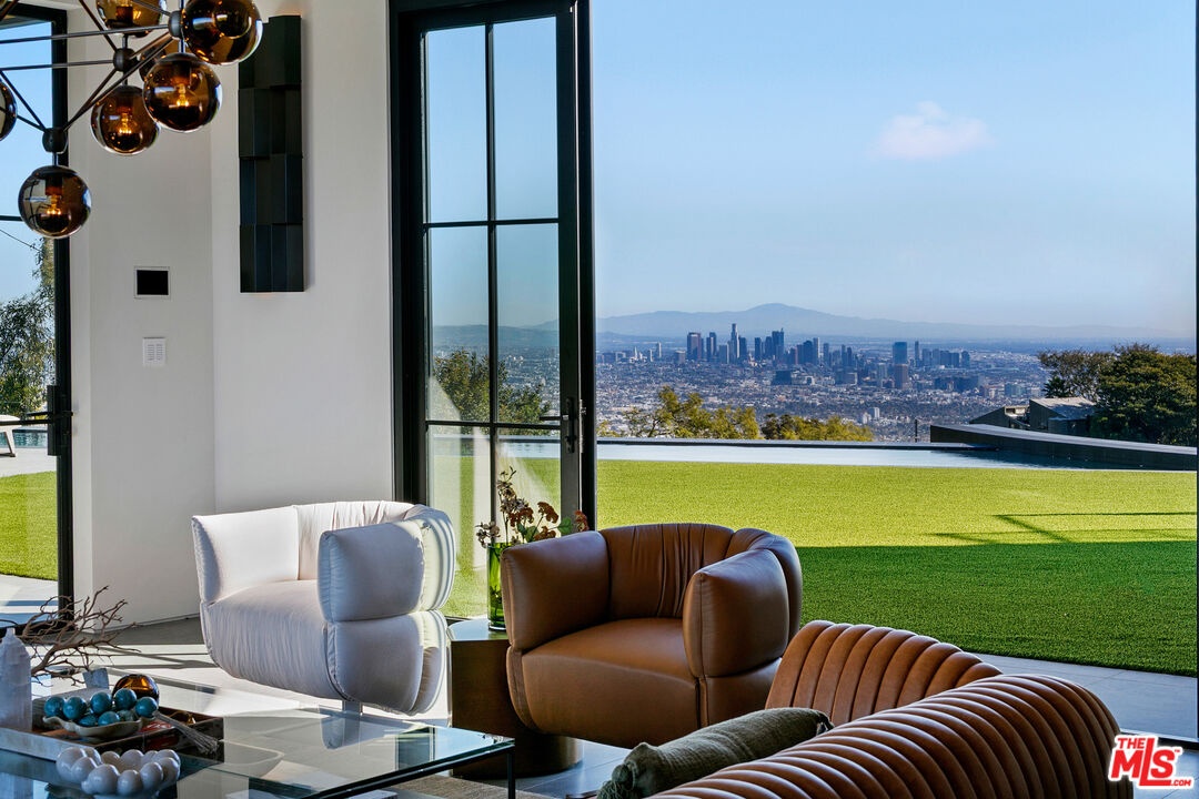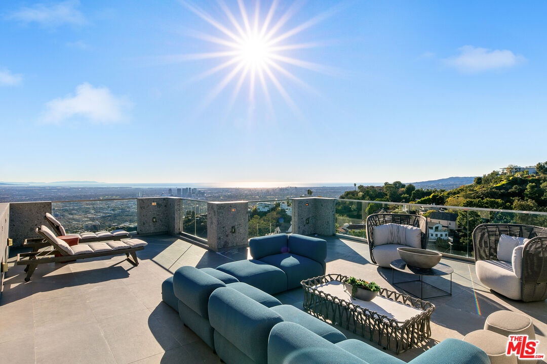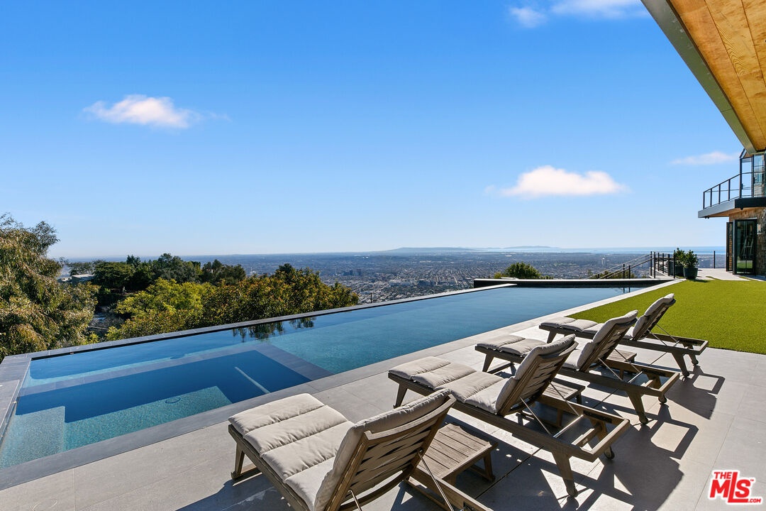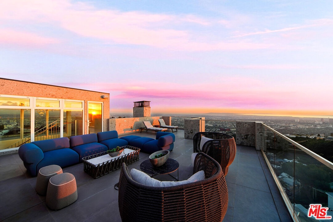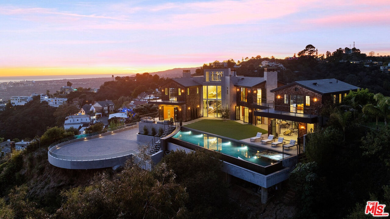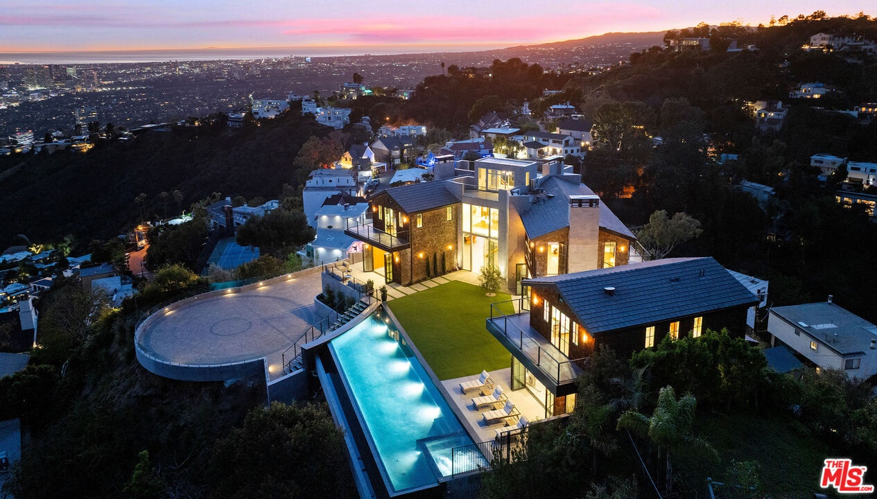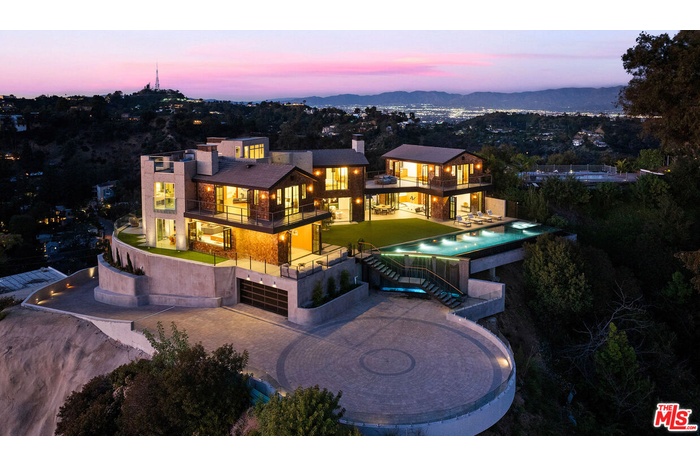 Welcome to The Apex. Perched above the city, this truly one of a kind estate is a statement of vision and refined luxury. Furnished and designed to impress at every turn, the approximately 7,500 square foot compound commands sweeping, unobstructed 360 degree views of the city lights, ocean horizon, and serene canyon vistas creating a constant connection to the landscape and a setting that feels cinematic, private and endlessly inspiring.The main residence features four bedrooms and five baths, where architecture and artistry converge. Custom finishes, museum quality lighting and a thoughtfully curated collection of designer furnishings create interiors that feel elevated, confident and effortlessly livable. Multiple fireplaces anchor the living and outdoor spaces, while expansive walls of glass dissolve the boundary between indoors and out. The living room seamlessly converts into an intimate cinematic experience with a concealed drop down theater, while an elegant yet sultry den opens directly to the outdoors, creating a natural flow for entertaining and everyday living. The primary suite with fireplace and balcony is a true sanctuary highlighted by an all-glass bathroom suite bathed in natural light. The shower is like a fine painting come to life, immersive and sculptural, surrounded by sky, horizon and shifting light. Each additional ensuite bedroom is generously proportioned, offering privacy, impeccable design and endless views.A separate guest house enhances the estate's versatility and appeal. Designed across two levels, each with its own kitchen and bath, it is currently configured as a gym and lounge, yet can easily serve as additional bedrooms. Ideal for extended guests, multigenerational living, staff accommodations or private entertaining, it maintains complete independence from the main residence.The outdoor experience rivals that of a world class resort, including waterfall entry leading to a rare flat grassy yard, an exceptional find in the hills, especially when paired with panoramic views and privacy. Beyond the lawn, the property unfolds into multiple outdoor living environments including a striking pool and spa, cold plunge, outdoor fireplace, fire pit, BBQ area, wraparound balconies and sexy roof top lounge with fireplace. Every space is designed to capture the scenery as it transitions beautifully from sunrise to glowing city lights at night. A private gated driveway with parking for up to 10 vehicles and garage with elevator to main level further underscores the rarity of this offering. Finding a hillside estate with this level of flat usable land, parking and unobstructed views is extraordinarily uncommon. This is not simply a home, but an architectural experience designed for a discerning luxury clientele seeking something iconic, bold and impossible to replicate.