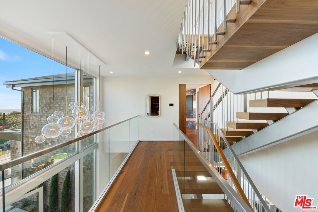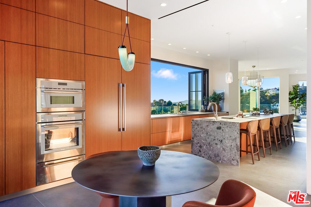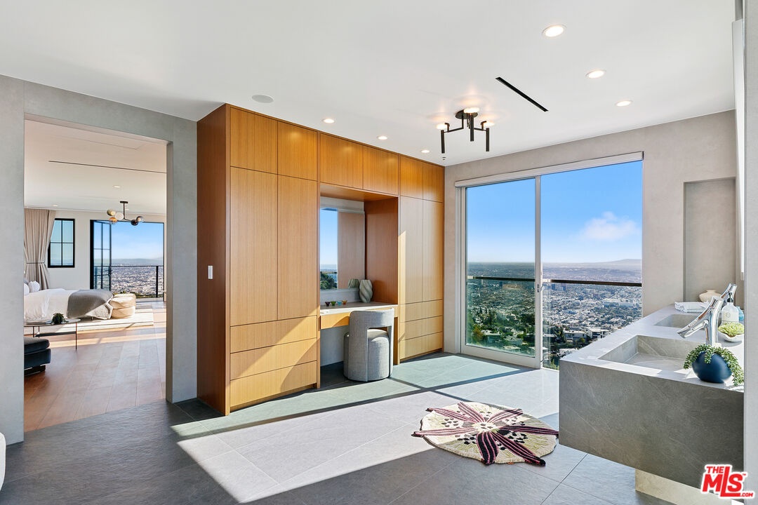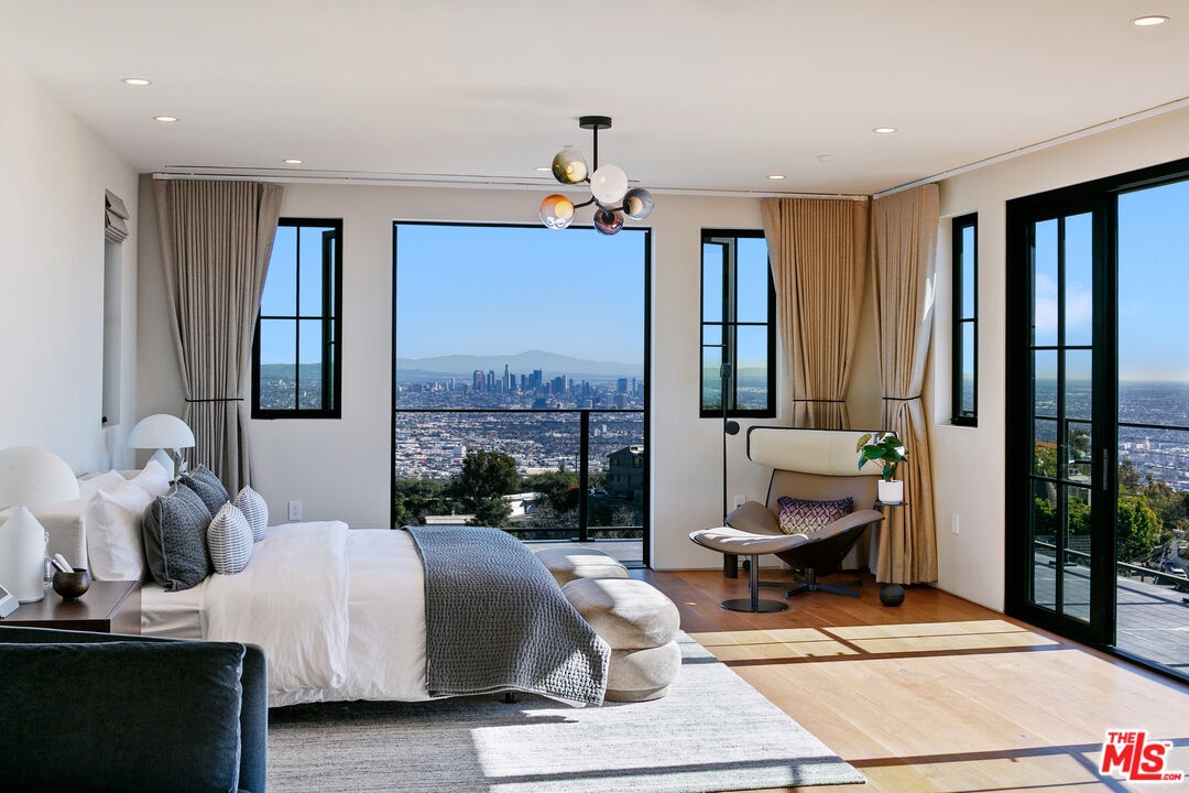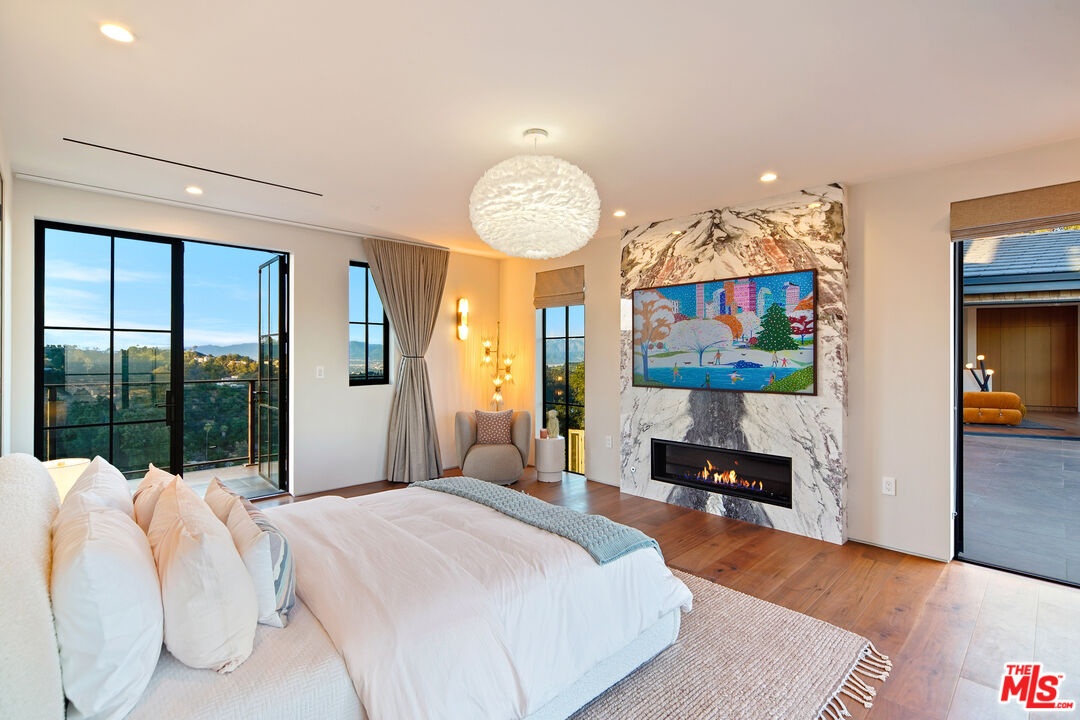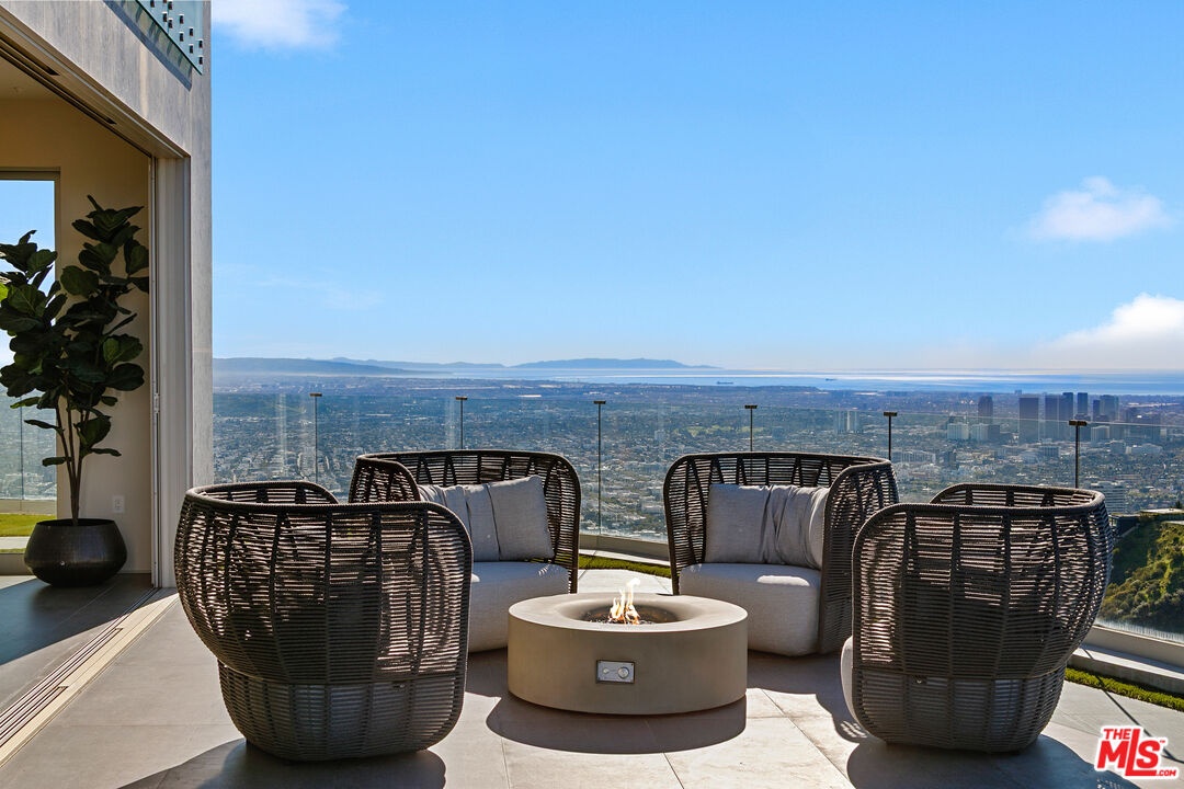 Welcome to The Apex. Perched above the city, this truly one of a kind estate is a statement of vision and refined luxury. Furnished and designed to impress at every turn, the approximately 7,500 square foot compound commands sweeping, unobstructed 360 degree views of the city lights, ocean horizon, and serene canyon vistas creating a constant connection to the landscape and a setting that feels cinematic, private and endlessly inspiring.The main residence features four bedrooms and five baths, where architecture and artistry converge. Custom finishes, museum quality lighting and a thoughtfully curated collection of designer furnishings create interiors that feel elevated, confident and effortlessly livable. Multiple fireplaces anchor the living and outdoor spaces, while expansive walls of glass dissolve the boundary between indoors and out. The living room seamlessly converts into an intimate cinematic experience with a concealed drop down theater, while an elegant yet sultry den opens directly to the outdoors, creating a natural flow for entertaining and everyday living. The primary suite with fireplace and balcony is a true sanctuary highlighted by an all-glass bathroom suite bathed in natural light. The shower is like a fine painting come to life, immersive and sculptural, surrounded by sky, horizon and shifting light. Each additional ensuite bedroom is generously proportioned, offering privacy, impeccable design and endless views.A separate guest house enhances the estate's versatility and appeal. Designed across two levels, each with its own kitchen and bath, it is currently configured as a gym and lounge, yet can easily serve as additional bedrooms. Ideal for extended guests, multigenerational living, staff accommodations or private entertaining, it maintains complete independence from the main residence.The outdoor experience rivals that of a world class resort, including waterfall entry leading to a rare flat grassy yard, an exceptional find in the hills, especially when paired with panoramic views and privacy. Beyond the lawn, the property unfolds into multiple outdoor living environments including a striking pool and spa, cold plunge, outdoor fireplace, fire pit, BBQ area, wraparound balconies and sexy roof top lounge with fireplace. Every space is designed to capture the scenery as it transitions beautifully from sunrise to glowing city lights at night. A private gated driveway with parking for up to 10 vehicles and garage with elevator to main level further underscores the rarity of this offering. Finding a hillside estate with this level of flat usable land, parking and unobstructed views is extraordinarily uncommon. This is not simply a home, but an architectural experience designed for a discerning luxury clientele seeking something iconic, bold and impossible to replicate.