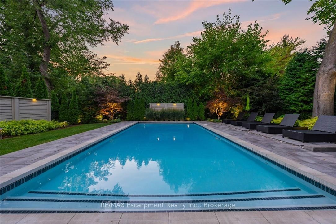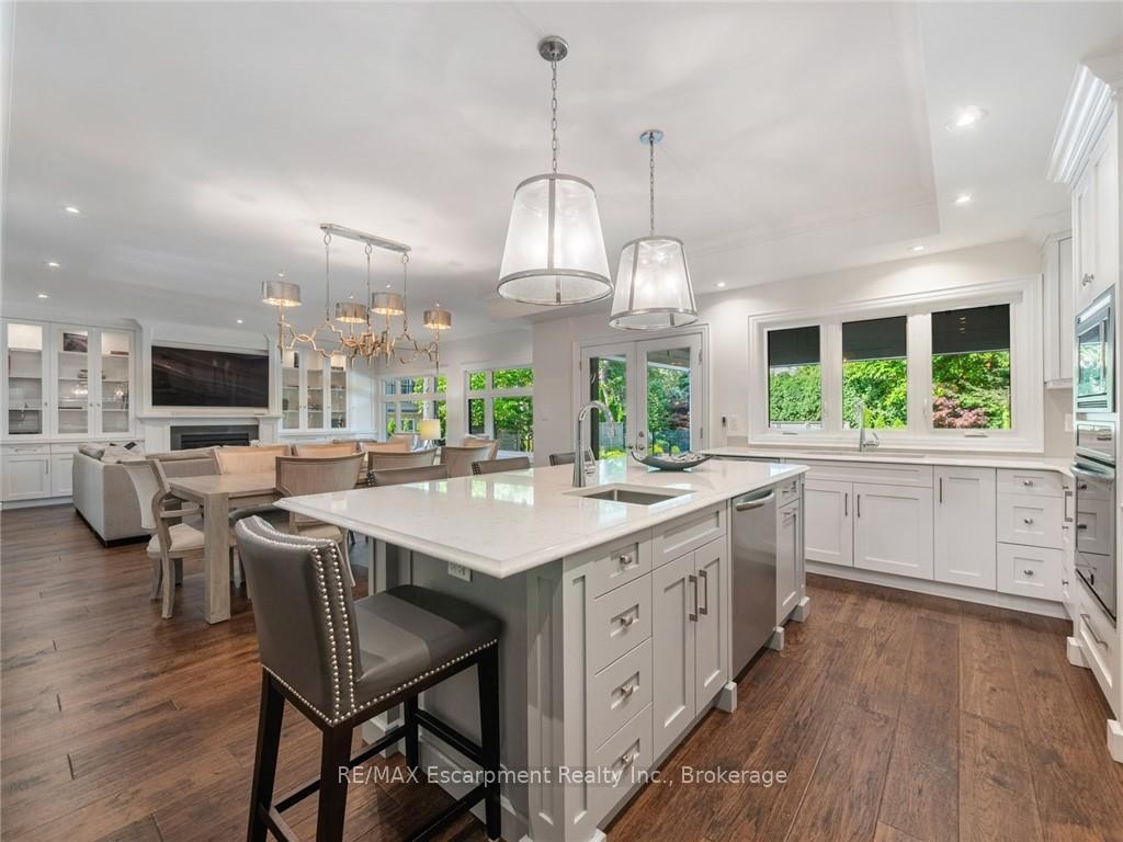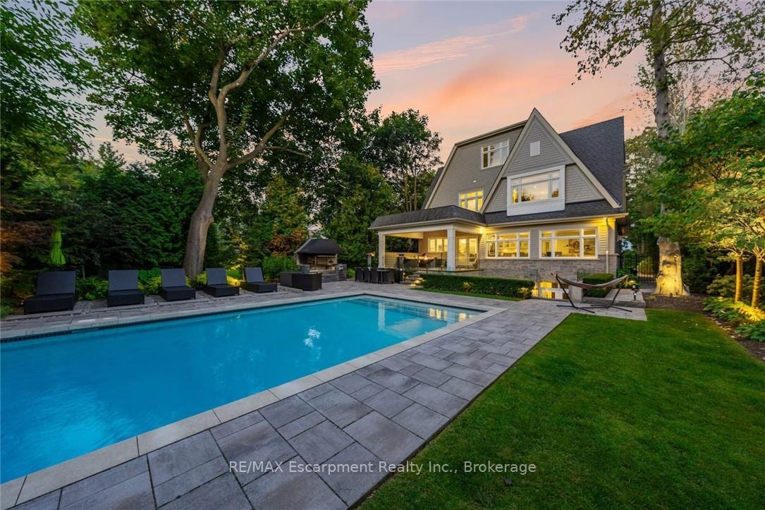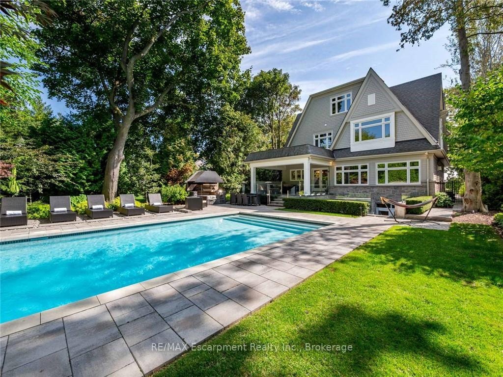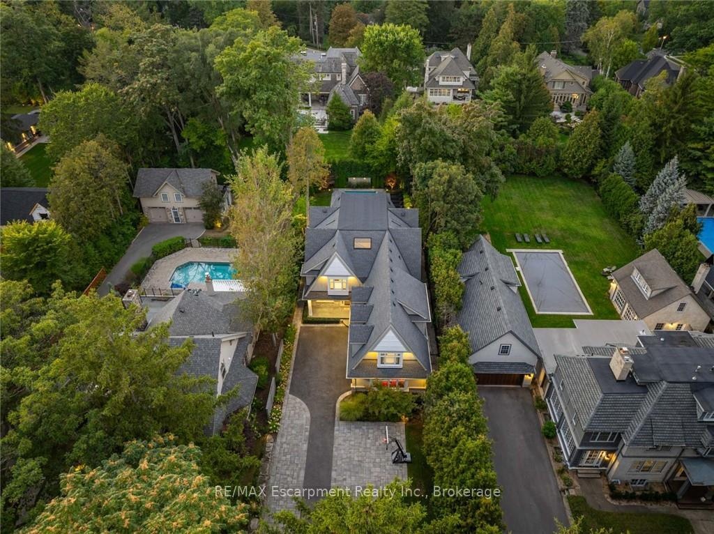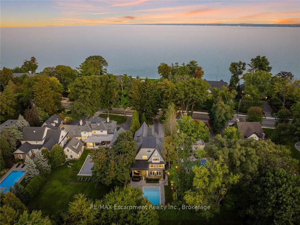 Set on prestigious Lakeshore Road in Roseland one of Burlington's most sought-after neighbourhoods this custom-built residence offers over 6,000 square feet of finely finished living space on a rare217-ft-deep property. Located within the Tuck/ Nelson school district, just steps from the lake, it combines an exceptional address with remarkable scale and design. The main level is anchored by an elegant great room with a gas fireplace, custom built-ins with glass accents & expansive windows overlooking the rear gardens. A private home office, formal dining area with a wet bar, & a chef's kitchen designed for both daily living & entertaining set the tone for the home. The kitchen features a large quartz island with seating, dual dishwashers, dual Frigidaire Professional wall ovens, a gas range with decorative hood, warming drawer, microwave, & a KitchenAid stainless steel refrigerator with ice & water. Custom soft-close cabinetry, a walk-in pantry, & a walkout to the covered patio complete this well-appointed space. A separate main floor laundry room with custom cabinetry, quartz counters & washer/ dryer adds convenience. Upstairs, four bedrooms each feature their own private ensuite baths & custom closet organizers, including a self-contained in-law suite with a separate entrance featuring a living area, bedroom, and full bath, ideal for extended family or guests. The third-floor loft, currently used as a gym, offers flexibility as an additional bedroom or creative studio. The fully finished lower level extends the living space with a large recreation room with a wet bar, sitting area with gas fireplace, sixth bedroom with ensuite, music/media room,& a walk-up to the backyard. Set on a 200-foot-deep lot, the property offers rare privacy& scale, with a resort-style backyard featuring a heated saltwater pool, stone patio, covered terrace, &outdoor kitchen. A three-car garage & additional parking complete this home, just minutes from downtown Burlington & the lake.