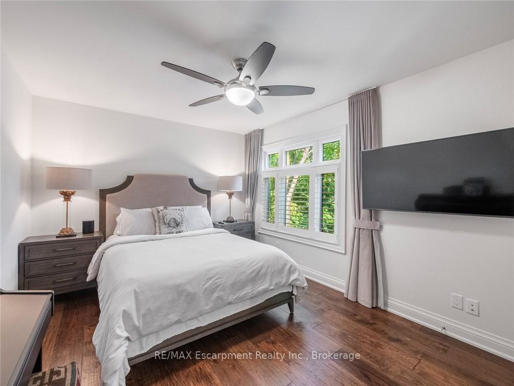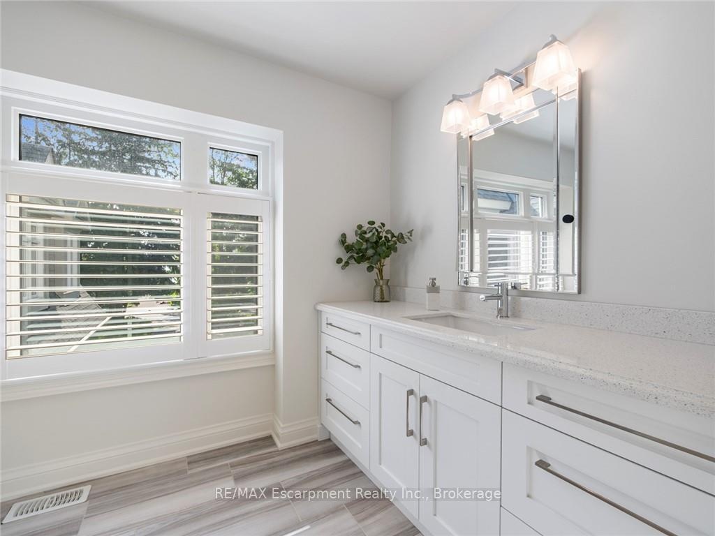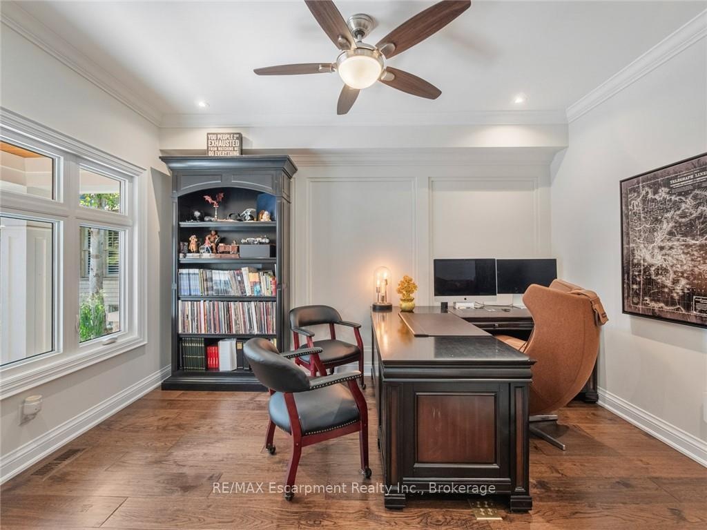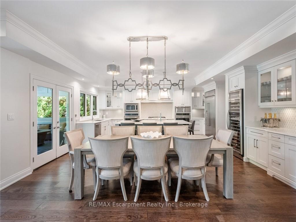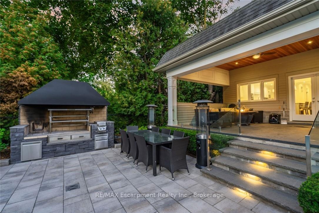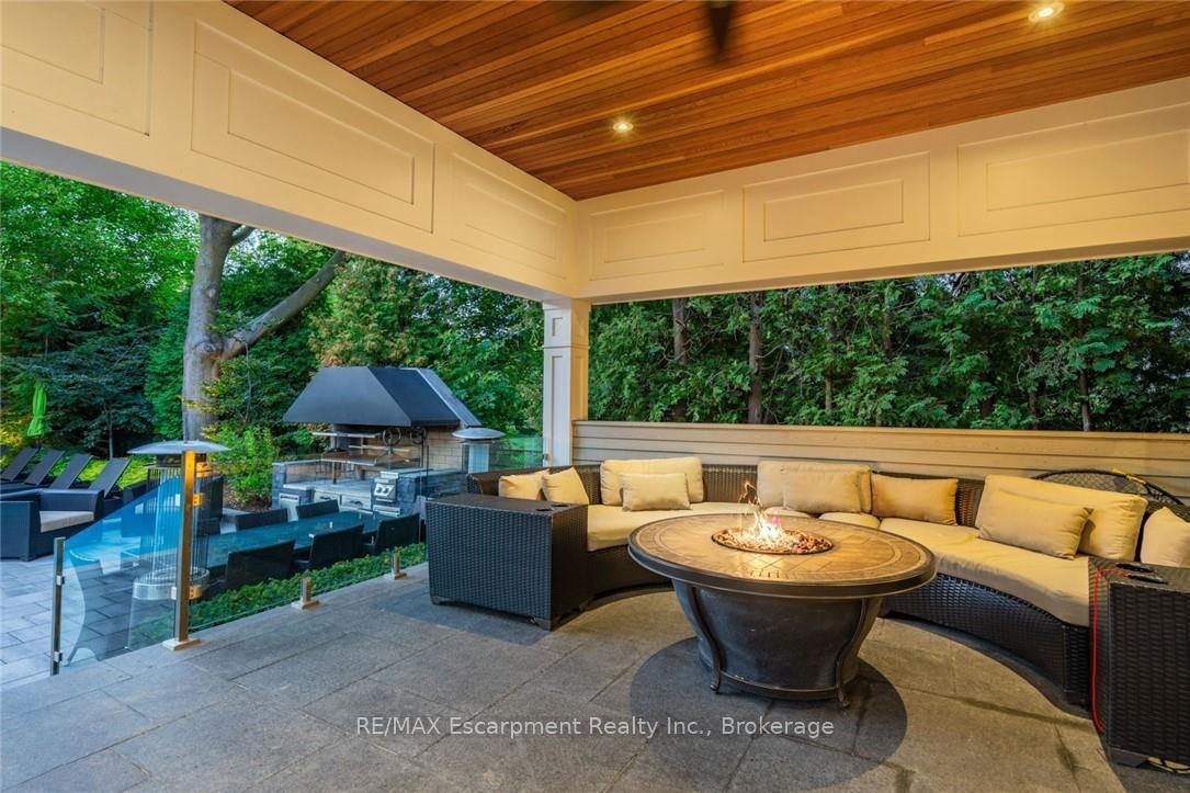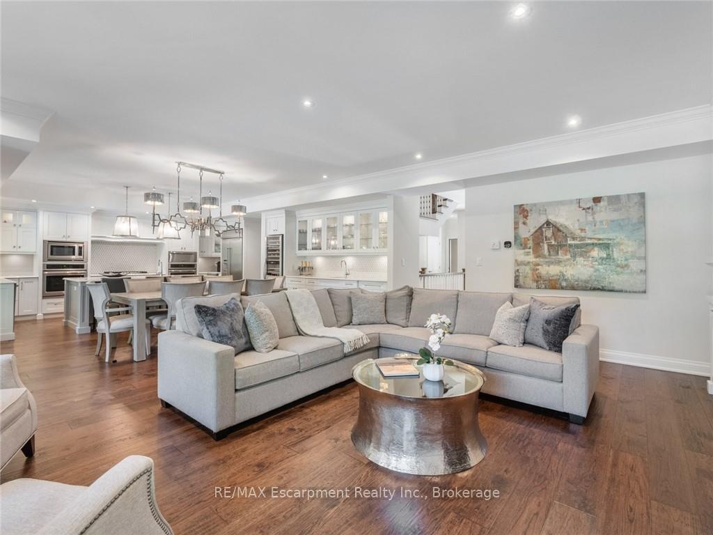 Set on prestigious Lakeshore Road in Roseland one of Burlington's most sought-after neighbourhoods this custom-built residence offers over 6,000 square feet of finely finished living space on a rare217-ft-deep property. Located within the Tuck/ Nelson school district, just steps from the lake, it combines an exceptional address with remarkable scale and design. The main level is anchored by an elegant great room with a gas fireplace, custom built-ins with glass accents & expansive windows overlooking the rear gardens. A private home office, formal dining area with a wet bar, & a chef's kitchen designed for both daily living & entertaining set the tone for the home. The kitchen features a large quartz island with seating, dual dishwashers, dual Frigidaire Professional wall ovens, a gas range with decorative hood, warming drawer, microwave, & a KitchenAid stainless steel refrigerator with ice & water. Custom soft-close cabinetry, a walk-in pantry, & a walkout to the covered patio complete this well-appointed space. A separate main floor laundry room with custom cabinetry, quartz counters & washer/ dryer adds convenience. Upstairs, four bedrooms each feature their own private ensuite baths & custom closet organizers, including a self-contained in-law suite with a separate entrance featuring a living area, bedroom, and full bath, ideal for extended family or guests. The third-floor loft, currently used as a gym, offers flexibility as an additional bedroom or creative studio. The fully finished lower level extends the living space with a large recreation room with a wet bar, sitting area with gas fireplace, sixth bedroom with ensuite, music/media room,& a walk-up to the backyard. Set on a 200-foot-deep lot, the property offers rare privacy& scale, with a resort-style backyard featuring a heated saltwater pool, stone patio, covered terrace, &outdoor kitchen. A three-car garage & additional parking complete this home, just minutes from downtown Burlington & the lake.