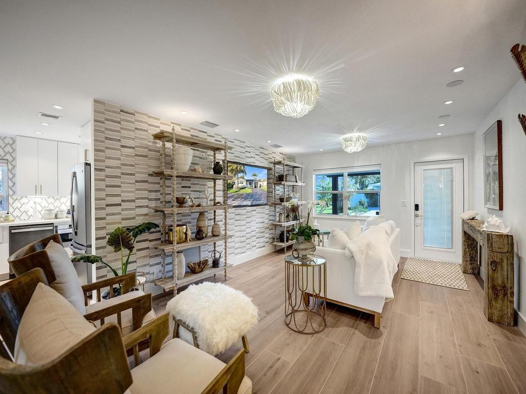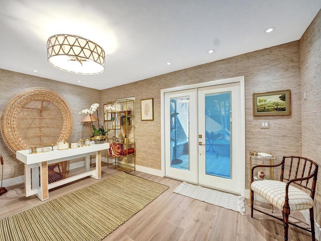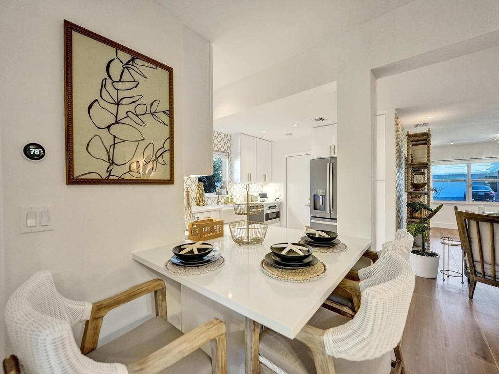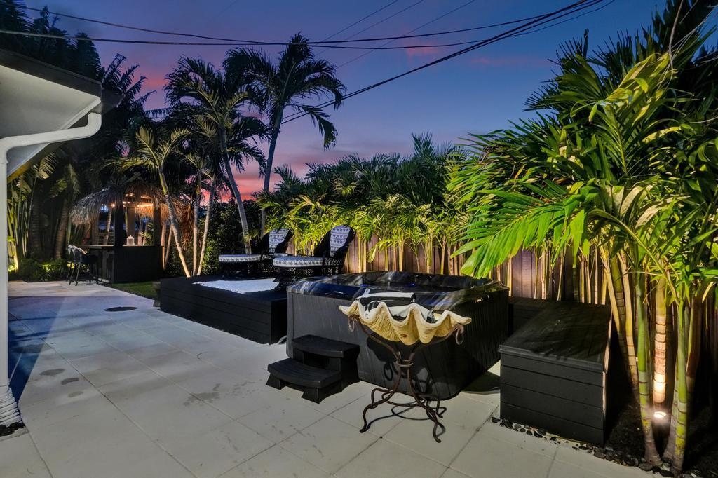 Coastal Elegance Meets Designer Luxury in This Fully Renovated Sanctuary Step into this exquisitely designed and fully renovated 3-bedroom, 3-bathroom retreat, masterfully curated by renowned interior designer Jeanne Michelle of Palm Beach, Florida. This turnkey coastal haven blends refined luxury with seaside charm, offering a move-in-ready experience where no detail has been overlooked. Every space is thoughtfully appointed with high-end furnishings, fine antiques, and nature-inspired accents, creating a serene and sophisticated ambiance throughout. Textured wallpaper, grasscloth wall coverings, and natural fiber elements add warmth and depth to each room, while Smeg small appliances and carefully selected designer pieces elevate the home's modern coastal style. The primary suite is a true retreat, featuring a custom linen king platform bed, designer sconce lighting, and push-press drawers throughout the closets and cabinetry. The en suite bath is adorned with glass tile, a white rock floor, and a frameless glass shower enclosure, creating a spa-like escape. The guest suite offers a tranquil, tropical ambiance with Turkish marble tile, a glass-enclosed bath/shower combo, and the same thoughtful finishes found throughout the home. A third bedroom doubles as a chic office space, complete with a peacock chair, antique accents, and elegant grasscloth walls. The kitchen is a showstoppersleek flat-panel cabinets with Emtek gold-trimmed hardware, matching hardware throughout the home, and pristine white quartz countertops with bar seating and a built-in coffee station. Wood-look tile flooring flows throughout, echoing the textures of beachside living. The third bath features a luxurious wet room with dual sinks, his-and-her showerheads, and body sprayersperfect for indulgent relaxation. All appliances, including the washer and dryer, are brand new and state-of-the-art. Step outside to your private, low-maintenance backyard oasis featuring synthetic turf, tiled and screened-in patios, stylish pavers, a Tiki hut bar, and a brand-new hot tub spa. Both the garage and patio showcase beautiful tilework, while refurbished antique outdoor furniture adds timeless charm and character. Nestled in a peaceful coastal neighborhood, you're just a short stroll from the beach, boutique shops, charming restaurants, and relaxing resorts. Whether you're hosting friends, enjoying your morning coffee with a view, or simply soaking in the tranquility, this home offers the ultimate in comfort, style, and coastal living. Don't miss your chance to own this breathtaking, fully furnished retreatschedule your private tour today and step into your dream beachside lifestyle.
