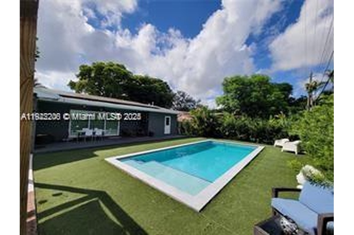 This beautifully maintained single-story Mid-Century Modern home offers over 2,000 sq ft of living space in a classic Florida ranch-style design. The spacious layout includes a bright, open living room with sliding doors that overlook a large backyard and pool area, a light-filled kitchen, four bedrooms, two full bathrooms, a separate laundry room, and an attached garage. The property is equipped with 47 solar panels, offering significant energy efficiency. Investor opportunity: The home is currently tenant-occupied through 03/31/2026, with the tenant paying $5,500 per month and willing to renovate for another year. Please note: Showings only on wednesday from 2pm to 4pm with 24 hours advance notice . A video tour is available upon request.