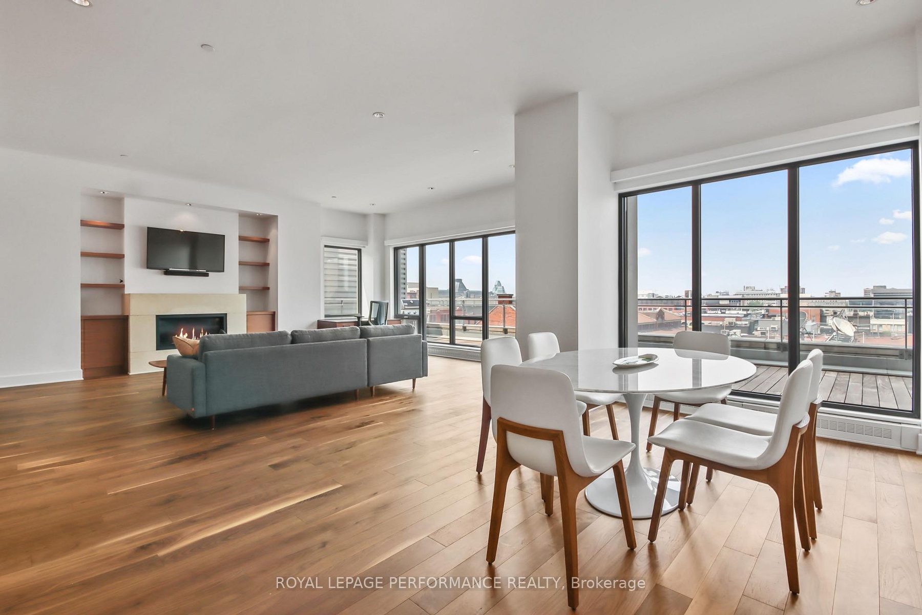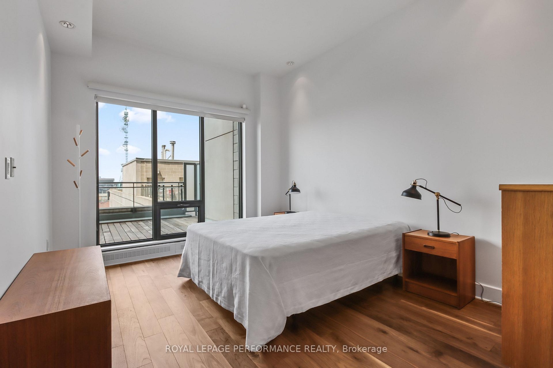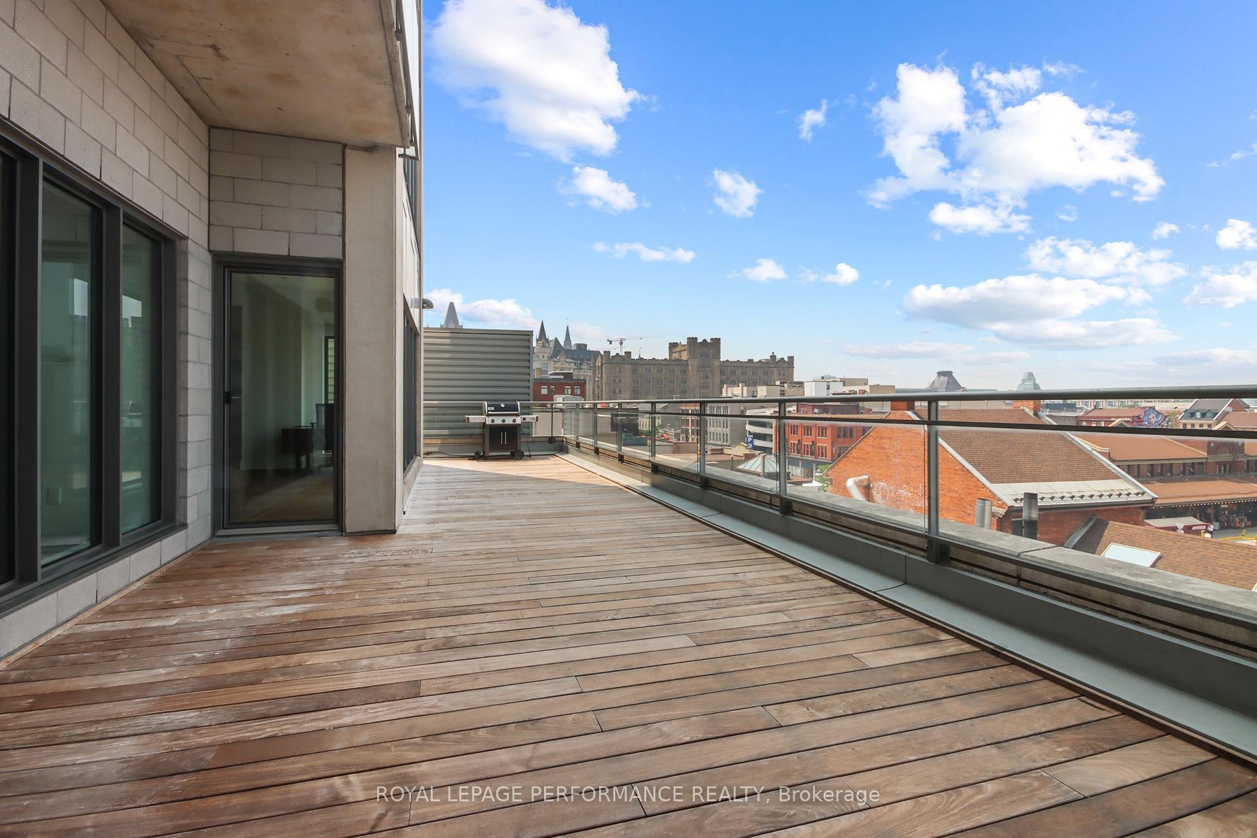 Stunning oversized Executive condo in the heart of Ottawa's Byward Market. Soaring ceilings, huge windows, immmaculate walnut floors, a gas fireplace and a massive private outdoor deck set this unit apart from most others. Offered with or without furniture, this apartment is ideal for those seeking a super stylish apartment with a gym, pool, sauna, and party room, all with 24 hour security and concierge. Steps to shopping, restaurants and coffee shops, Parliament and LRT. Very unique and rare offering.