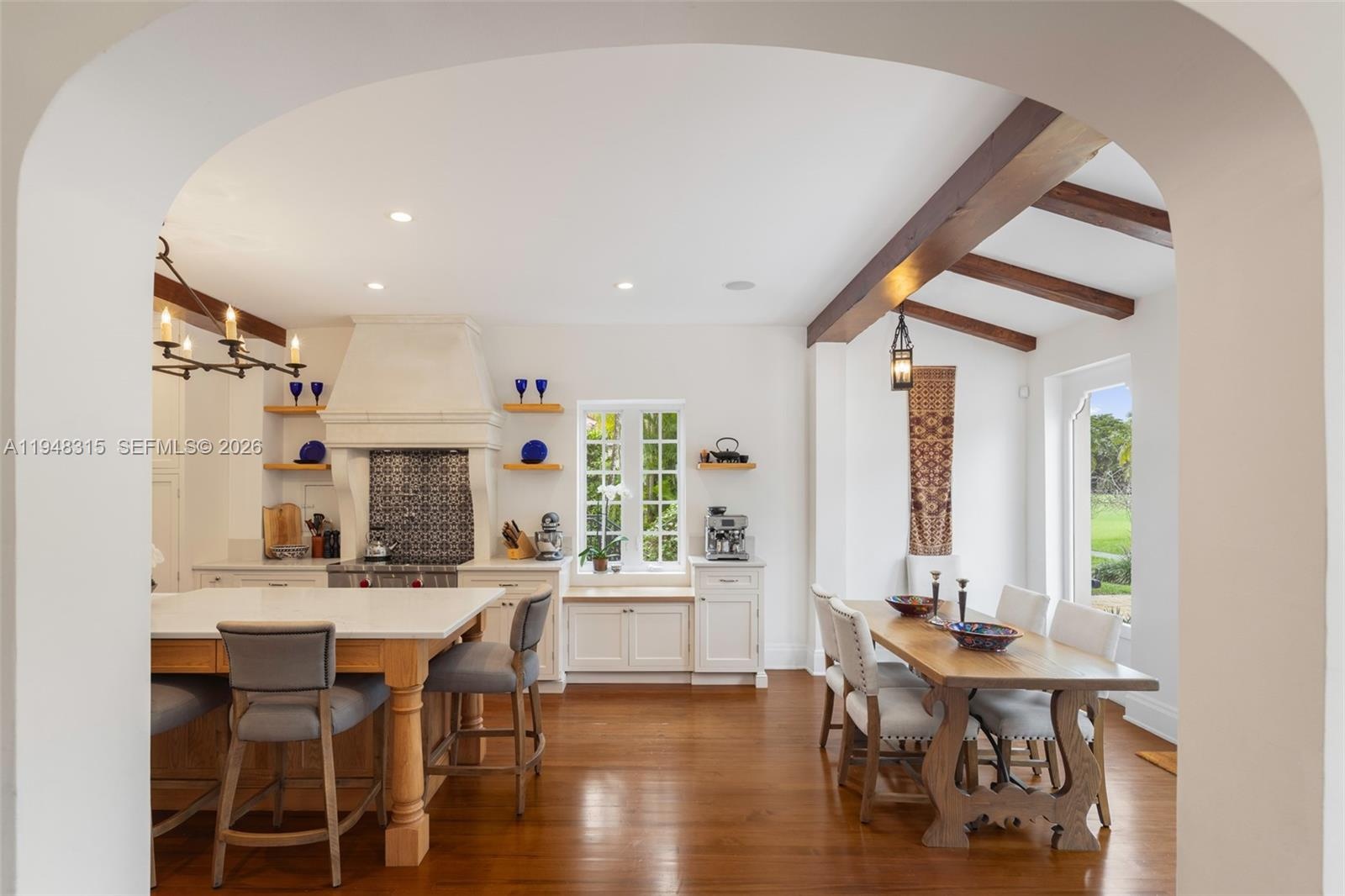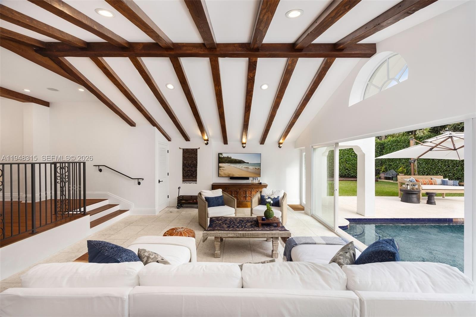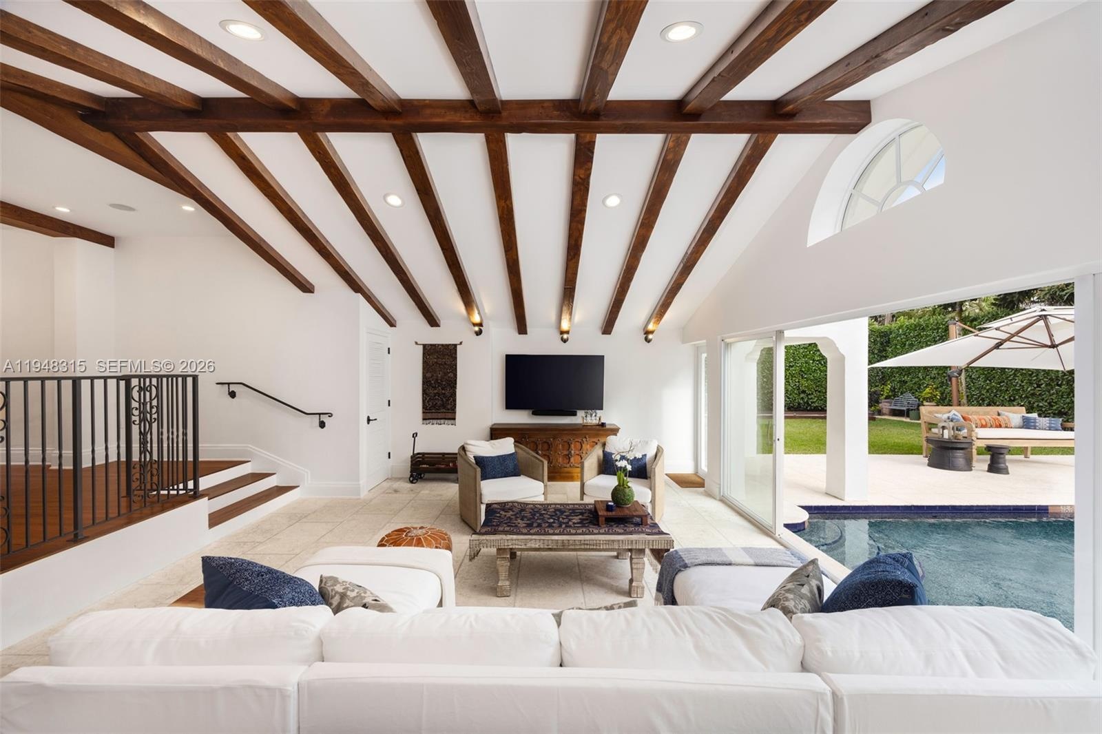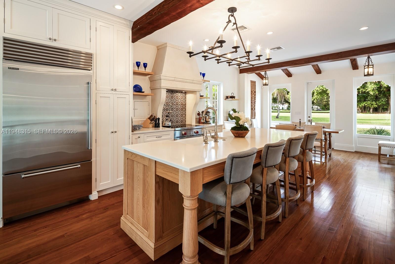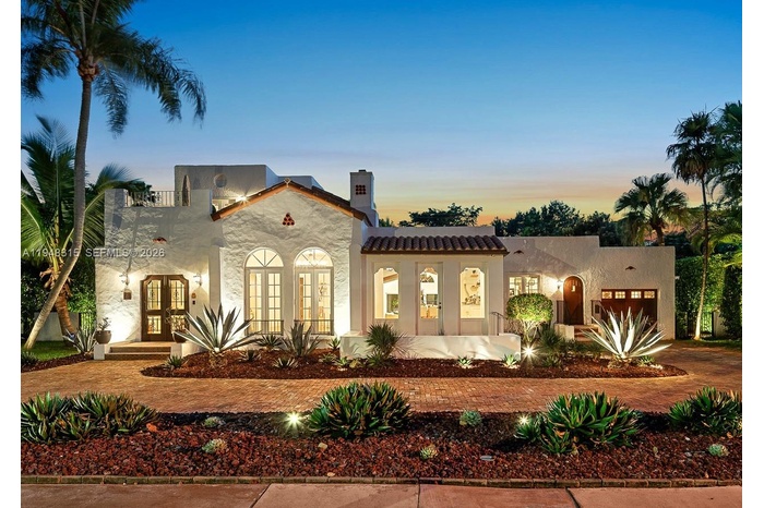 Designer-owned and completely renovated historic residence overlooking the Granada Golf Course, with awe-inspiring views of landmark banyan trees on the 6th fairway. This 4BR/3.5BA Old Spanish home seamlessly blends modern open living with preserved architectural charm, offering a rare combination of character, comfort, and move-in-ready convenience. A sun-filled, open-flow layout centers around a chef-worthy kitchen with custom Vermont-made cabinetry, Sub-Zero, Wolf & Kohler fixtures. Expansive family room opens directly to a resort-style pool & patio, ideal for indoor-outdoor entertaining. All 3 main bedrooms feature large walk-in closets. Upstairs primary suite enjoys tranquil golf course views & a charming sun porch. 4th bedroom is perfect for live-in help or in-laws. Design details include meticulously restored vintage doors, imported custom iron chandeliers, and a rare 1923 solid cast-iron soaking tub. Additional highlights include a home office with separate entrance, fully finished and air-conditioned garage currently used as a gym, commercial-grade IT with Cat 6 wiring throughout, AV, CCTV, storm windows, solid concrete block construction, and Trane central AC systems. Located outside a flood plain and adjacent to the Granada Golf Course, engineered to provide natural water absorption. A truly special Coral Gables offering—historic, refined, and turnkey—just minutes to the Biltmore Hotel, Country Club, parks, Miracle-Mile dining, and Miami International Airport.