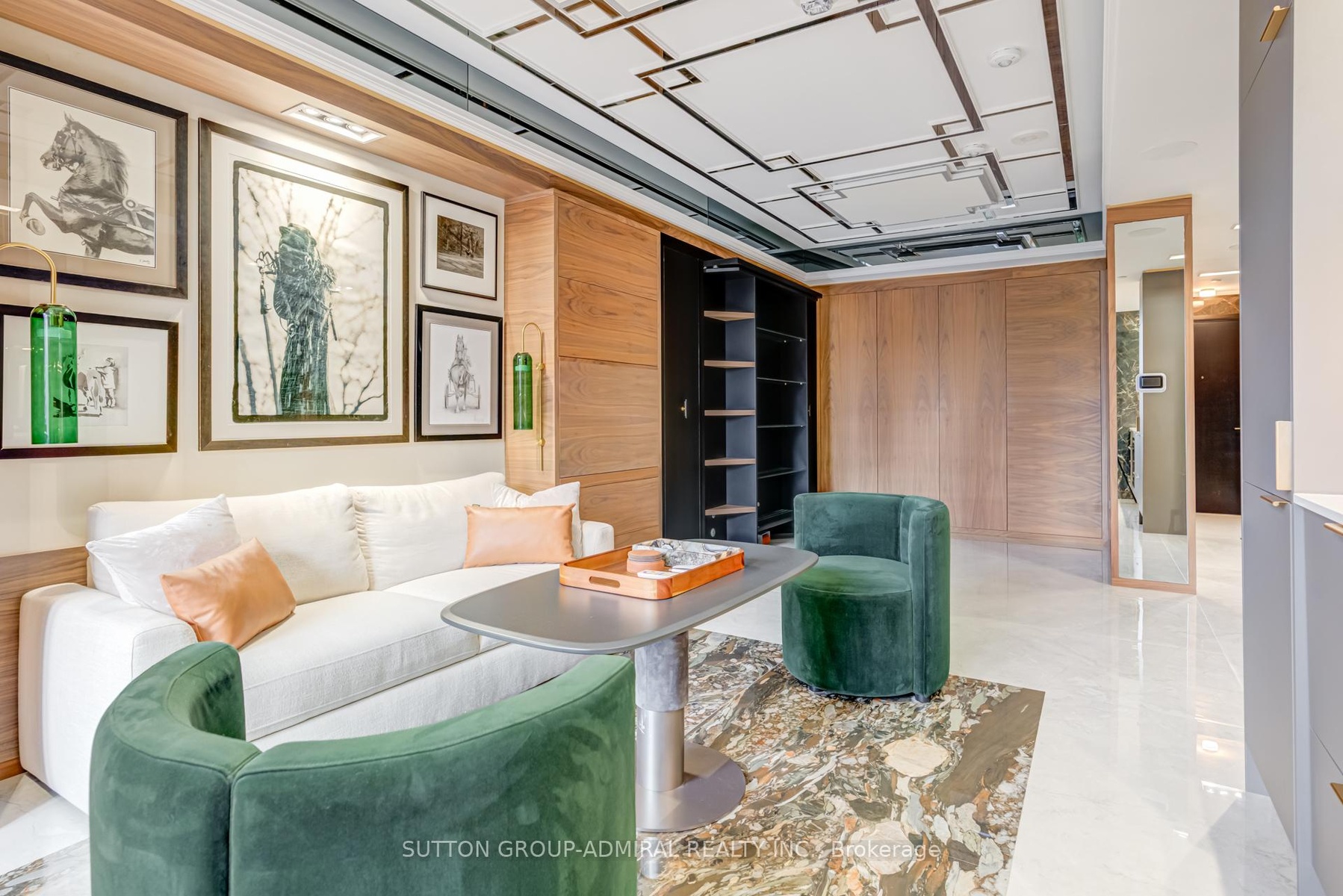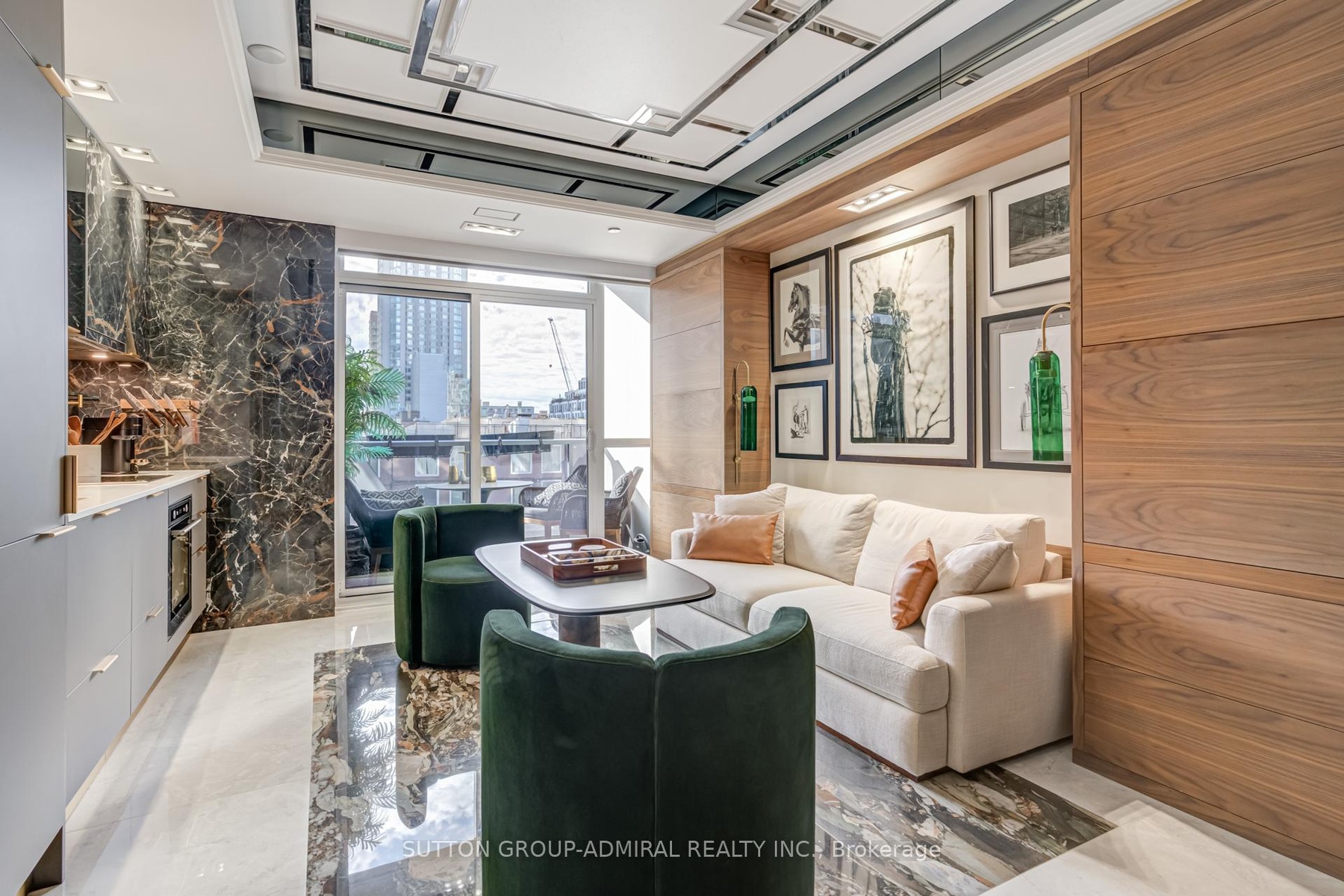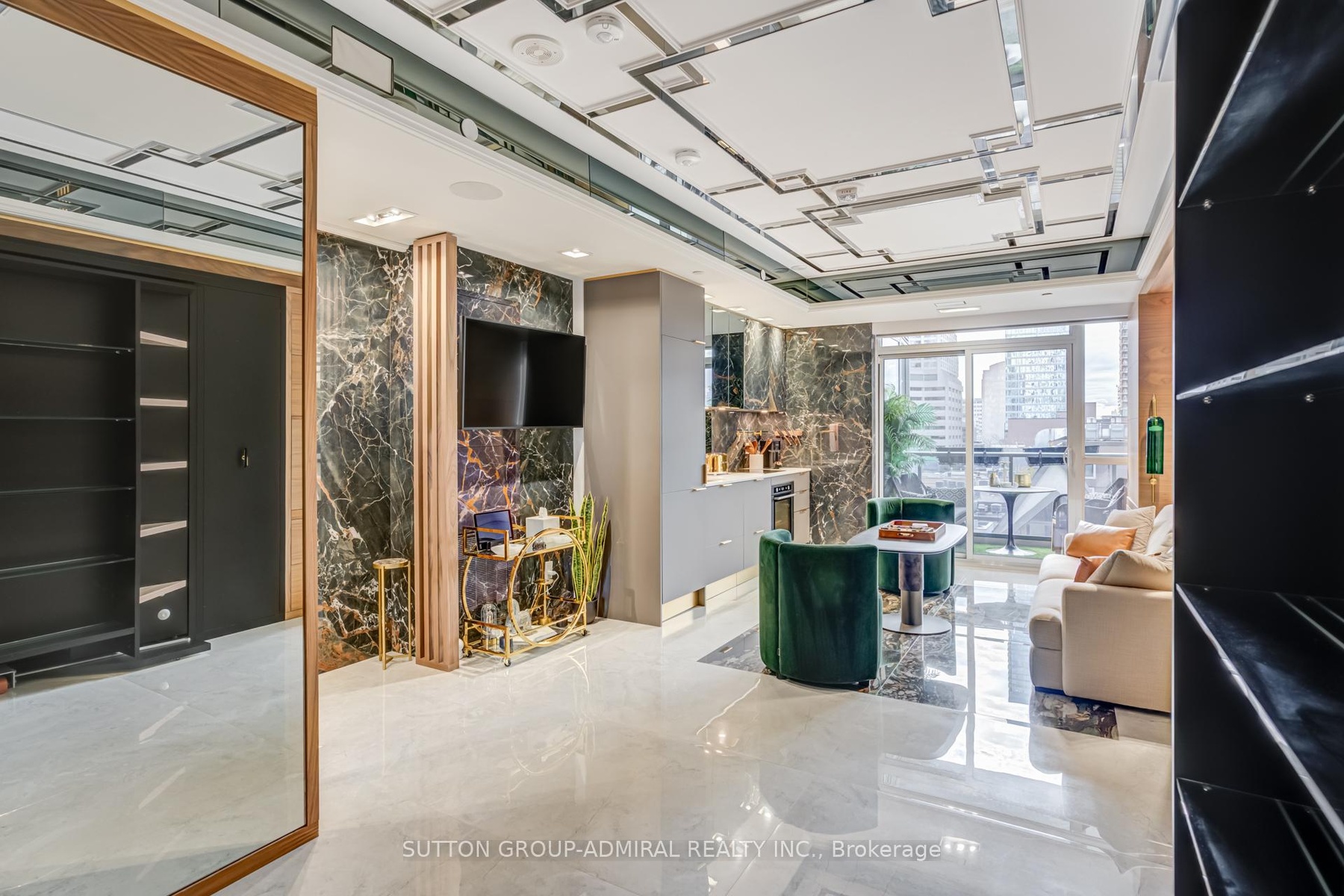 Experience boutique-style living in the heart of Yorkville with this fully furnished, one-of-a-kind suite at 88 Cumberland. Thoughtfully redesigned with striking porcelain tile floors, 9-ft feature wall slabs, and an illuminated star ceiling that sets the mood at every hour. A custom Italian wall bed blends seamlessly into sleek millwork, creating a flexible open-concept layout perfect for modern living. The kitchen features premium finishes including leather-wrapped appliances, porcelain and mirrored cabinetry, brushed gold accents, and smart hidden storage. The spa-inspired bath offers a marble vanity, tinted glass shower, and built-in medicine cabinet. Enjoy integrated Sonos speakers, remote blackout shades, digital climate control, and a same-floor locker for convenience. All within steps of Bloor's luxury shopping, fine dining, and cultural landmarks.