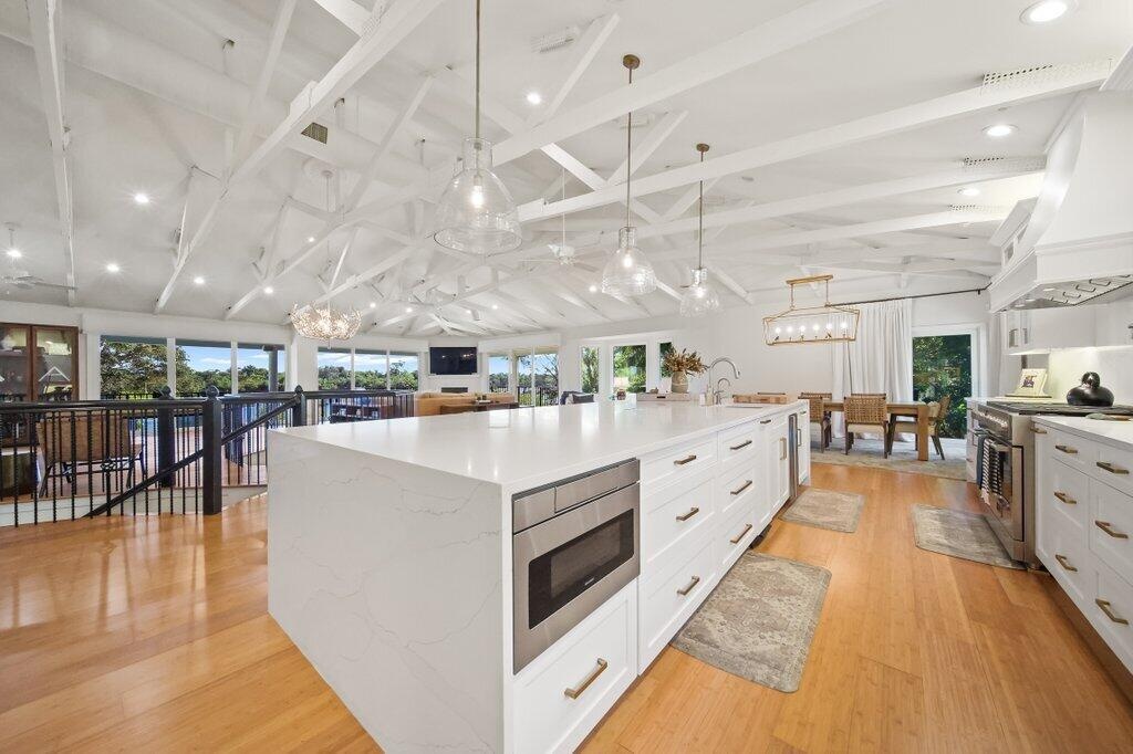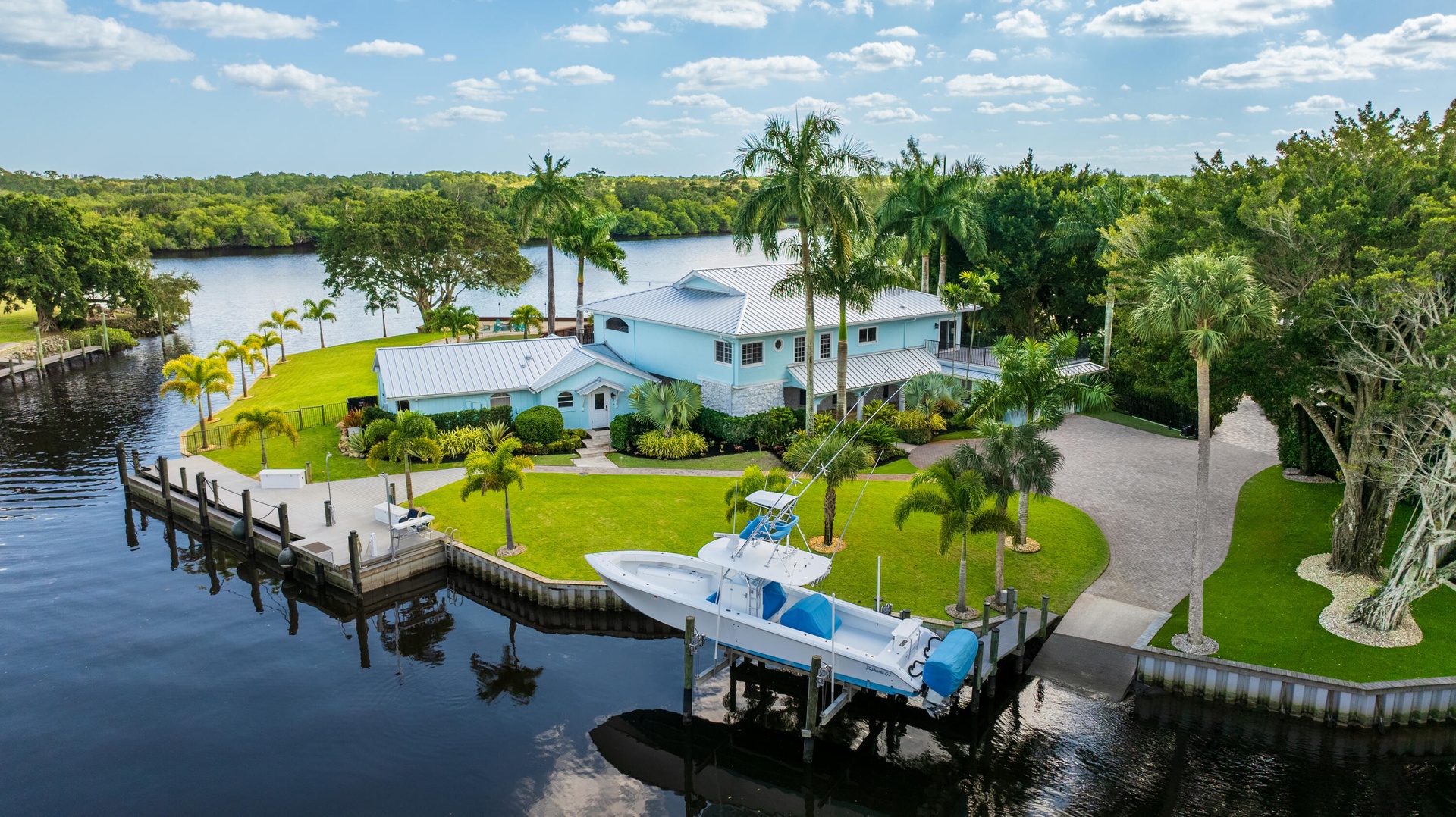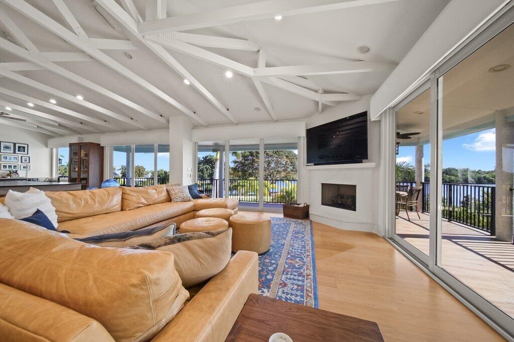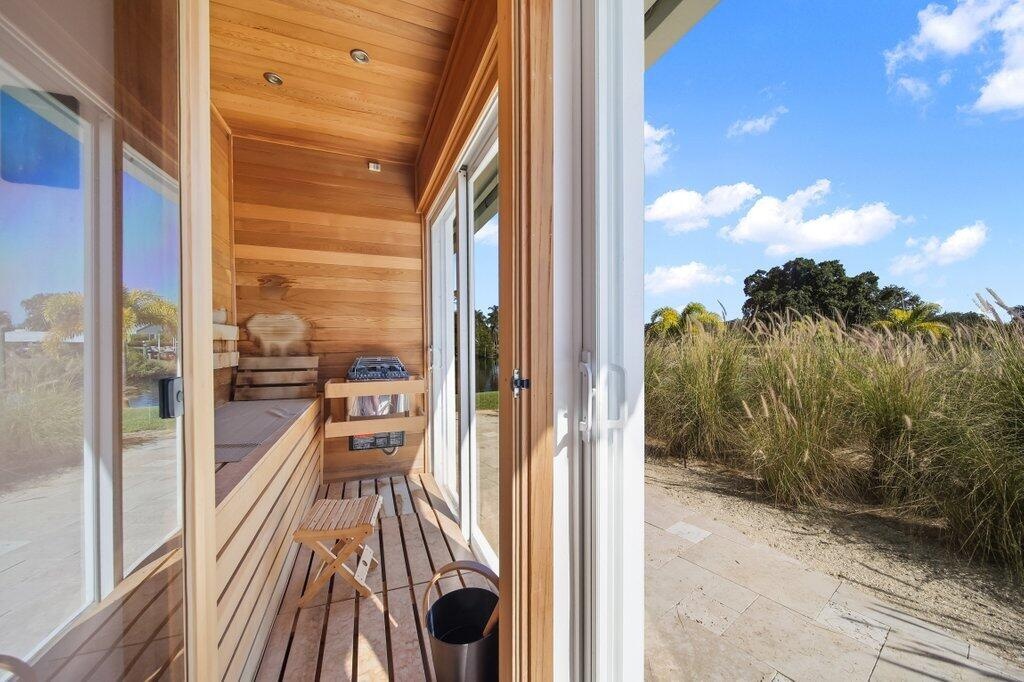 Rare opportunity to own a private peninsula estate with over 700' of shoreline on nearly 1 acre — a boater's sanctuary with deep water, no fixed bridges to the ocean, and exceptional privacy surrounded by river views and Audubon-protected nature. This fully renovated property offers a 4BR main residence plus a 2BR/2BA guest house, ideal for multigenerational living or private guest accommodations. Enter through a Honduran Mahogany door where a heart-shaped stone set into the foyer floor welcomes you home with intention. A bright, open great room with exposed beams and bamboo flooring connects seamlessly to a 65' covered balcony overlooking the water and wildlife. The gourmet kitchen features Sub-Zero refrigeration, Fulgor range, dual dishwashers, Wolf warming drawer, built-in food sealer, trash compactor, and a custom dog-feeding station. Resort-style outdoor living includes a fully renovated heated pool & spa, custom fire pit, screened and covered patios, mosquito misting system, and lush new landscaping with Zoysia sod, palms, lighting, irrigation, and turf accents. For boaters, the waterfront is unbeatable: two new docks a 70' dock with 200 amp service currently docking a 63' Hatteras sportfish, and a 30' dock with 30 amp + water and a 24,000 lb lift. Private boat ramp + kayak launch, over 700' of newly replaced seawall, and an additional retaining seawall under the dock ensure long-term peace of mind. Extensive improvements throughout: New metal roof & gutters Impact windows & doors (full tinting) All A/C units new (with climate-controlled garage) All water heaters new + water softener system 38kw whole-house generator w/1,000 lb propane tank Built-in sauna Whole-home audio + all new LED lighting Designer lighting from Serena & Lily Updated flooring in guest house New gated entry Located close to top-rated schools, dining, marinas, and beaches yet privately tucked into nature. A turn-key waterfront estate where boating, luxury, and Old Florida serenity meet. You can not replicate this stunning waterfront resort!