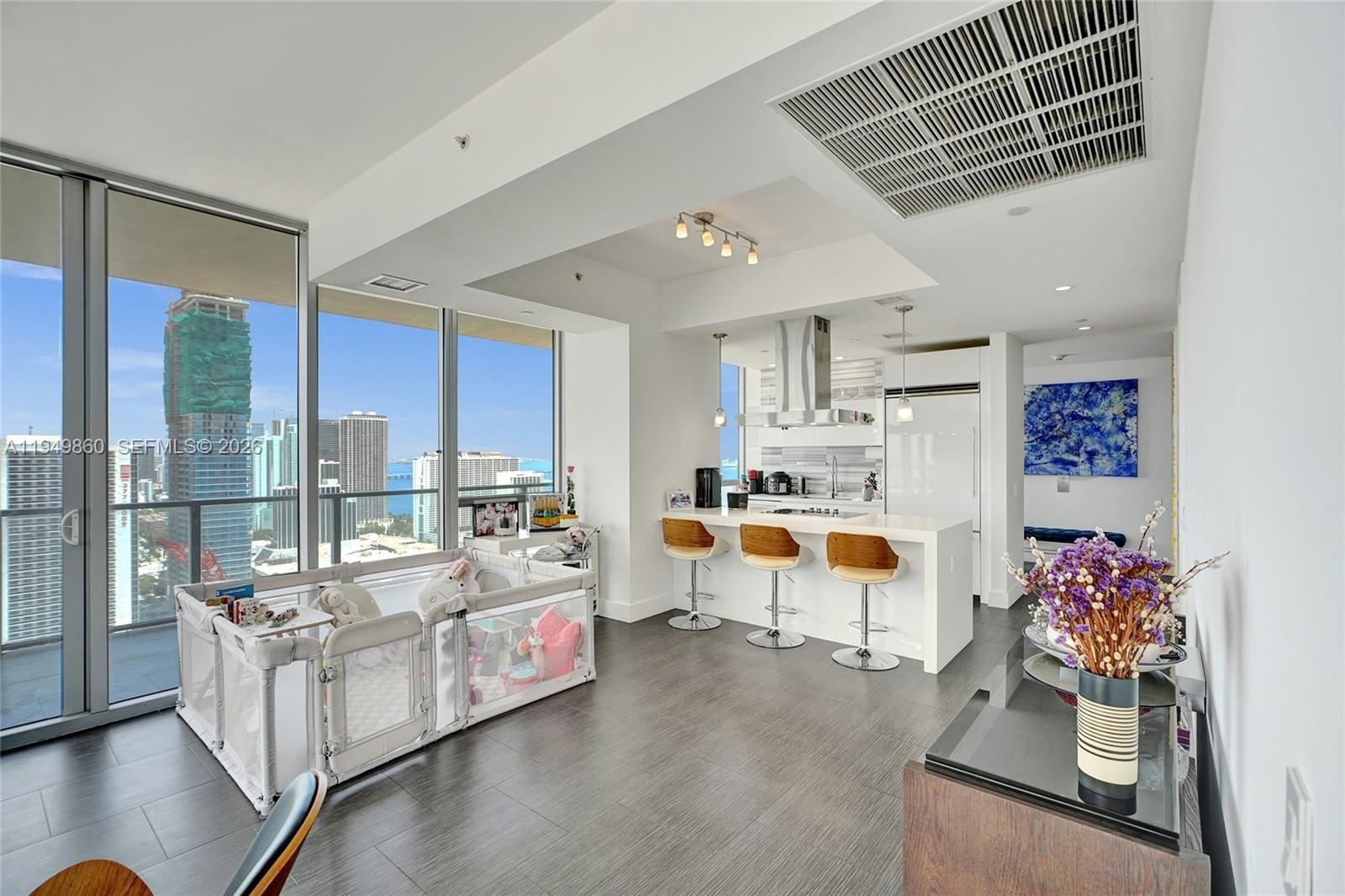 Live above the clouds in this renovated 2-bed, 2-bath at the Marquis. This 37th-floor home features a private elevator, panoramic city and bay views, and 1,647 sq. ft. of modern luxury. Interior upgrades include a dual-zone smart AC system, smart toilet, electric blinds, rain showers, frosted glass accents, and sleek tile flooring throughout. Residents enjoy resort-style amenities plus access to an exclusive private beach club at the Hilton South Beach. Ideally located just steps from parks, stadiums, top dining, and only a few blocks from the vibrant new Miami Worldcenter district.