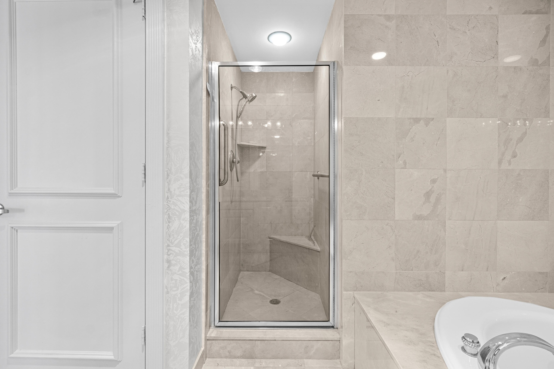 From the moment you step off the elevator into your private foyer, you're greeted by a light-filled coastal sanctuary featuring hand-painted French rag wash wall treatments and marble floors throughout. The spacious kitchen offers classic cabinetry, stainless-steel appliances, and a built in wet bar perfect for entertaining, especially when paired with those jaw-dropping ocean views.