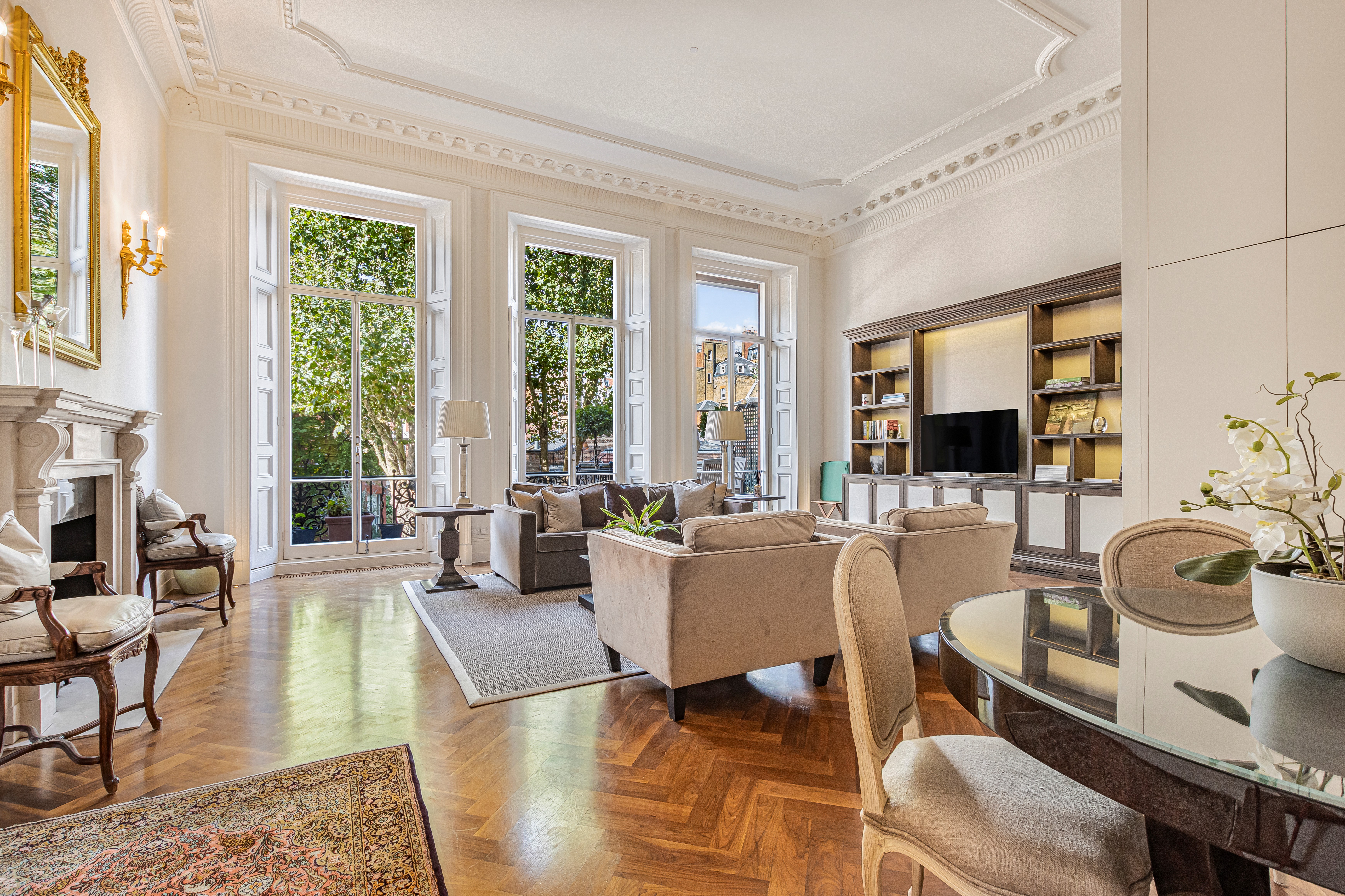 Further highlights include air conditioning throughout, a lift, an external storage room, and access (by separate arrangement) to the beautifully maintained communal gardens of Cadogan Square, complete with tennis courts a rare luxury in central London.