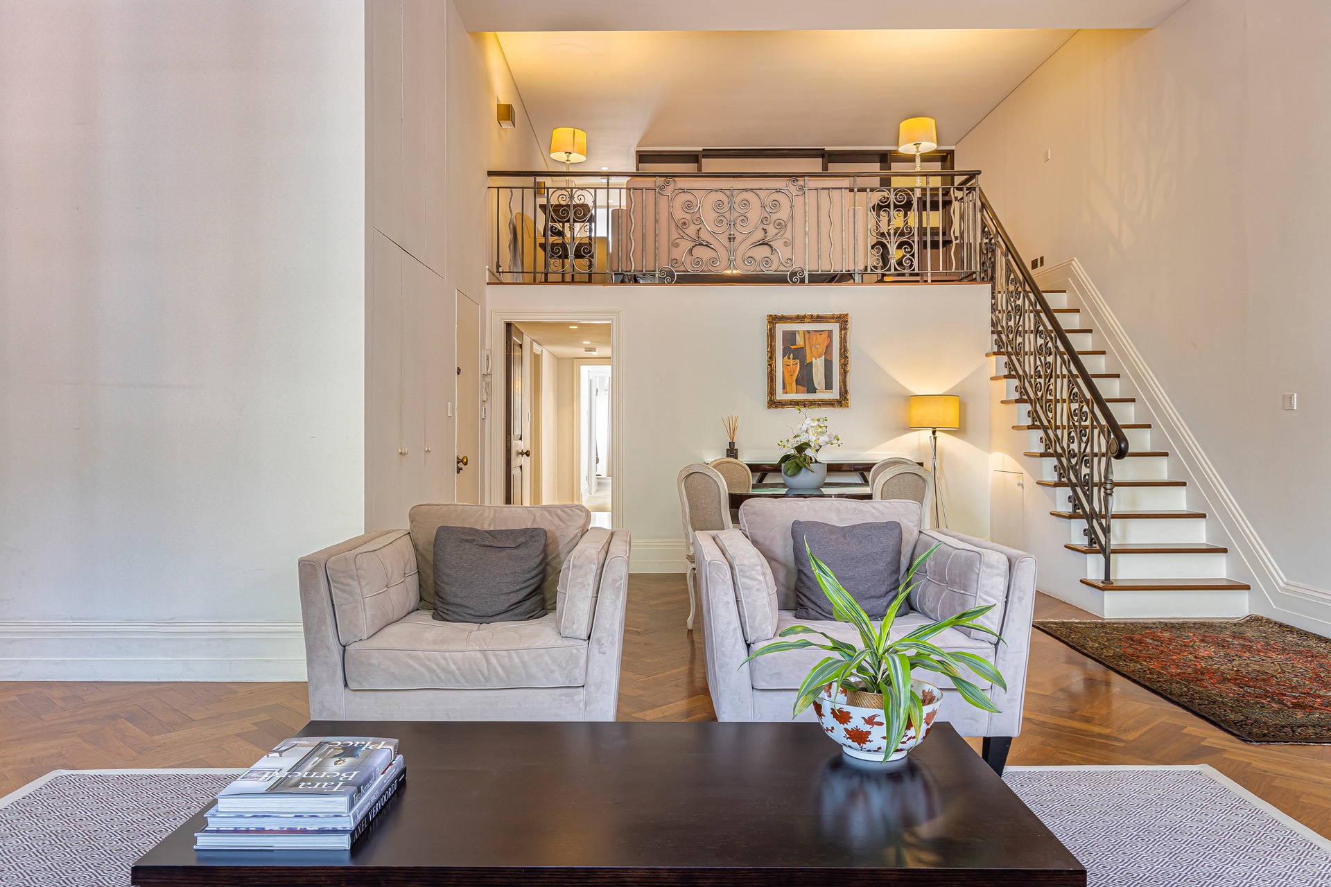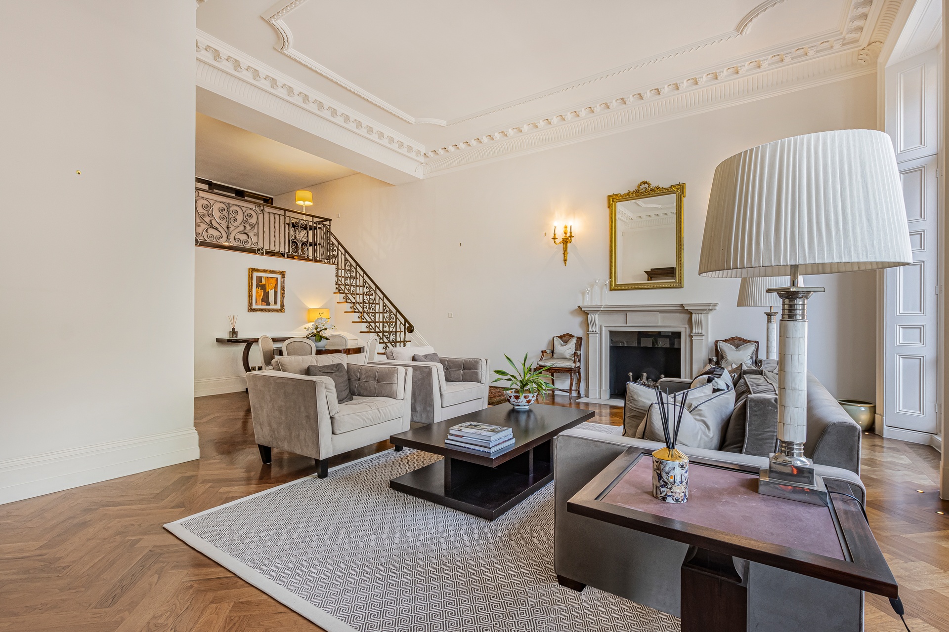 The apartment is defined by soaring 4 metre ceilings and three magnificent floor to ceiling French windows in the main reception room, opening onto a charming west facing terrace with views over the square. Original features such as ornate cornicing, parquet flooring, and a period fireplace sit seamlessly alongside modern finishes, creating a perfect balance of heritage and contemporary style. A mezzanine level overlooks the reception, providing a versatile space ideal as a study, snug, or media area.