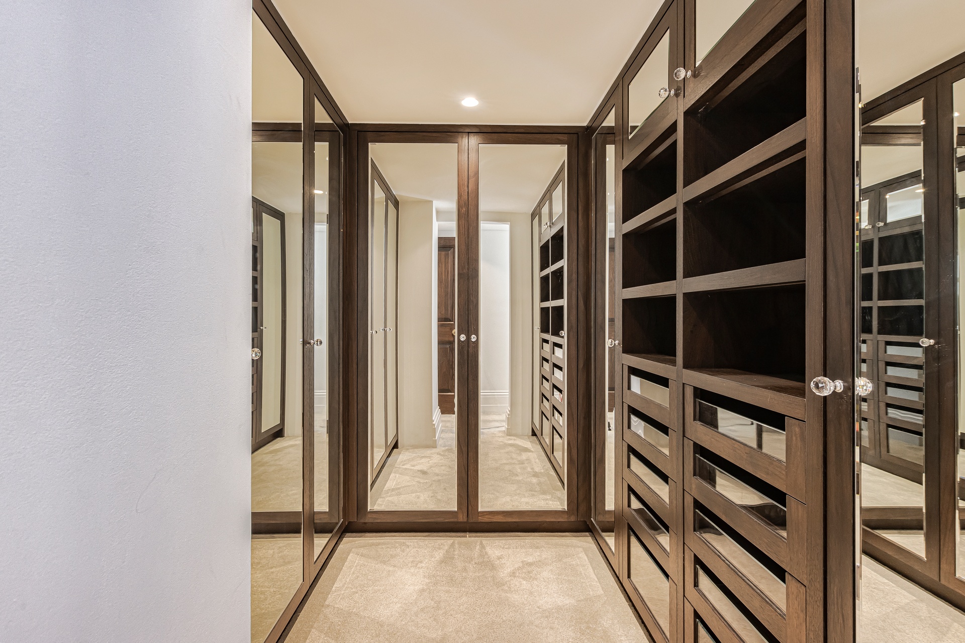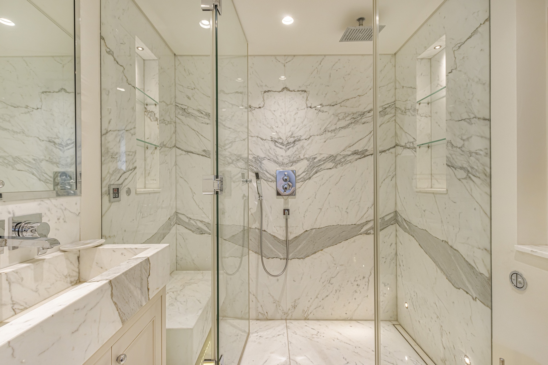 Accommodation is thoughtfully arranged across three generous bedrooms. The principal suite features a walk-in dressing room and a luxurious marble clad bathroom. The additional bedrooms each offer ample storage, with one benefitting from its own en suite and the other served by a stylish guest shower room.