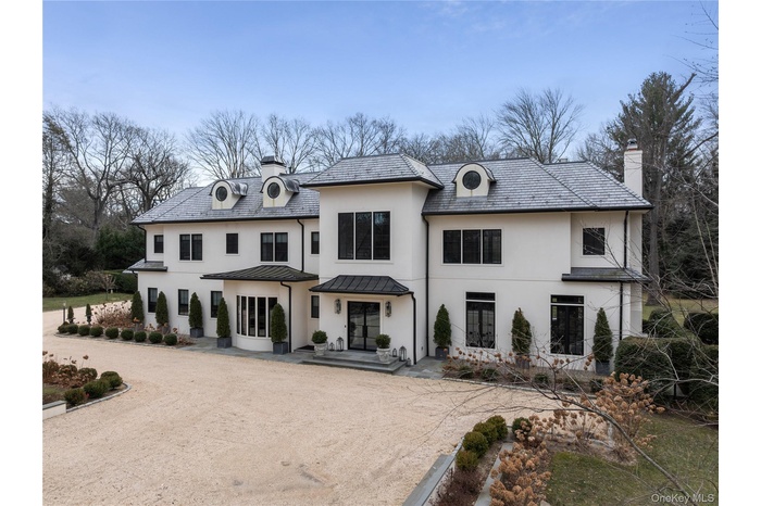 Introducing a newly constructed custom Brookville Colonial crowned with a stunning slate roof, offering an extraordinary blend of classic architecture and elevated designer finishes. Privately set behind an electric gate on over 2.53 fully landscaped acres, this exceptional estate, constructed in 2020, has been thoughtfully designed for both grand-scale entertaining and refined everyday living. A long, stone driveway leads to the residence, accented by elegant black-trimmed windows, courtyard entrance and timeless curb appeal.