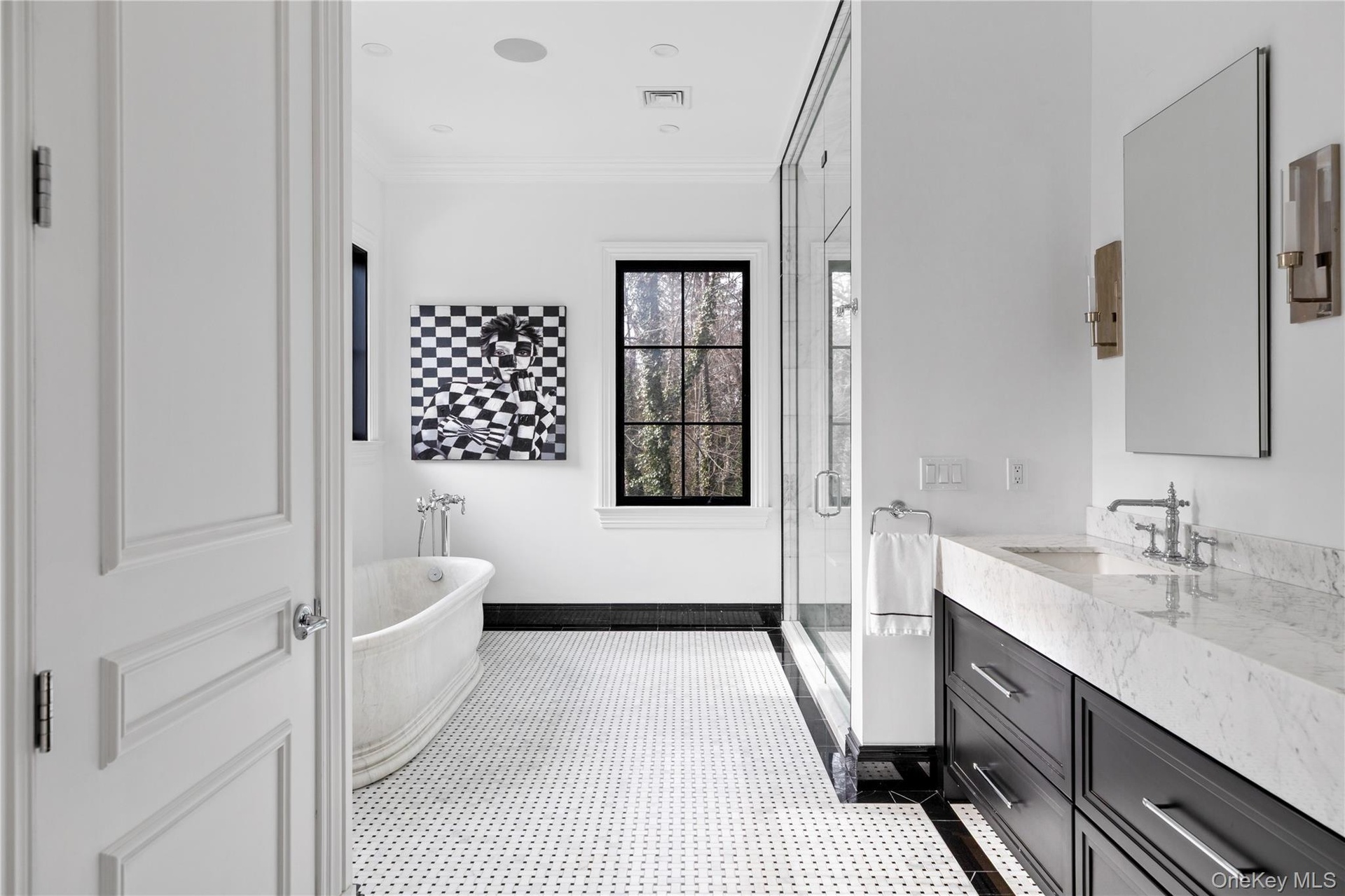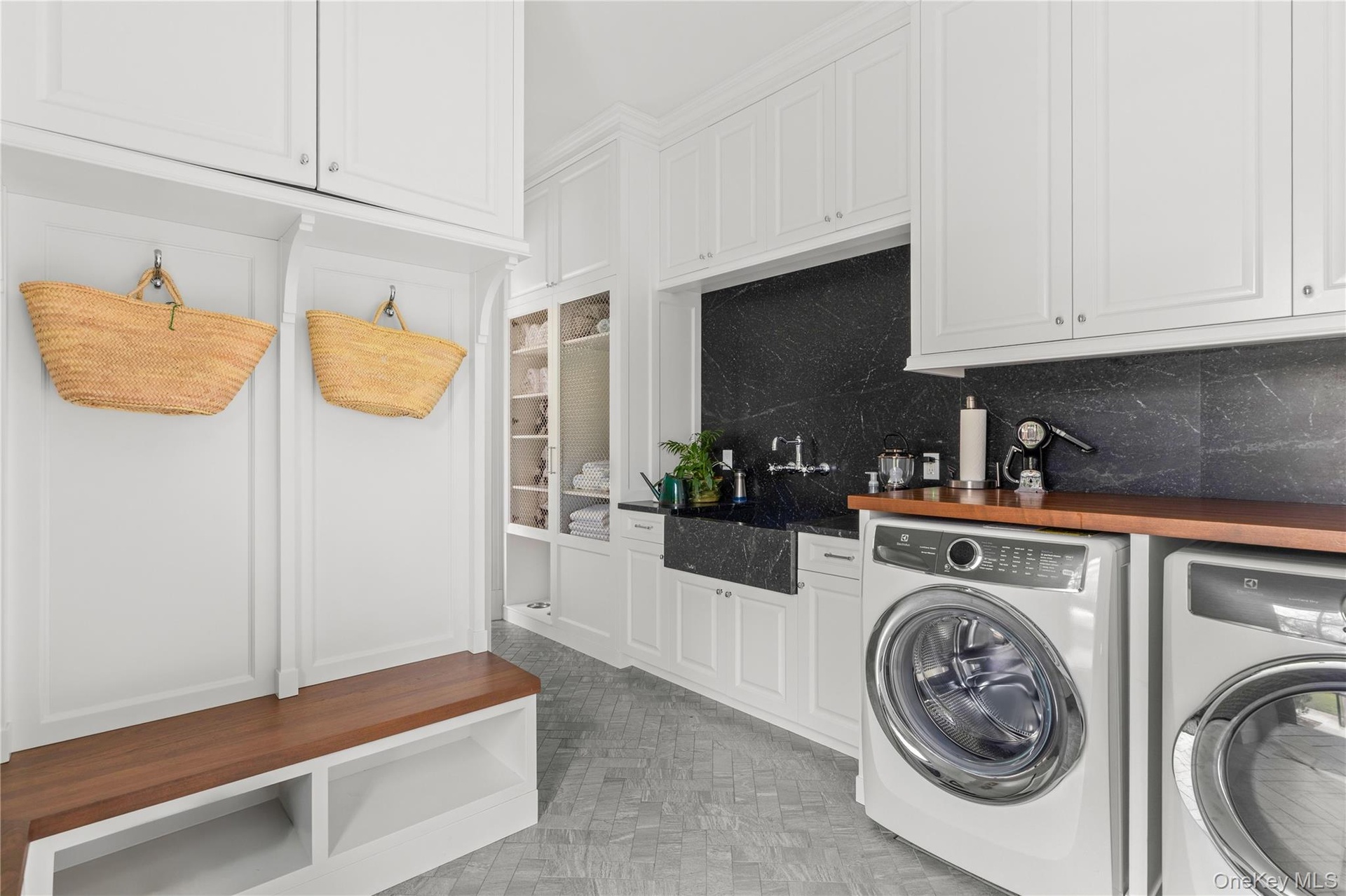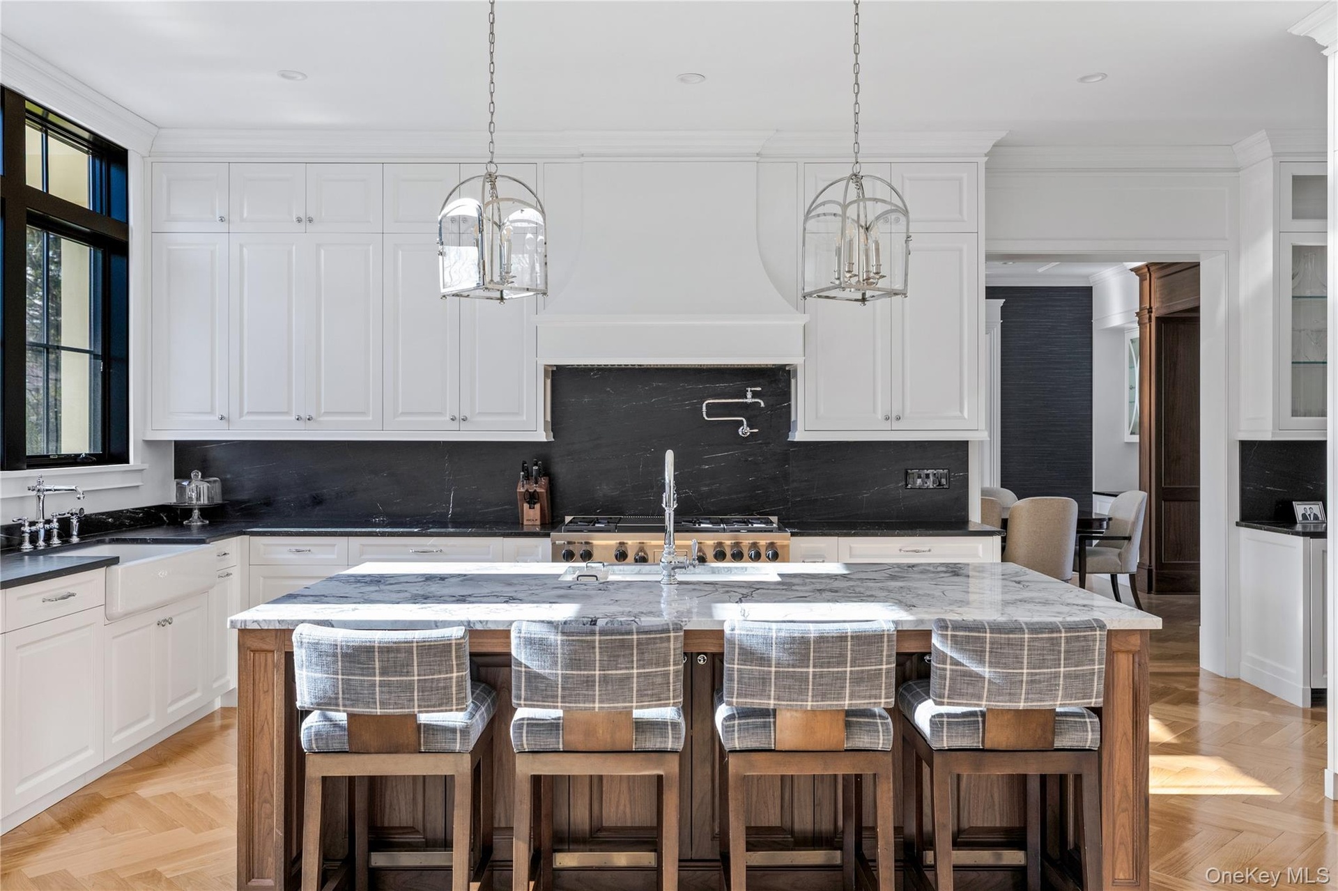 At the heart of the home is a spectacular double-island gourmet kitchen, impeccably outfitted for the most discerning chef and ideal for hosting. The kitchen features a wet bar, oversized pantry, and flows effortlessly into a warm and inviting den. A first-floor junior primary suite with a private full bath offers flexibility, with direct access to the attached 2+ car garage. A thoughtfully designed laundry and mudroom area includes a built-in dog wash for added convenience.