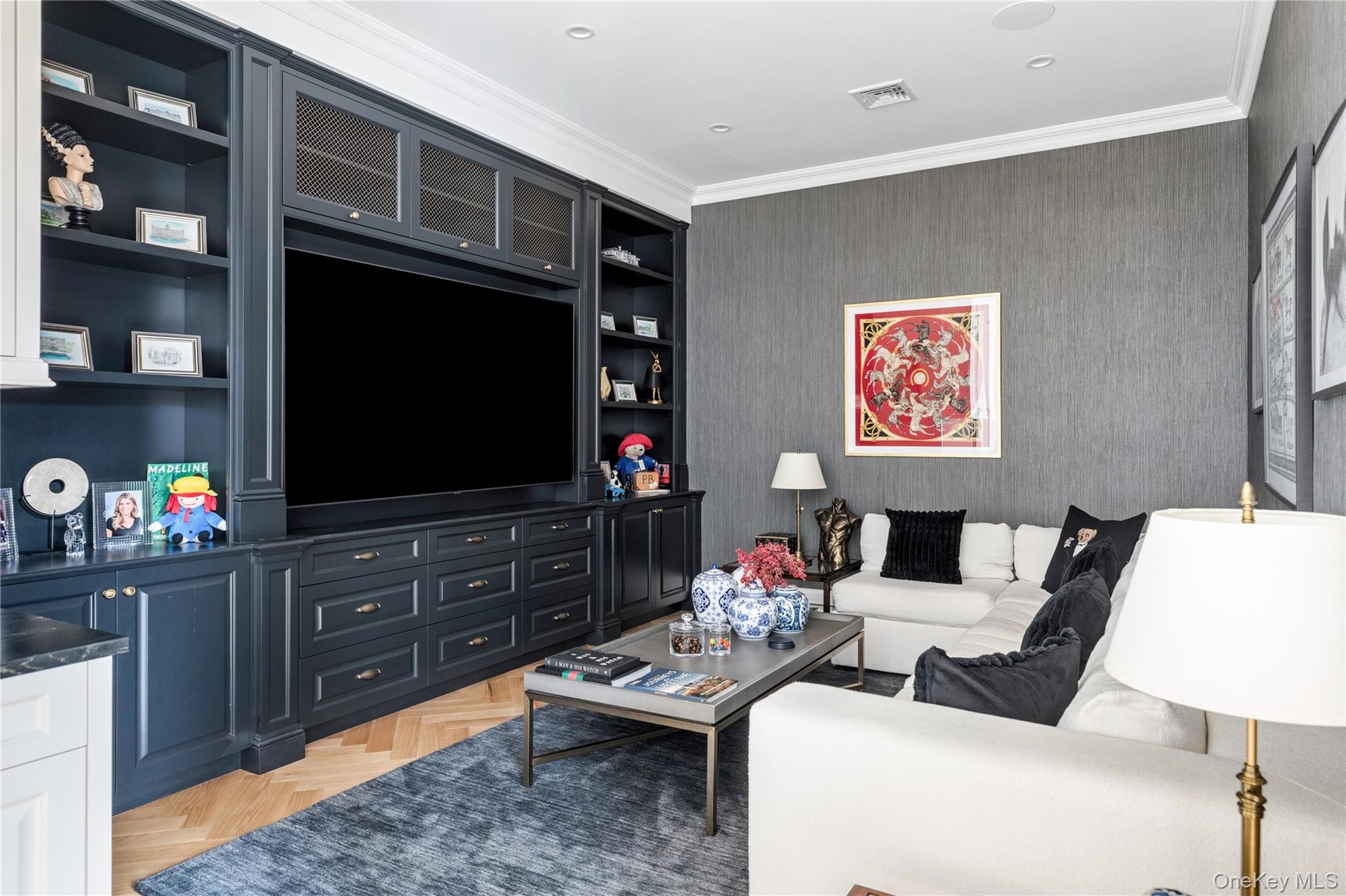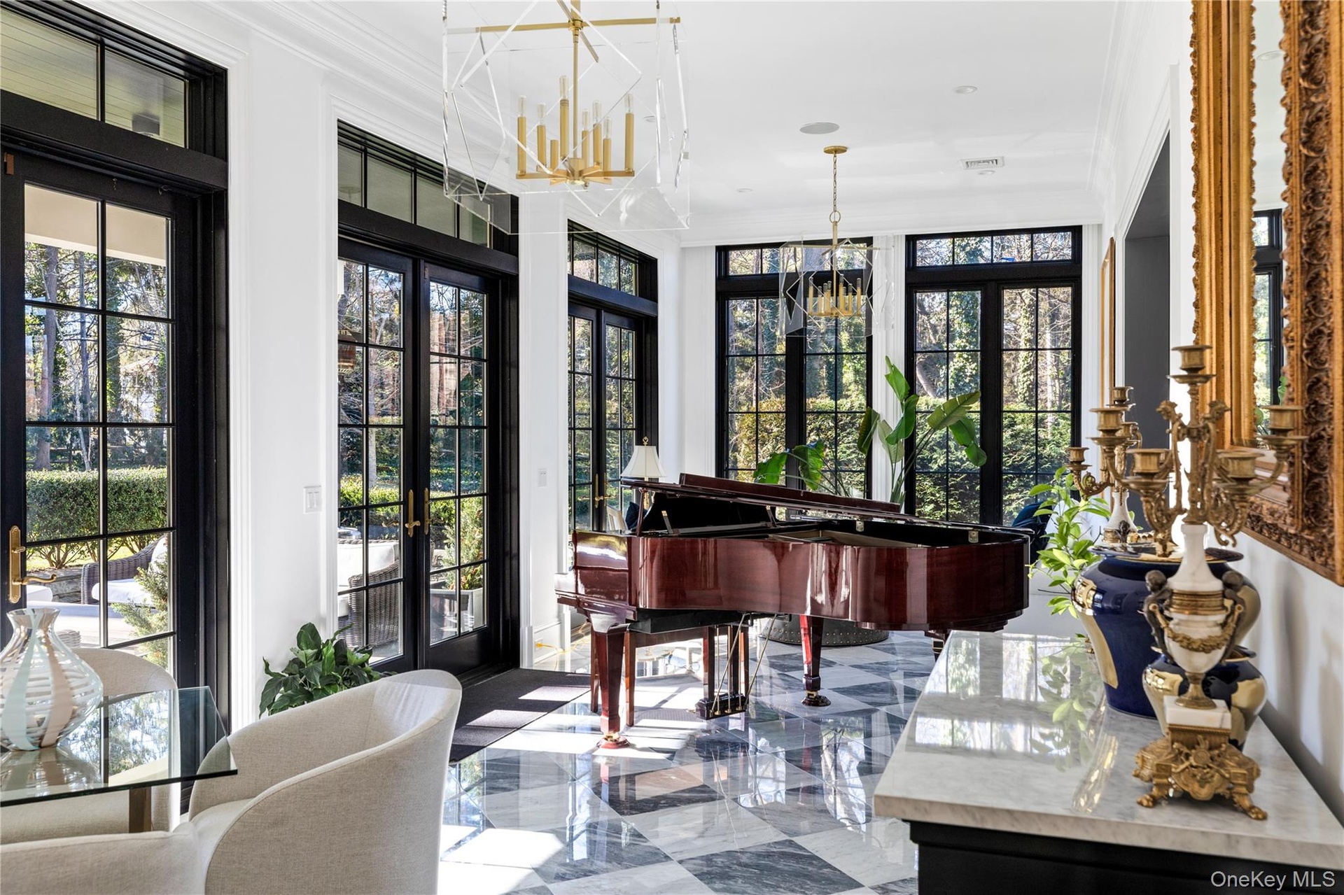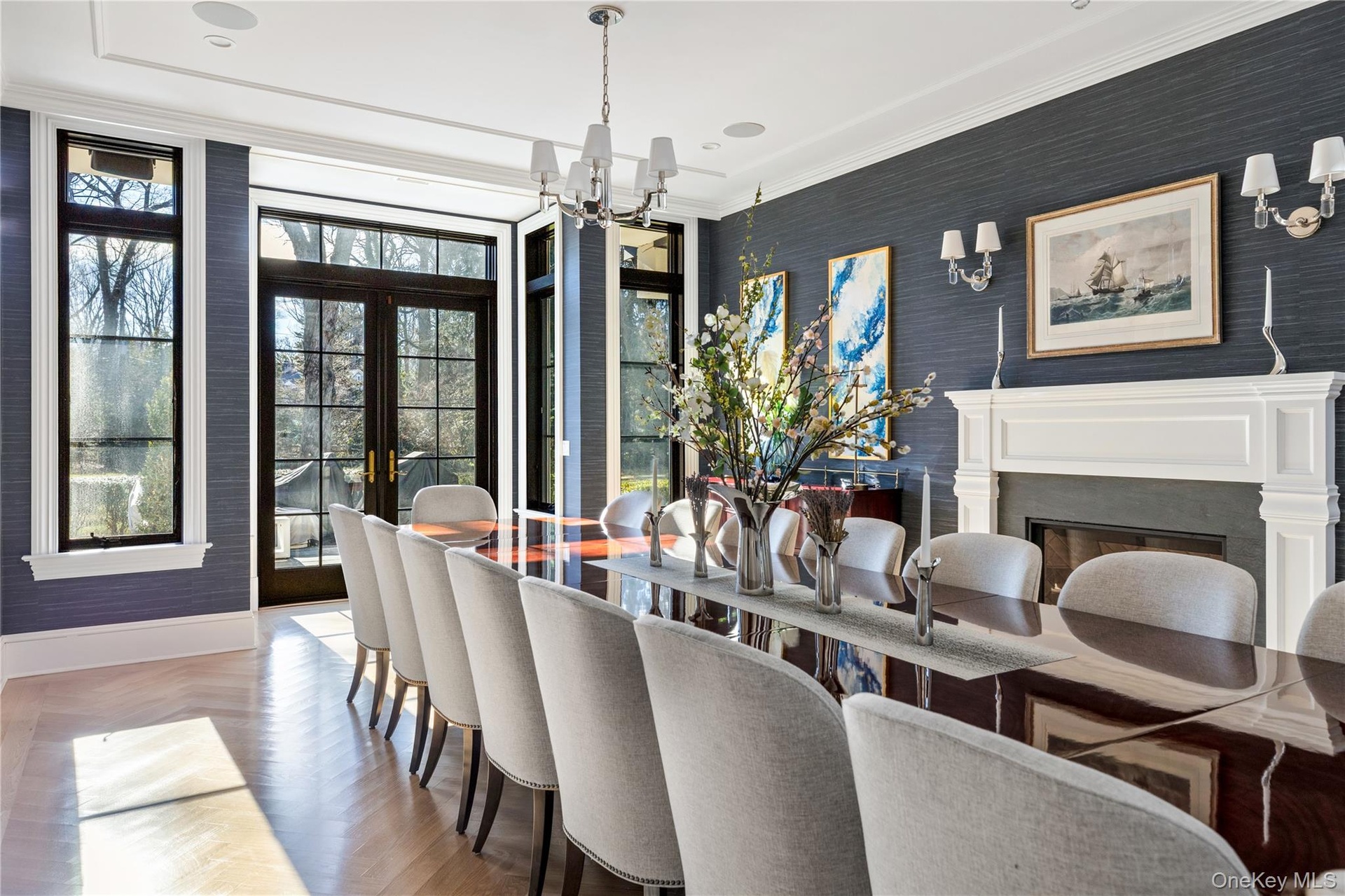 This bespoke home features six generously sized bedrooms, seven full bathrooms, and two half baths, complemented by soaring ceilings and exquisite millwork throughout. A gracious foyer creates an impressive first impression, opening to sophisticated formal spaces including a sunken living room with a custom fireplace, and a refined parlor or music room adorned with elegant stone floors and dramatic walls of glass. Rich herringbone hardwood flooring flows seamlessly throughout the home, enhancing its timeless elegance. A formal dining room and private office, each with a fireplace, complete the main entertaining areas.