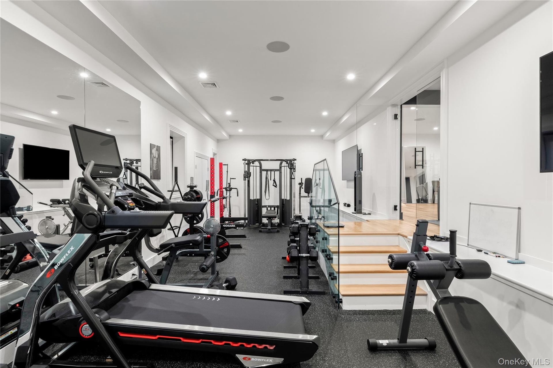 The primary suite is a true private retreat, showcasing cathedral ceilings, a fireplace with an adjoining lounge area, a spacious custom walk-in dressing room, and a spa-inspired bath with a soaking tub and oversized shower. A private rooftop terrace/sundeck overlooks the serene backyard, creating a peaceful escape. All additional bedrooms are generously sized and feature beautifully appointed ensuite baths, all of which have radiant floor heating. The fully finished lower level further elevates the lifestyle experience, offering a state-of-the-art media room and theater, a large matted gym, and a luxurious spa bathroom with a steam shower.