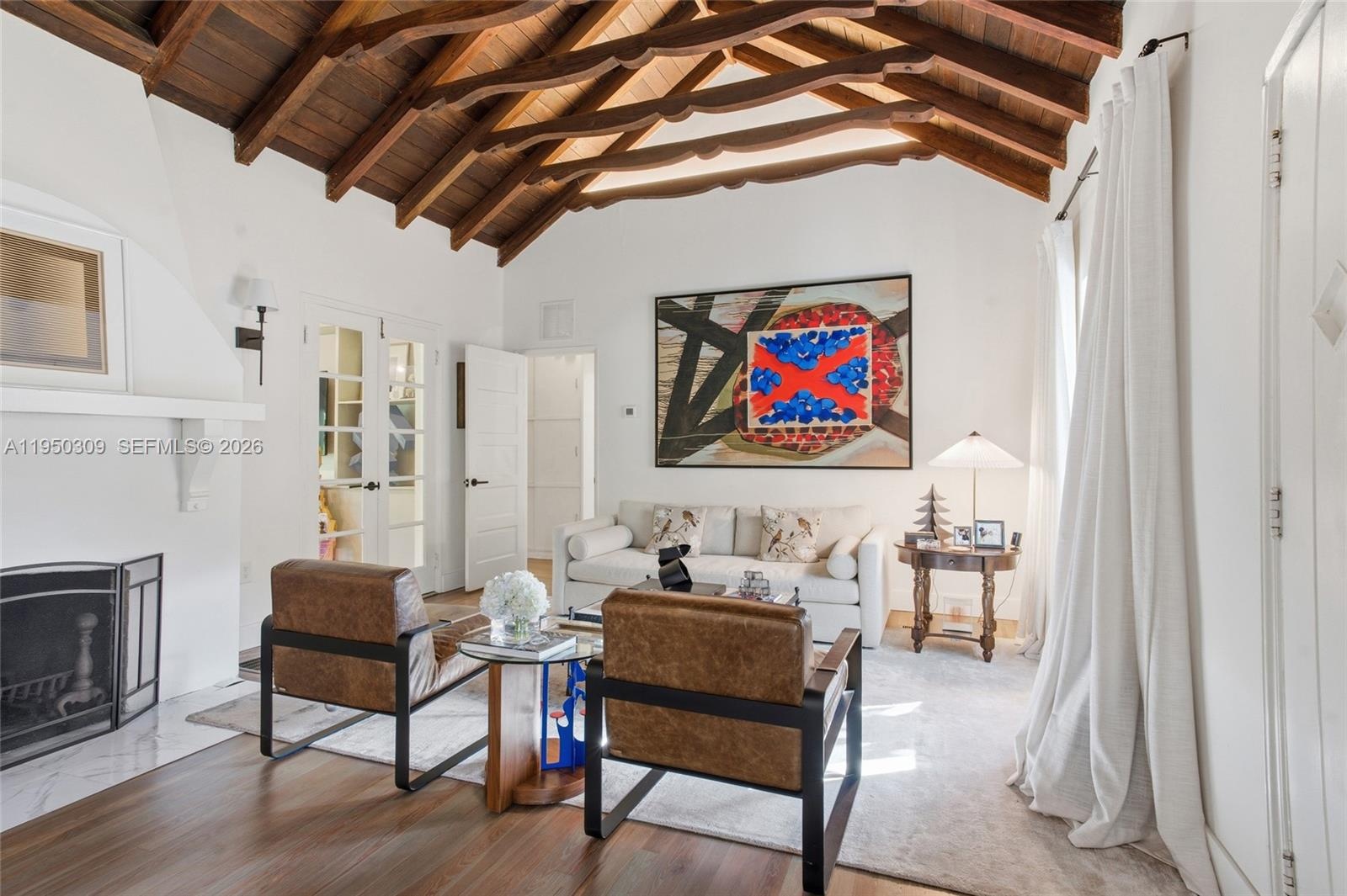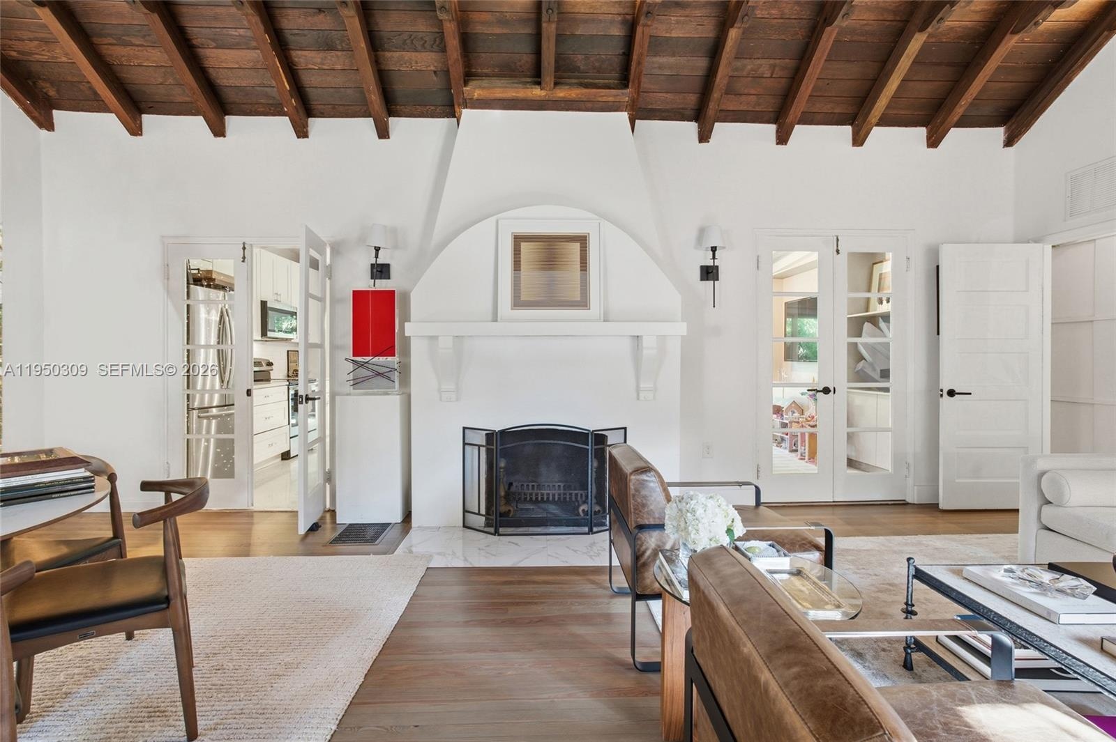 The home features a thoughtful blend of wood and terrazzo floors, vaulted wood-beam ceilings, and a bright open-concept kitchen that flows seamlessly into the family room—ideal for everyday living and entertaining. The living and dining area is anchored by a fully functioning fireplace, adding warmth and character.