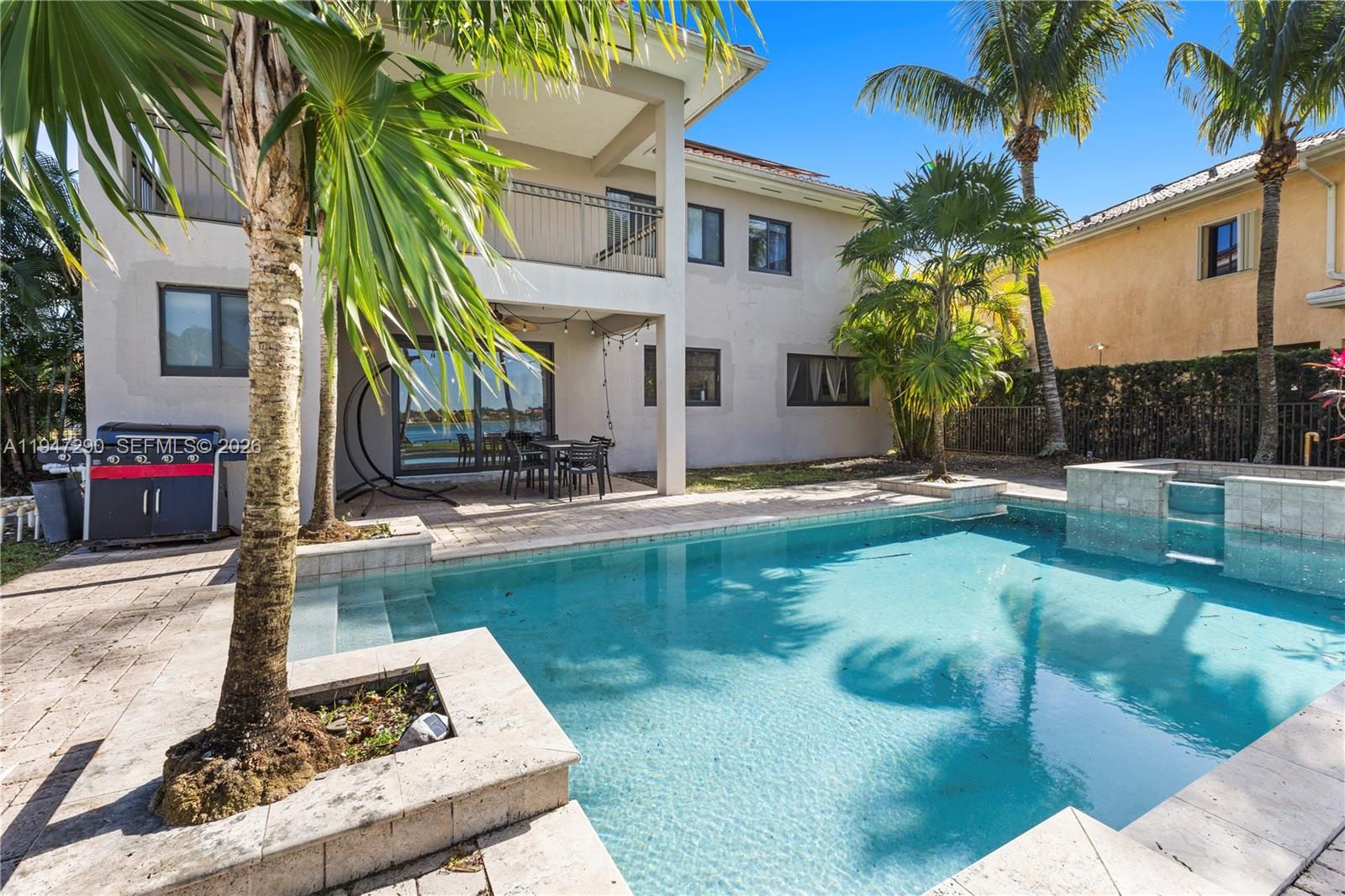 Step outside to your own tropical oasis, complete with a resort-style pool, mature palm trees, and lush privacy hedges overlooking the water. Additional highlights include solar panels, a two-car garage, and a deep driveway providing ample parking.