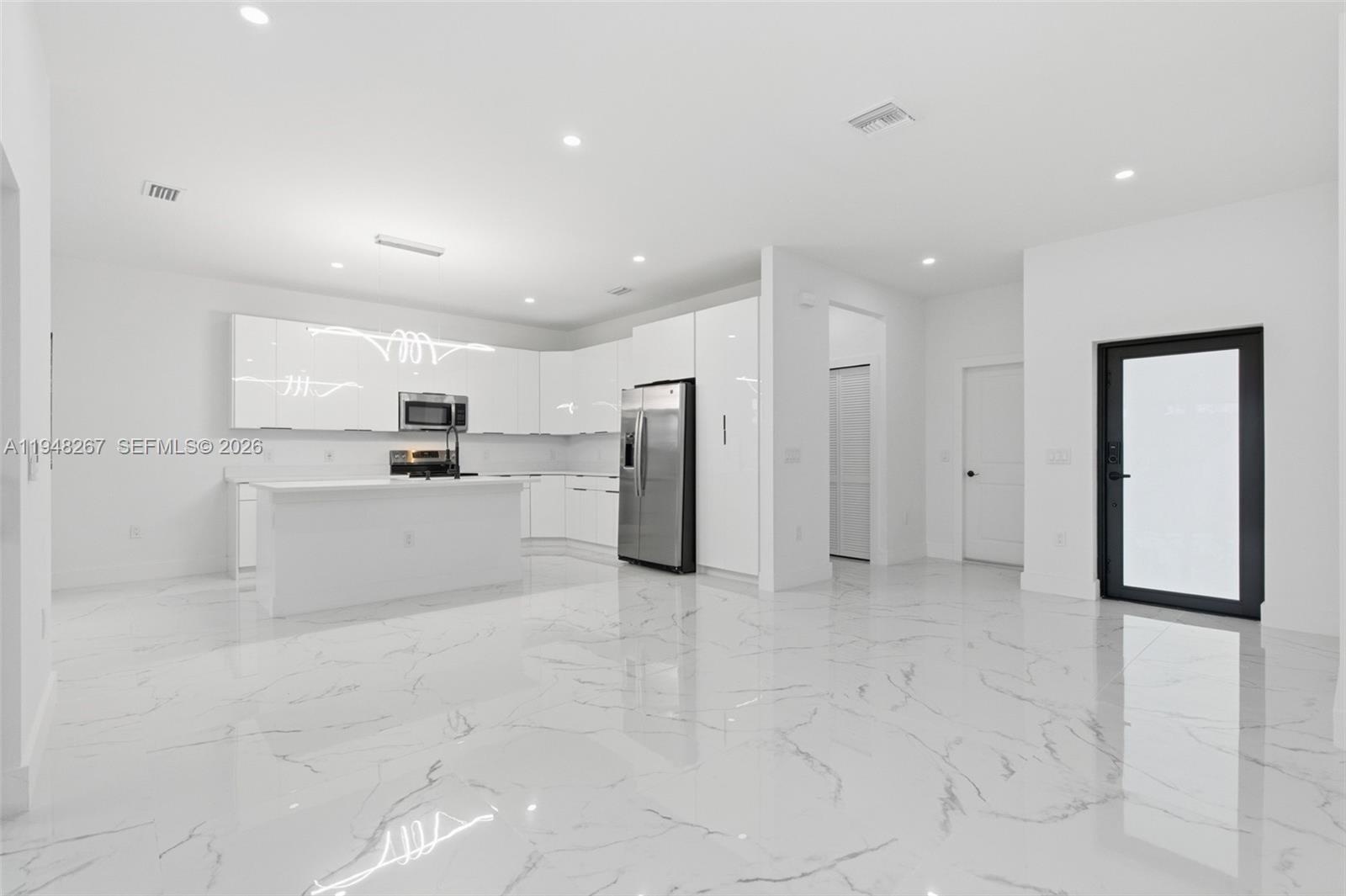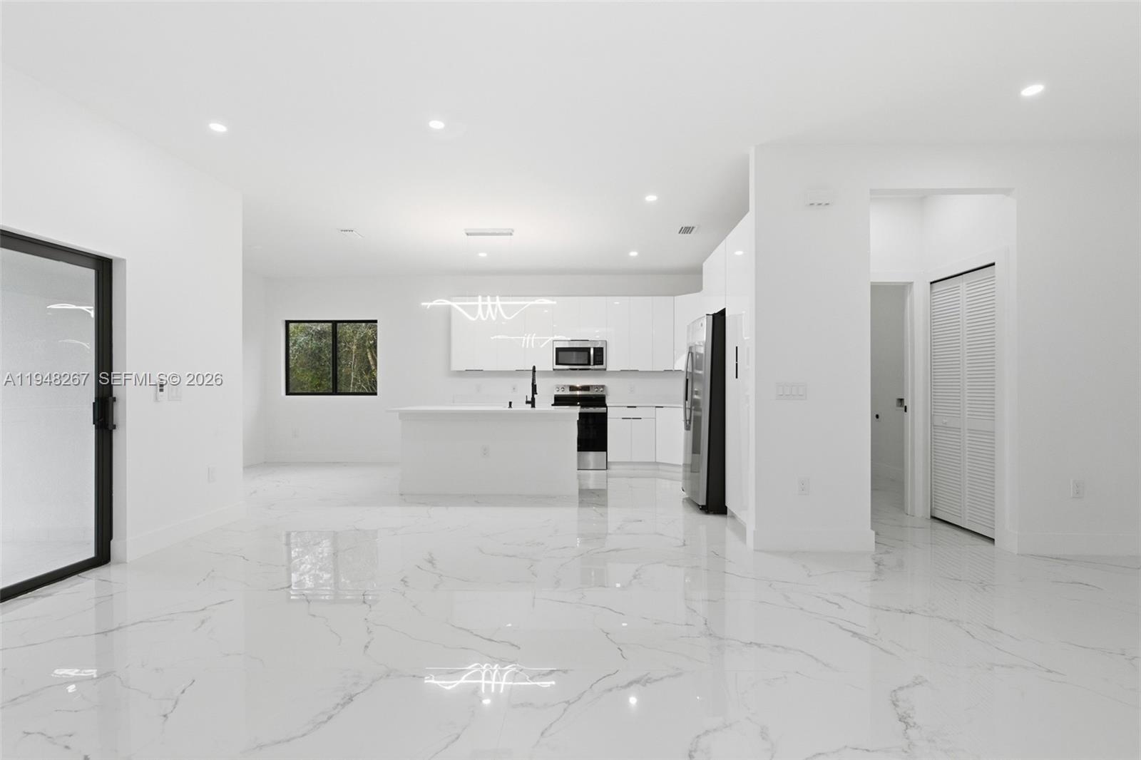 Welcome to this beautifully crafted new construction home located in the desirable residential neighborhood of Mirror Lakes. This thoughtfully designed property offers 3 spacious bedrooms and 2 full bathrooms, blending modern style with everyday comfort. The home features a contemporary kitchen with sleek modern cabinetry, stainless steel appliances, and a striking modern light fixture above the kitchen island, perfect for both daily living and entertaining. Impact hurricane-rated doors and windows provide peace of mind while enhancing energy efficiency. Enjoy outdoor living with ample patio space, highlighted by a mature shade tree, ideal for relaxing, hosting gatherings, or enjoying Florida evenings. Additional features include a 2-car garage, a spacious laundry room, and the rare advantage of no association, offering flexibility and freedom. This open floor plan home combines modern finishes, quality construction, and a quite neighborhood setting; an excellent opportunity for homeowners seeking style, comfort, and convenience.