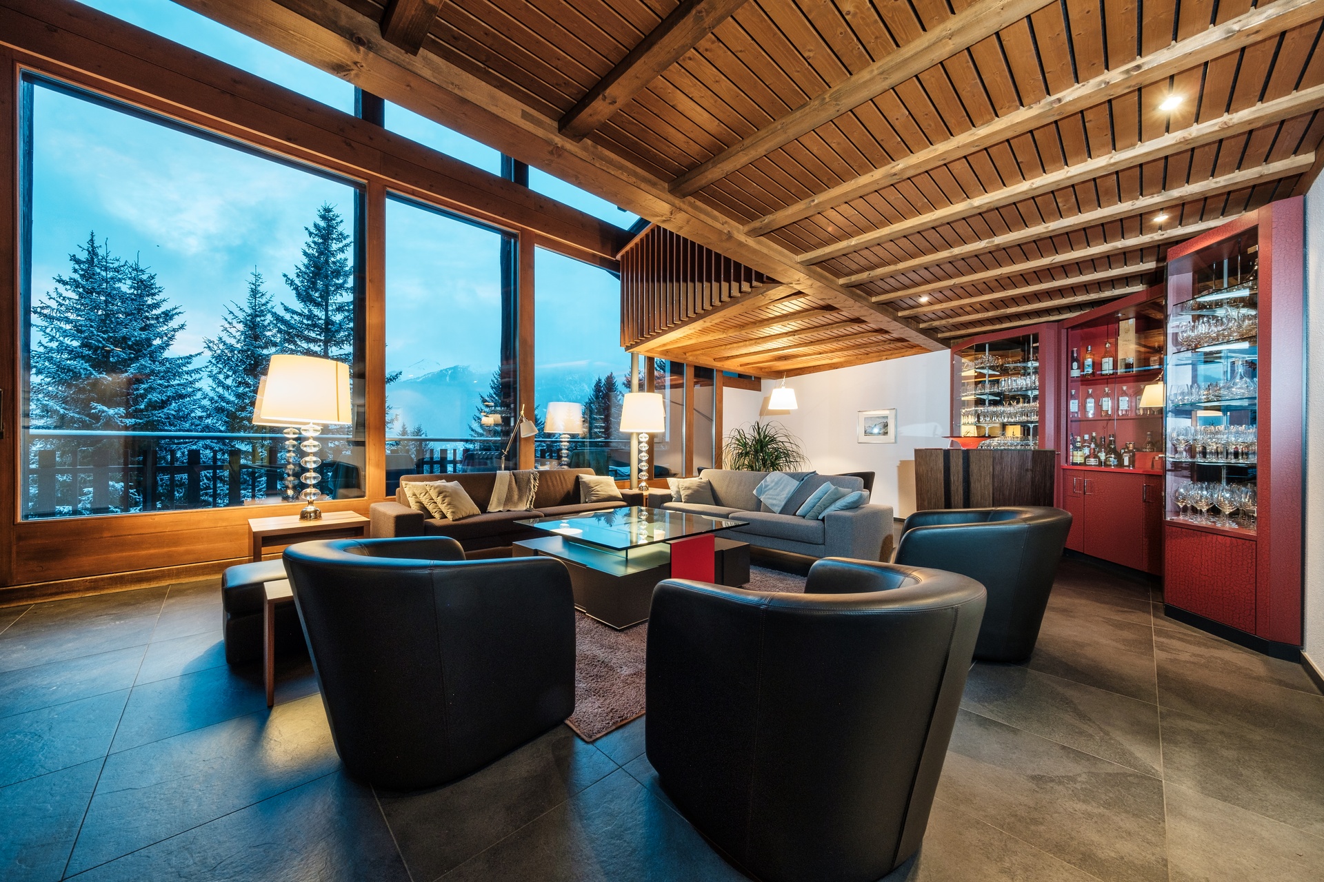 Nestled within a tranquil coniferous forest, on a 0.49 acre plot, this impressive villa spans approximately 7,600 sq ft and enjoys breathtaking mountain views from every room. Designed for both refined entertaining and relaxed family living, the property blends contemporary architecture with warm, natural materials, including wood accents, exposed stone and concrete, and inviting fireplaces throughout.