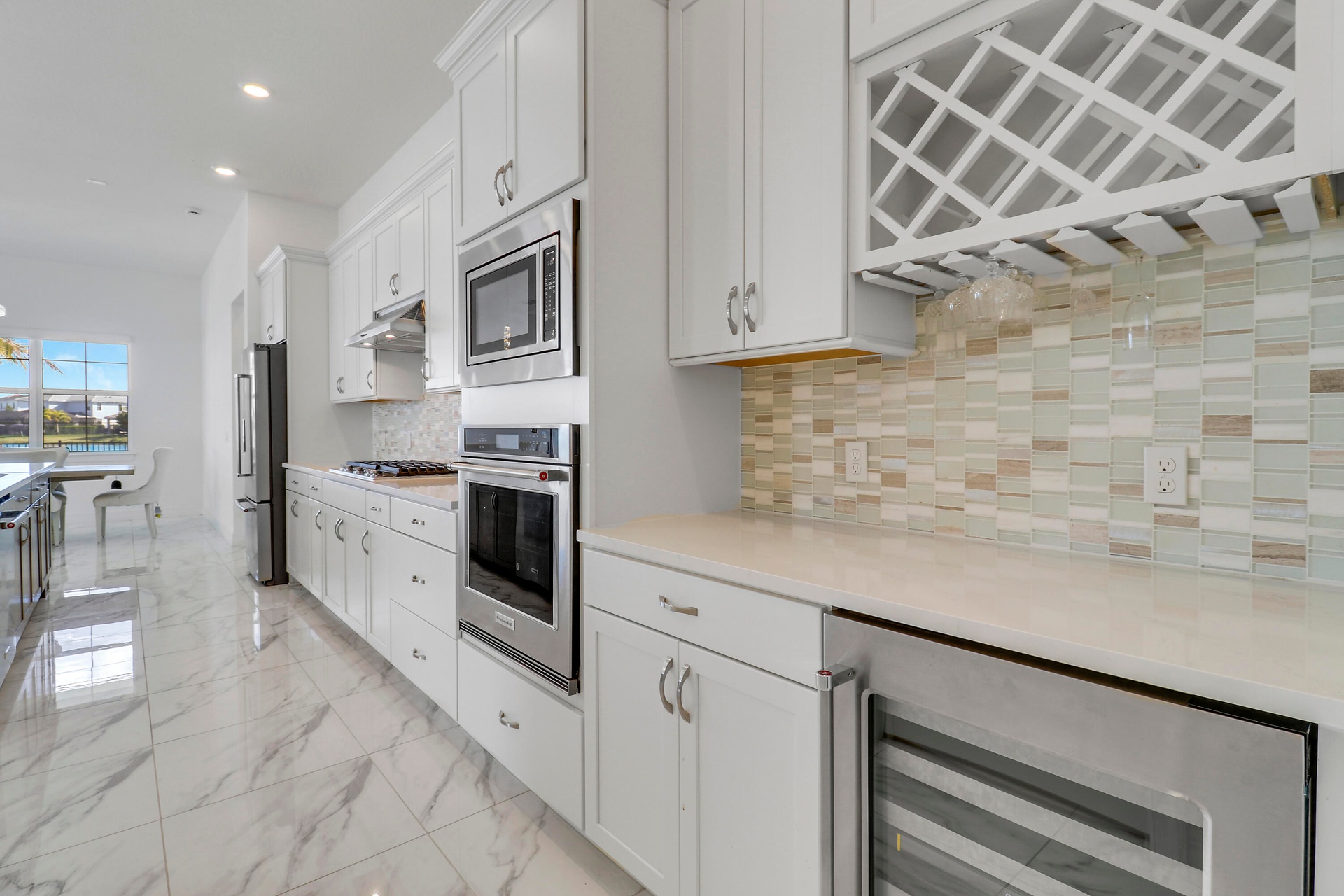The gourmet chef's kitchen is a showpiece featuring sleek quartz countertops, expansive custom cabinetry, premium appliances, and thoughtfully designed coffee and wine entertainment stations, all centered around an oversized island perfect for hosting.
