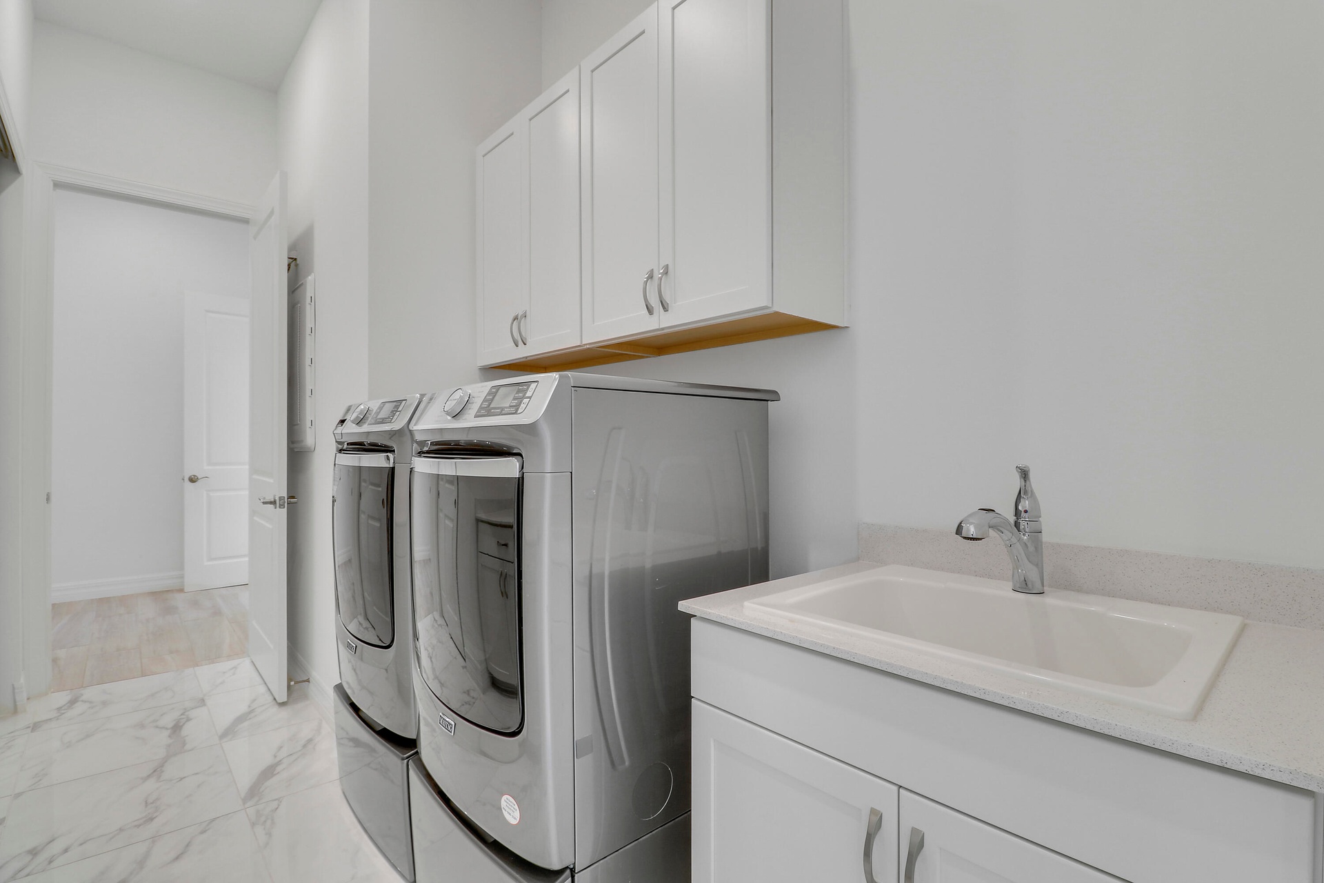 With every bedroom offering its own private ensuite bathroom, the home delivers unmatched comfort and privacy for family and guests alike. Designer lighting, custom window treatments, and premium upgrades elevate every corner of the home. Step outside to your private backyard oasisa serene waterfront setting with ample room to design a custom pool and spa tailored to your vision. A full laundry suite with extralarge washer and dryer adds ultimate convenience.