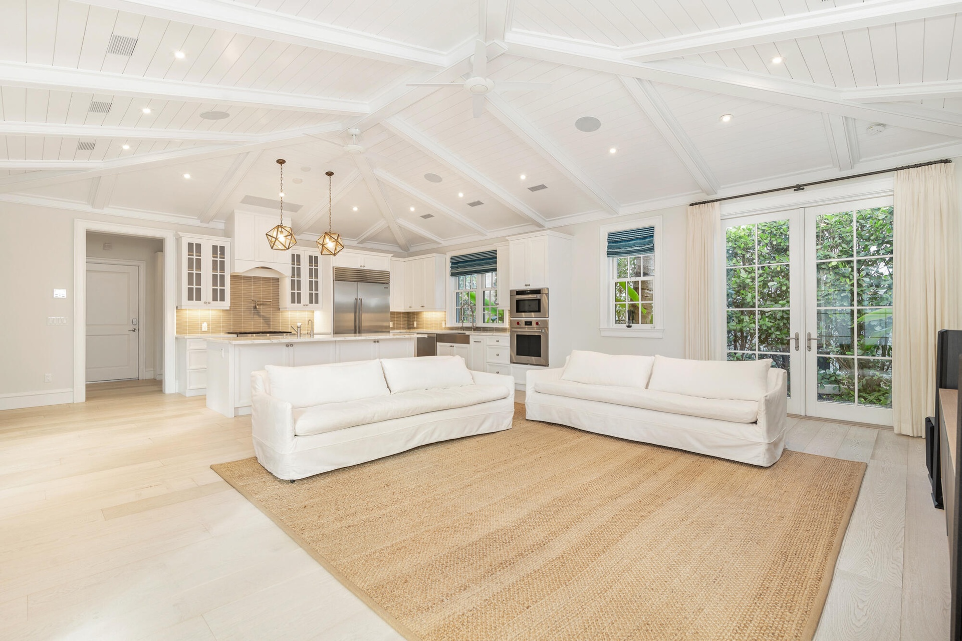 An open-concept kitchen and family room overlook serene pool and garden views. The chef's kitchen features a large island, Wolf and Sub-Zero appliances, and custom birch cabinetry, ideal for both daily living and entertaining.