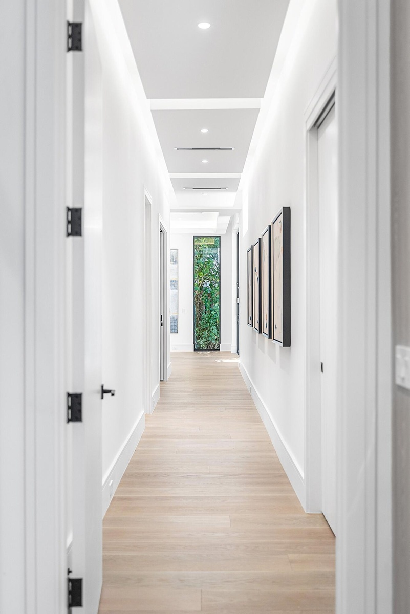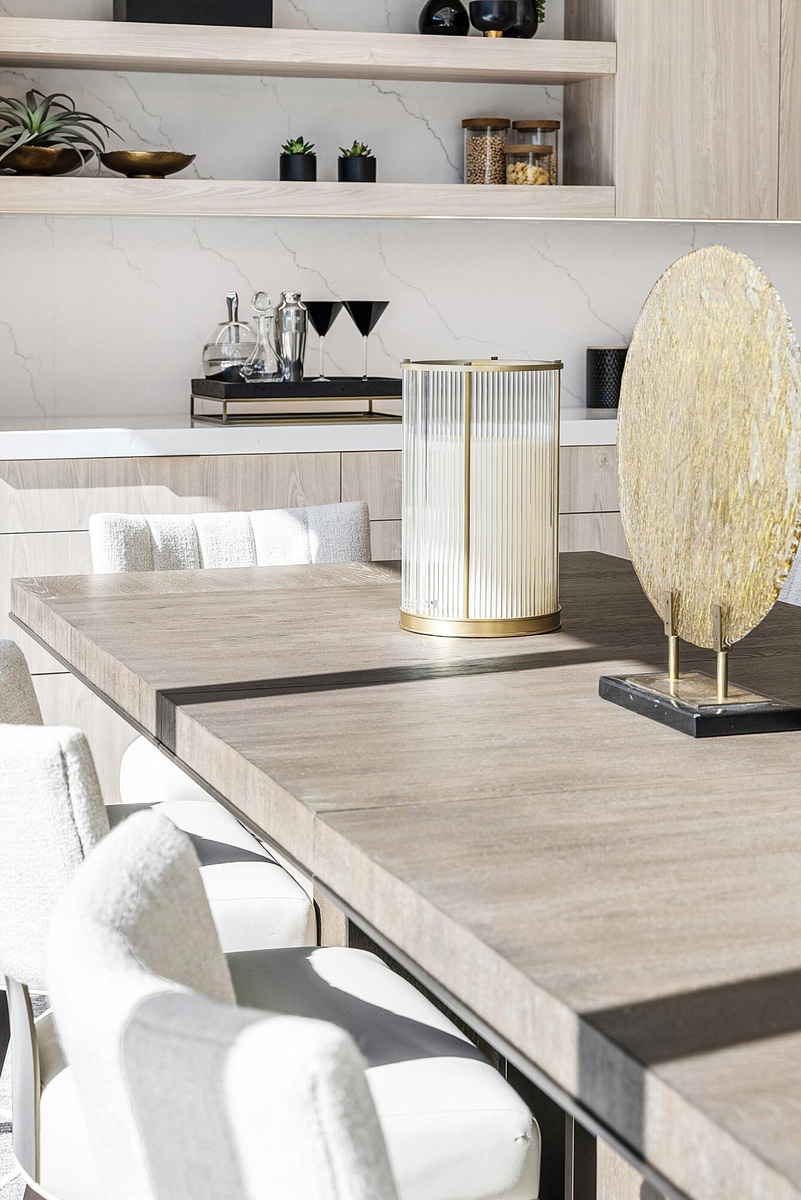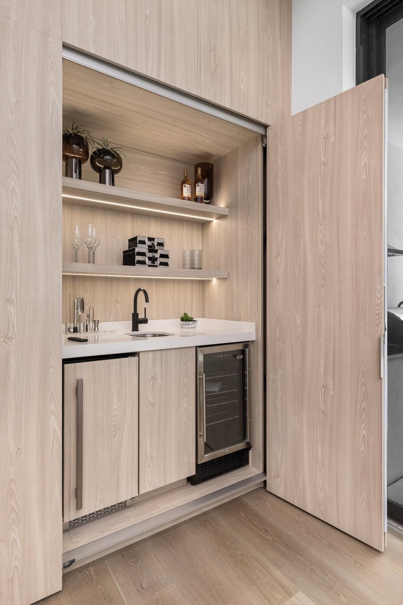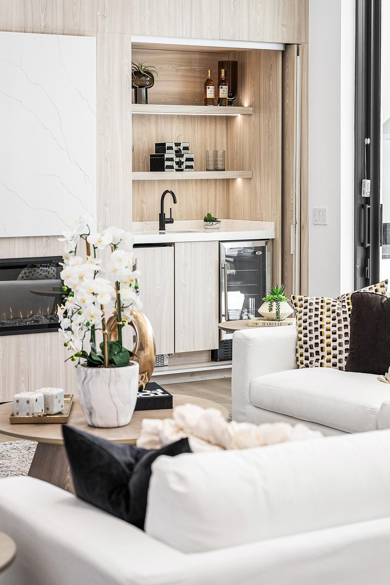 Open-concept living spaces feature 10-inch wide-plank engineered oak flooring, dramatic ceiling details with hidden shade pockets, and LED cove lighting throughout. A sleek glass-enclosed office adds modern sophistication, while a custom wall unit with hidden wet bar