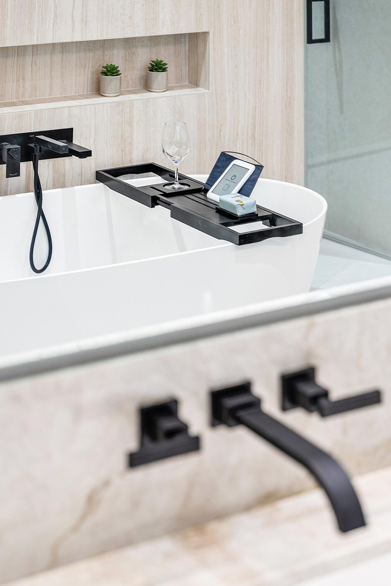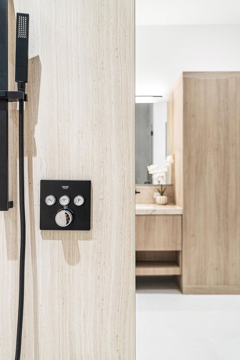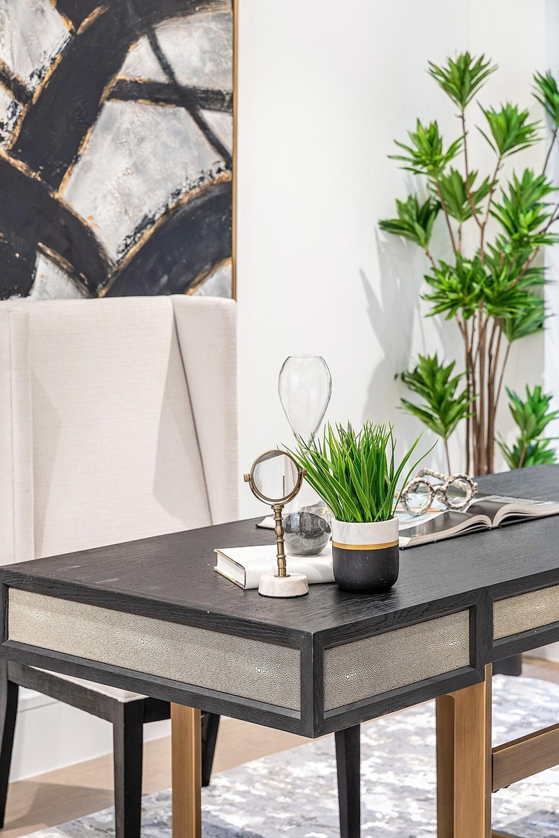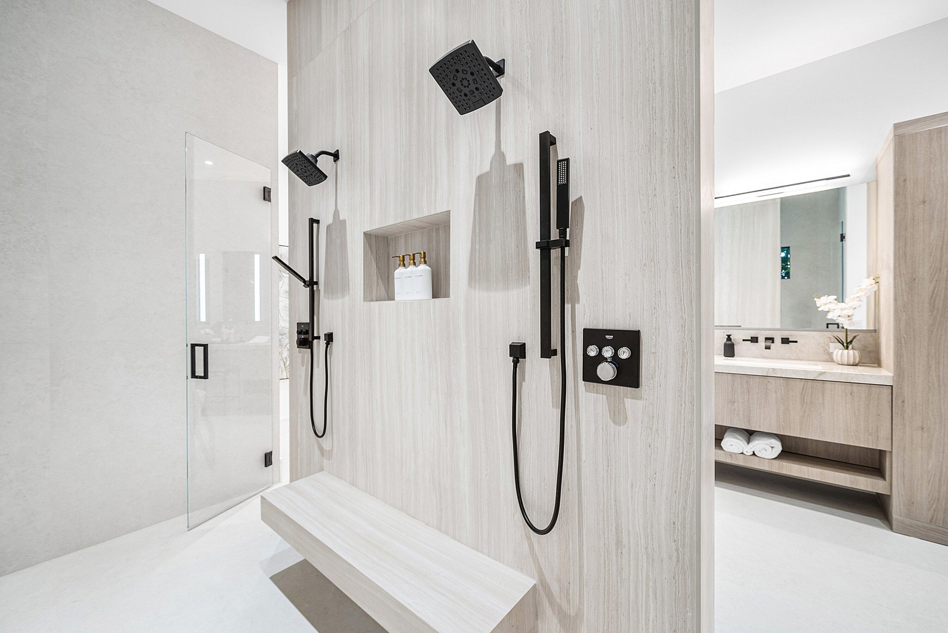 Open-concept living spaces feature 10-inch wide-plank engineered oak flooring, dramatic ceiling details with hidden shade pockets, and LED cove lighting throughout. A sleek glass-enclosed office adds modern sophistication, while a custom wall unit with hidden wet bar