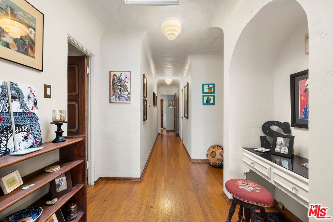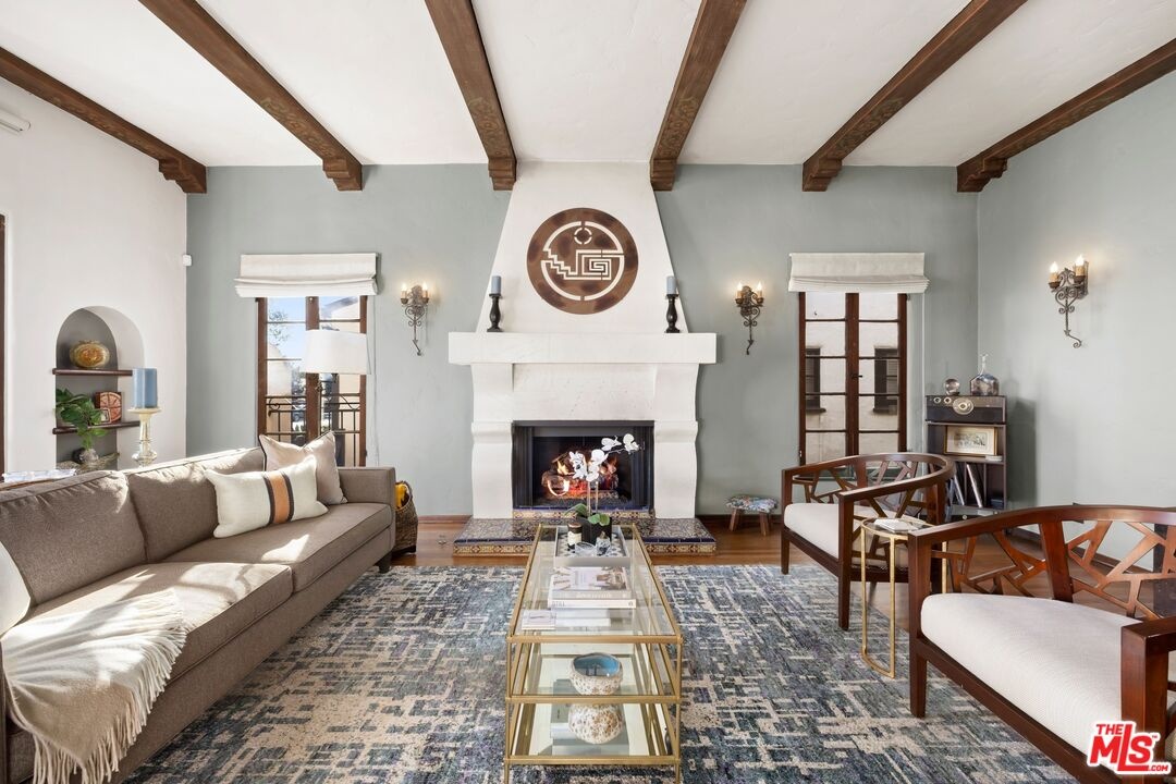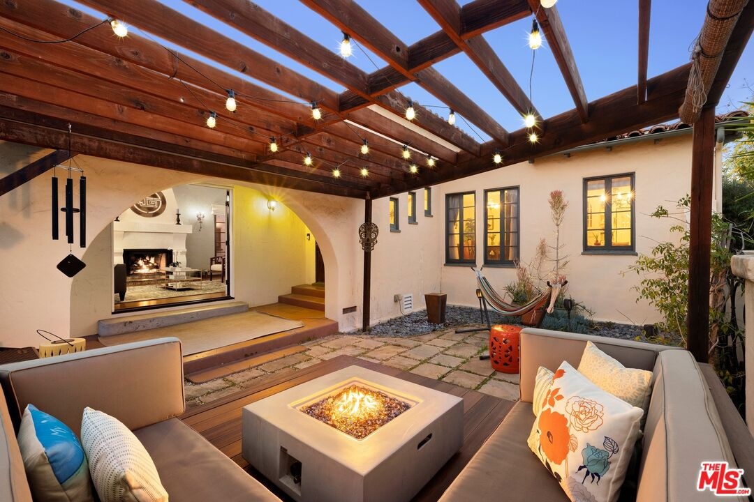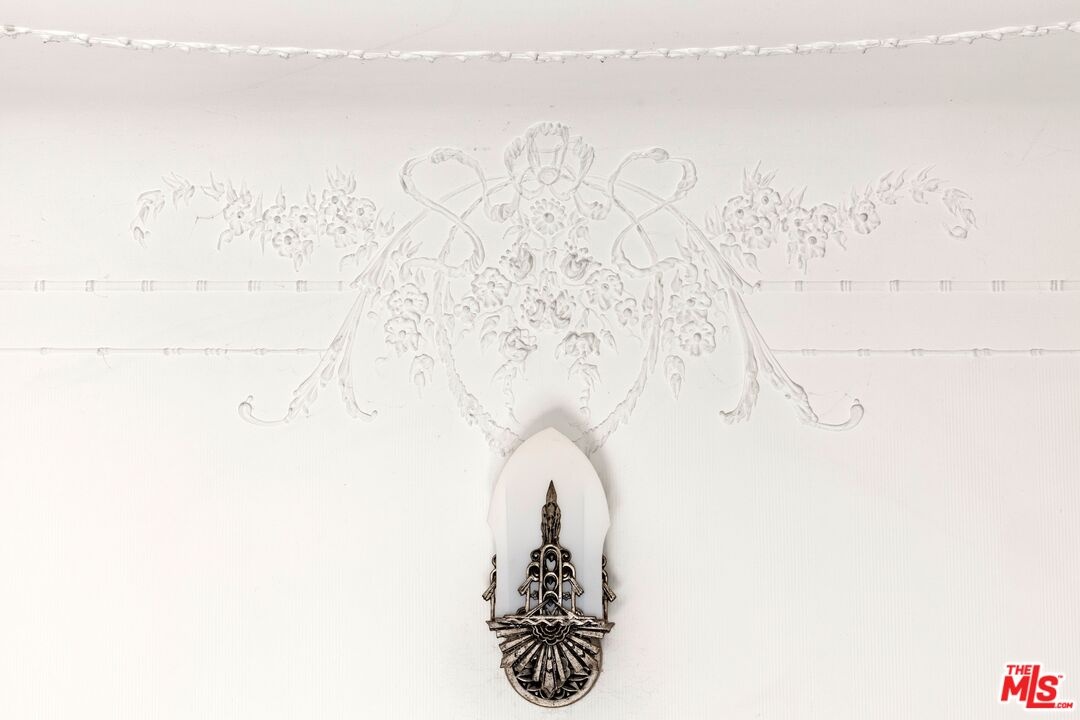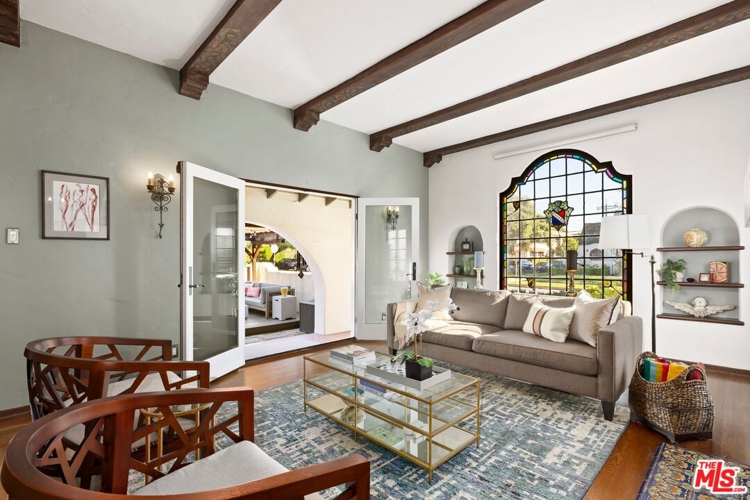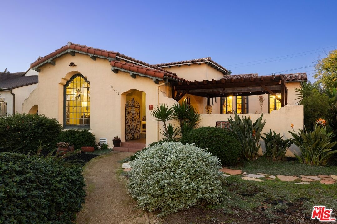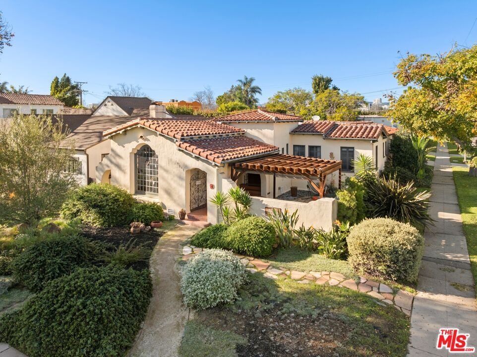 A rarely preserved 1931 Spanish Revival with exceptional original detailing! Built in 1931 as the neighborhood's model home, this beautifully preserved home exemplifies the artistry and craftsmanship of early West Los Angeles architecture. Rich in character and integrity, it retains an impressive collection of original details that are increasingly difficult to find. The exterior sets the tone with red clay tile roofing, sculptural lines, and gently curved walkways framed by mature landscaping, while inside, hand-troweled plaster walls, graceful archways and warm hardwood floors create a seamless and inviting flow throughout the floor plan. The living room is a true focal point, featuring an original sculptural fireplace, hand-painted wood ceiling beams, and a striking stained-glass window that fills the space with soft, filtered light. French doors open to a private interior courtyard, creating a seamless indoor-outdoor connection. The pergola-covered patio, complete with string lighting and a fire feature, functions as an extension of the living space and is ideal for both entertaining and everyday enjoyment. Original bathrooms have been thoughtfully preserved and remain a highlight of the home, showcasing period tilework, integrated tile vanities, scalloped cabinetry, built-in storage, vintage mirrors, and original fixtures. One bath features a pastel palette with a vintage tub and patterned tile floors, while another highlights seafoam and black tile detailing, both beautiful examples of 1930s design. The formal dining room retains its timeless elegance with arched openings, original lighting, and French windows that flood the space with natural light. Bedrooms are tranquil and well proportioned, featuring casement windows, hardwood floors, and rare hand-applied plaster friezes with delicate floral swag detailing. An arched niche desk, original doors and hardware, period sconces, decorative ceiling medallions, and painted wood accents further reinforce the home's architectural authenticity. The rear yard offers additional outdoor space and privacy, completing a property that feels both livable and historically significant. This is not a reinterpretation of a Spanish Revival; it is the real thing. Lovingly maintained and remarkably intact, this home presents a rare opportunity to own a true piece of Los Angeles architectural history. Ideally located near Century City and Beverly Hills, with easy access to shops, dining and parks. Located within the highly coveted Westwood Charter Elementary School District.