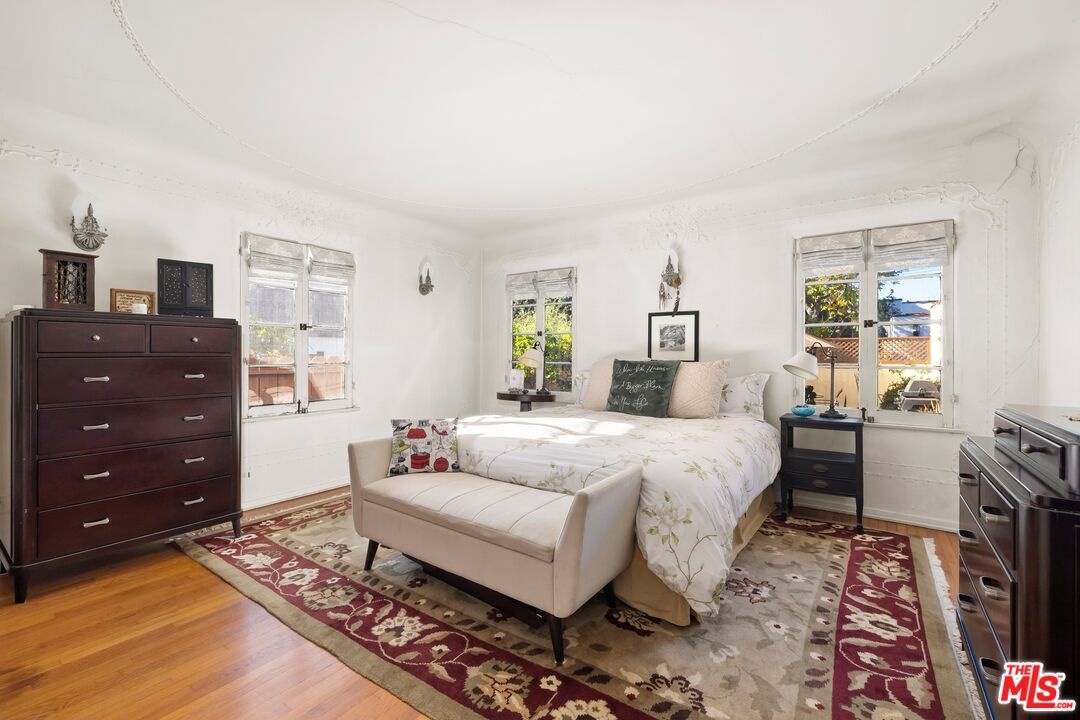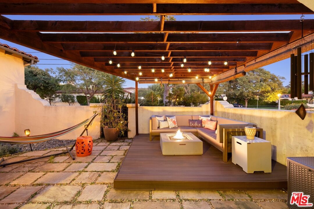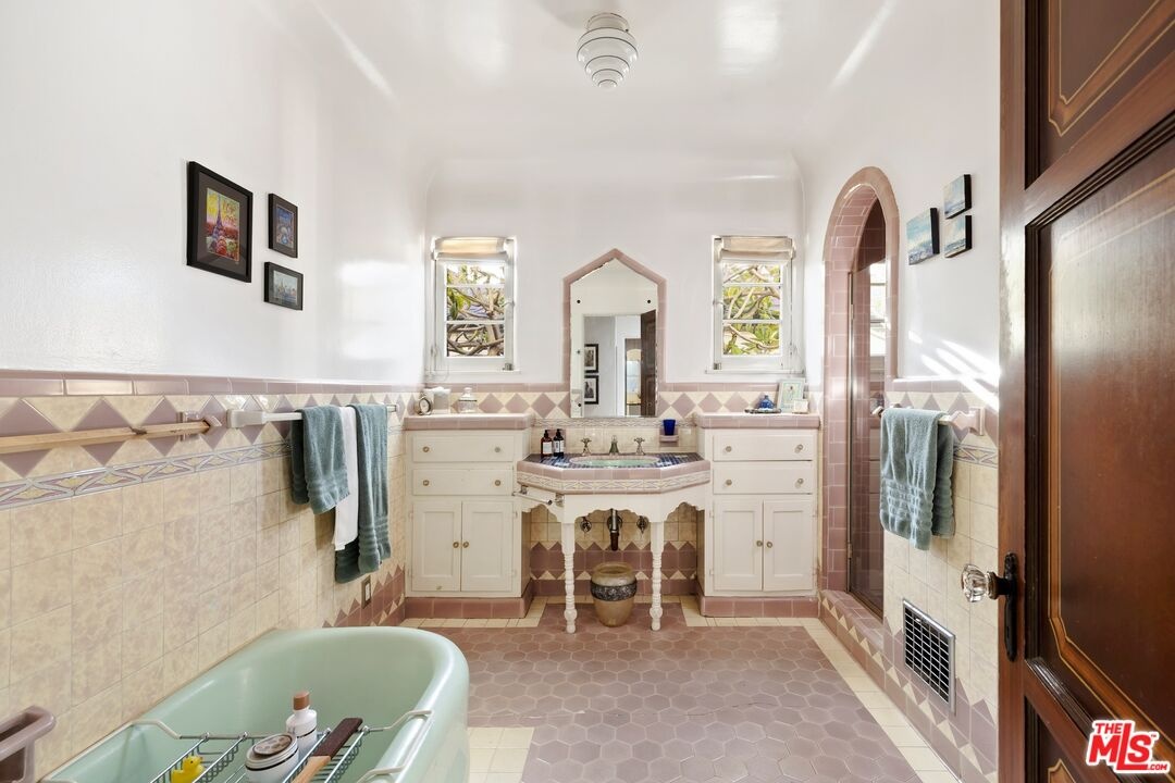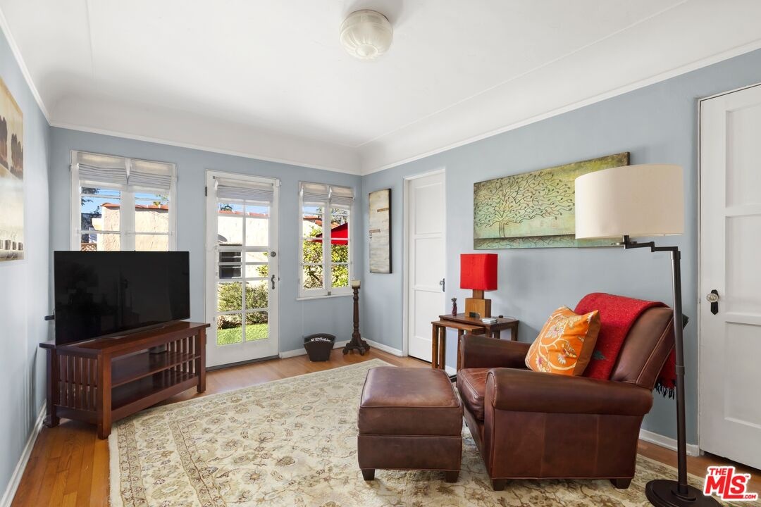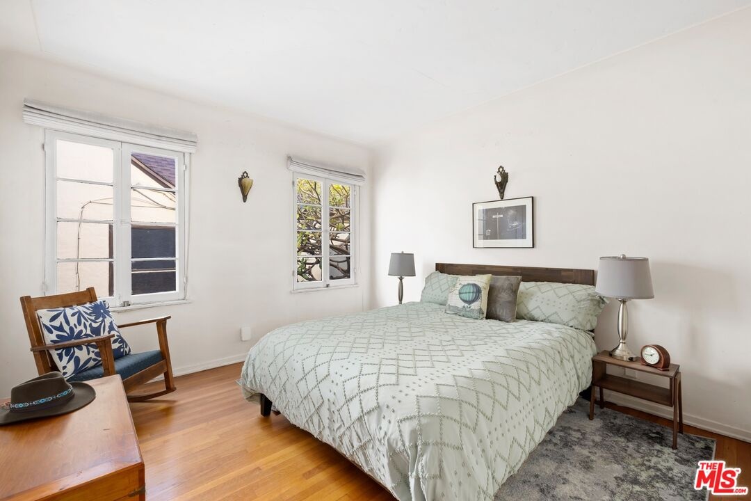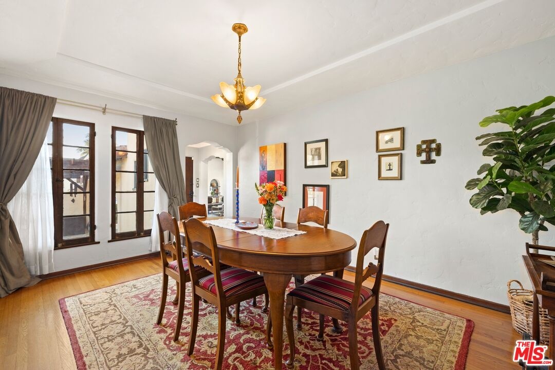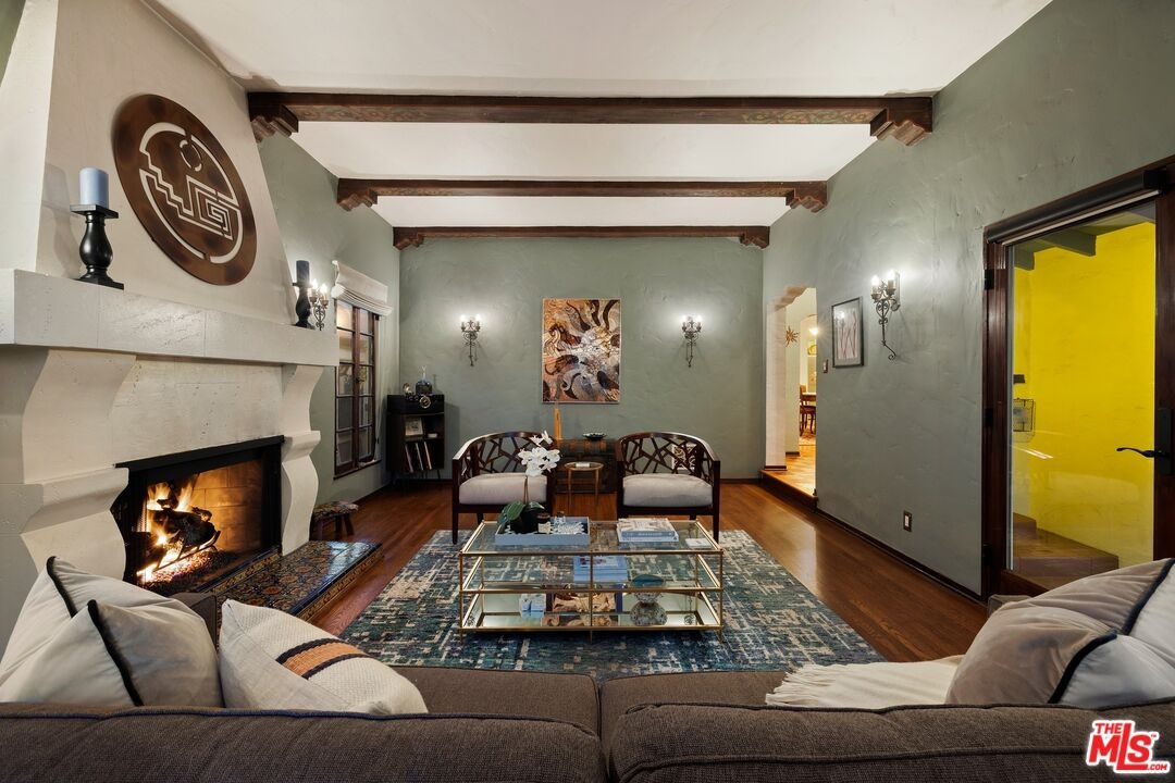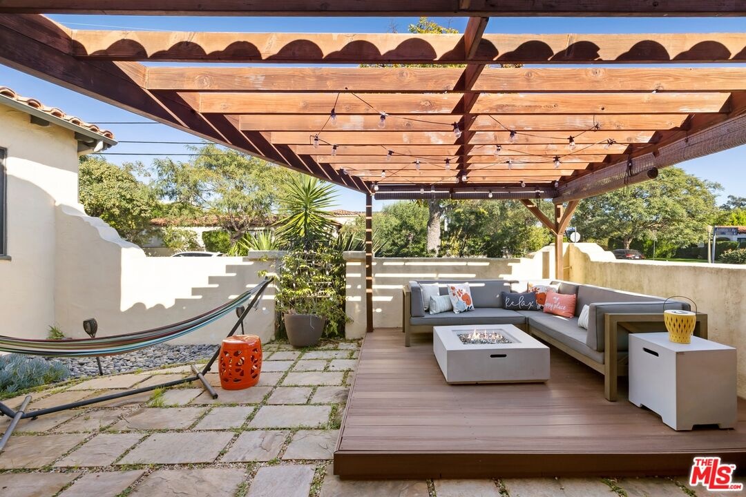 A rarely preserved 1931 Spanish Revival with exceptional original detailing! Built in 1931 as the neighborhood's model home, this beautifully preserved home exemplifies the artistry and craftsmanship of early West Los Angeles architecture. Rich in character and integrity, it retains an impressive collection of original details that are increasingly difficult to find. The exterior sets the tone with red clay tile roofing, sculptural lines, and gently curved walkways framed by mature landscaping, while inside, hand-troweled plaster walls, graceful archways and warm hardwood floors create a seamless and inviting flow throughout the floor plan. The living room is a true focal point, featuring an original sculptural fireplace, hand-painted wood ceiling beams, and a striking stained-glass window that fills the space with soft, filtered light. French doors open to a private interior courtyard, creating a seamless indoor-outdoor connection. The pergola-covered patio, complete with string lighting and a fire feature, functions as an extension of the living space and is ideal for both entertaining and everyday enjoyment. Original bathrooms have been thoughtfully preserved and remain a highlight of the home, showcasing period tilework, integrated tile vanities, scalloped cabinetry, built-in storage, vintage mirrors, and original fixtures. One bath features a pastel palette with a vintage tub and patterned tile floors, while another highlights seafoam and black tile detailing, both beautiful examples of 1930s design. The formal dining room retains its timeless elegance with arched openings, original lighting, and French windows that flood the space with natural light. Bedrooms are tranquil and well proportioned, featuring casement windows, hardwood floors, and rare hand-applied plaster friezes with delicate floral swag detailing. An arched niche desk, original doors and hardware, period sconces, decorative ceiling medallions, and painted wood accents further reinforce the home's architectural authenticity. The rear yard offers additional outdoor space and privacy, completing a property that feels both livable and historically significant. This is not a reinterpretation of a Spanish Revival; it is the real thing. Lovingly maintained and remarkably intact, this home presents a rare opportunity to own a true piece of Los Angeles architectural history. Ideally located near Century City and Beverly Hills, with easy access to shops, dining and parks. Located within the highly coveted Westwood Charter Elementary School District.