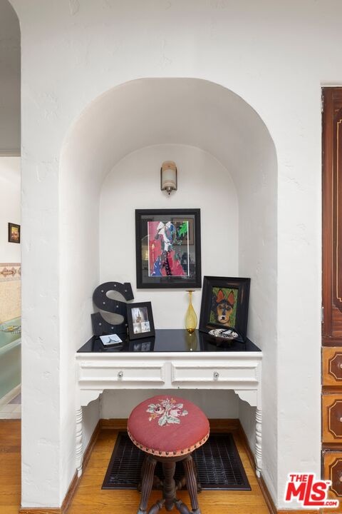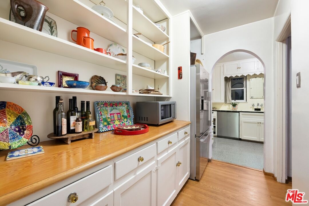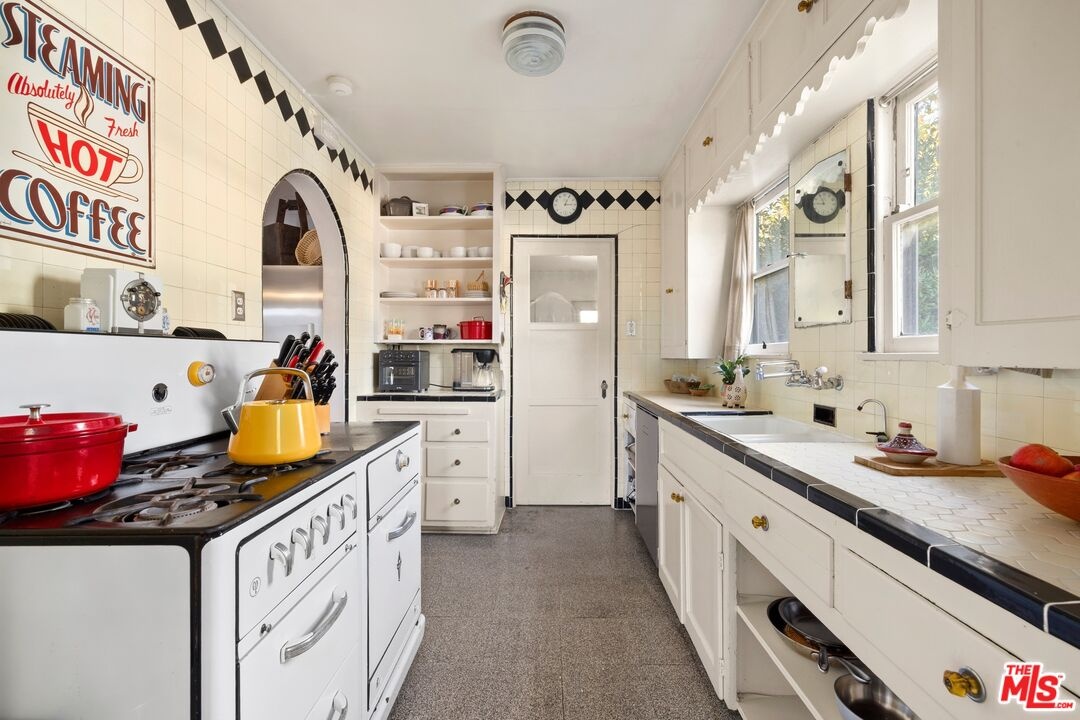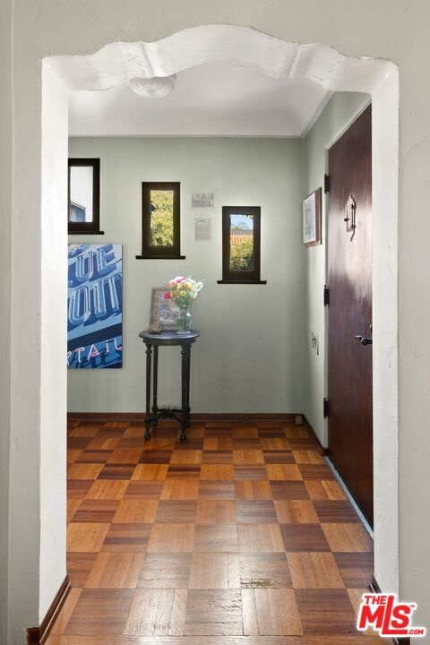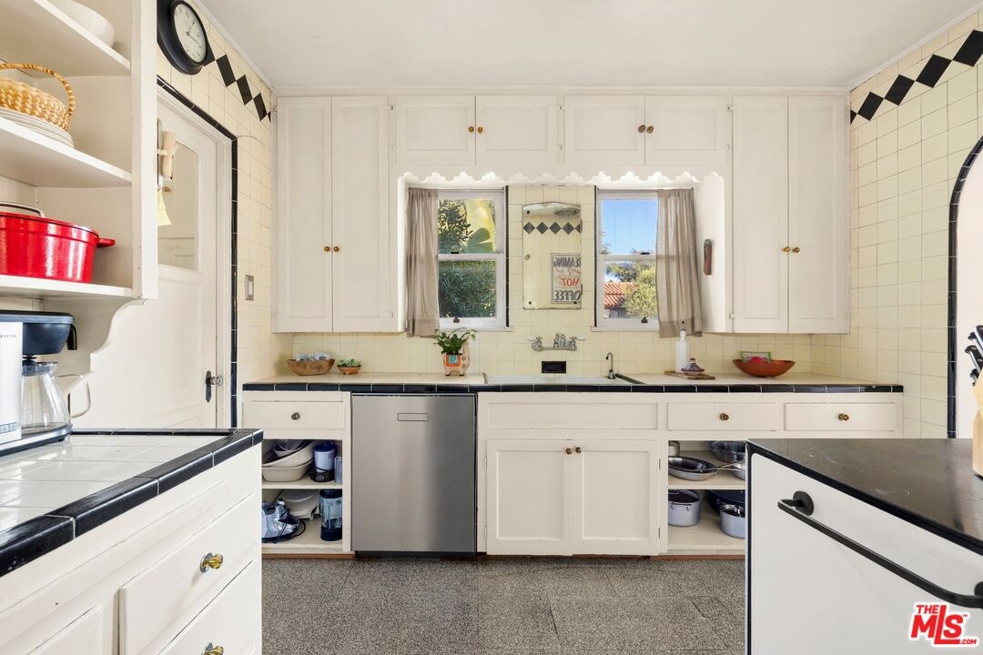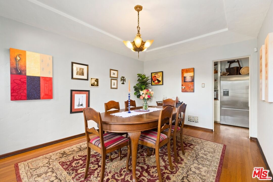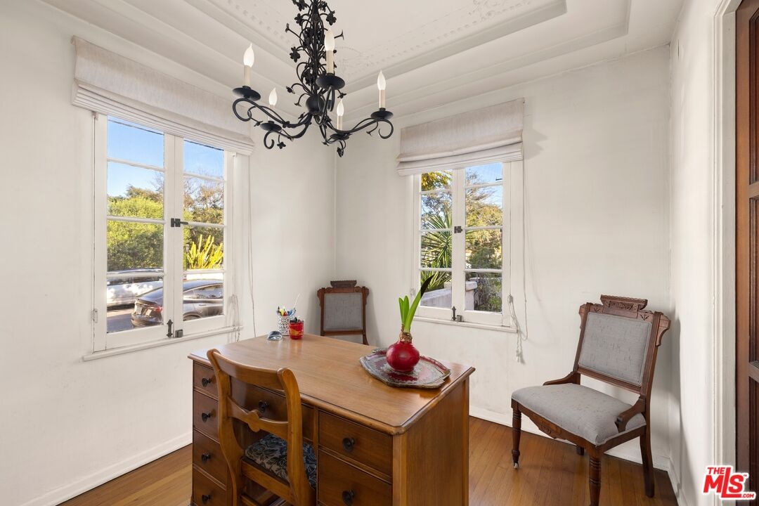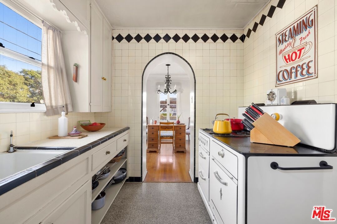 A rarely preserved 1931 Spanish Revival with exceptional original detailing! Built in 1931 as the neighborhood's model home, this beautifully preserved home exemplifies the artistry and craftsmanship of early West Los Angeles architecture. Rich in character and integrity, it retains an impressive collection of original details that are increasingly difficult to find. The exterior sets the tone with red clay tile roofing, sculptural lines, and gently curved walkways framed by mature landscaping, while inside, hand-troweled plaster walls, graceful archways and warm hardwood floors create a seamless and inviting flow throughout the floor plan. The living room is a true focal point, featuring an original sculptural fireplace, hand-painted wood ceiling beams, and a striking stained-glass window that fills the space with soft, filtered light. French doors open to a private interior courtyard, creating a seamless indoor-outdoor connection. The pergola-covered patio, complete with string lighting and a fire feature, functions as an extension of the living space and is ideal for both entertaining and everyday enjoyment. Original bathrooms have been thoughtfully preserved and remain a highlight of the home, showcasing period tilework, integrated tile vanities, scalloped cabinetry, built-in storage, vintage mirrors, and original fixtures. One bath features a pastel palette with a vintage tub and patterned tile floors, while another highlights seafoam and black tile detailing, both beautiful examples of 1930s design. The formal dining room retains its timeless elegance with arched openings, original lighting, and French windows that flood the space with natural light. Bedrooms are tranquil and well proportioned, featuring casement windows, hardwood floors, and rare hand-applied plaster friezes with delicate floral swag detailing. An arched niche desk, original doors and hardware, period sconces, decorative ceiling medallions, and painted wood accents further reinforce the home's architectural authenticity. The rear yard offers additional outdoor space and privacy, completing a property that feels both livable and historically significant. This is not a reinterpretation of a Spanish Revival; it is the real thing. Lovingly maintained and remarkably intact, this home presents a rare opportunity to own a true piece of Los Angeles architectural history. Ideally located near Century City and Beverly Hills, with easy access to shops, dining and parks. Located within the highly coveted Westwood Charter Elementary School District.