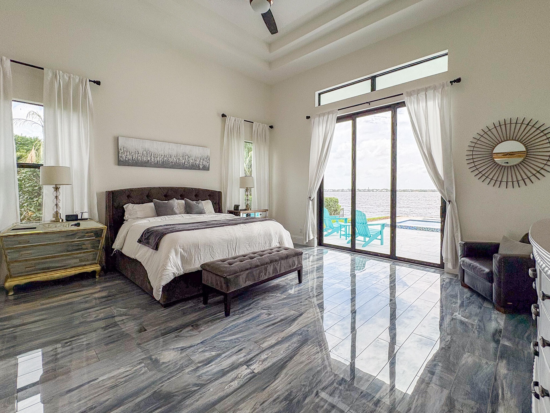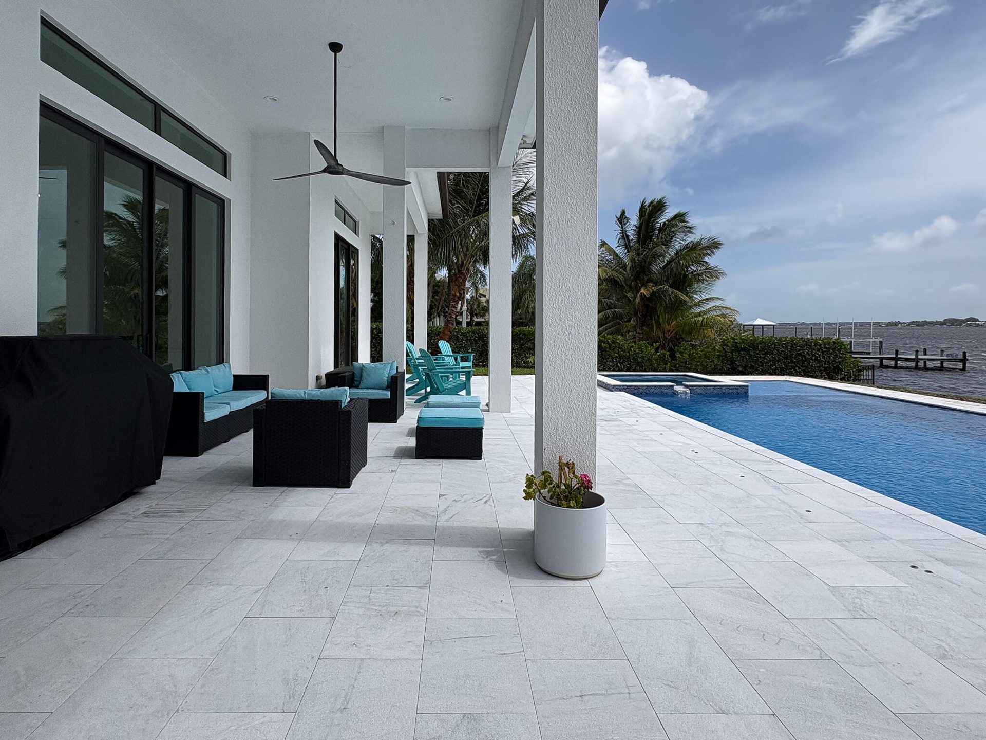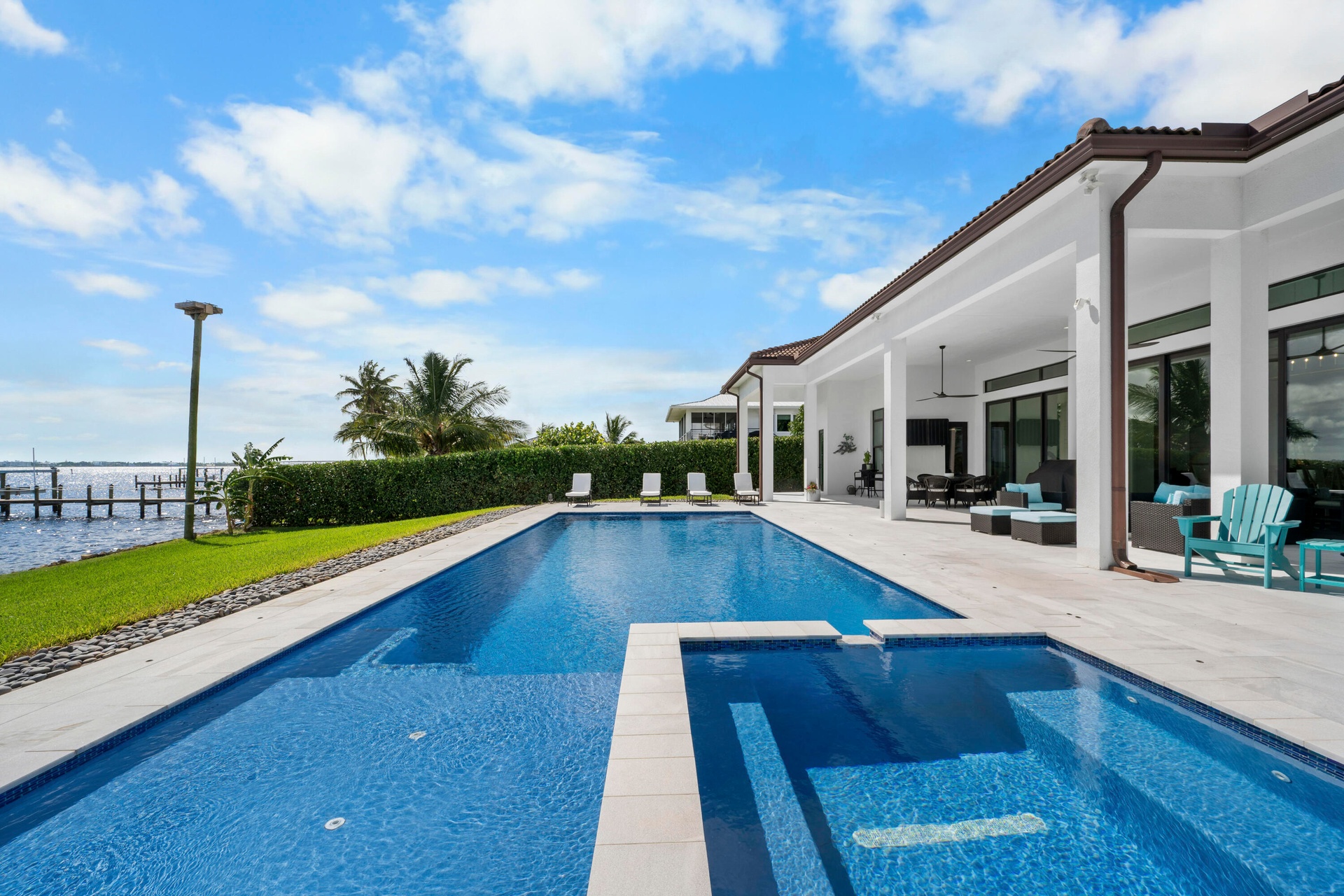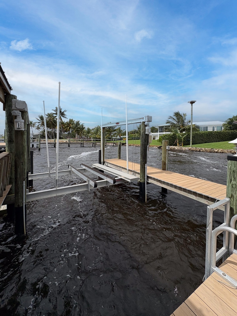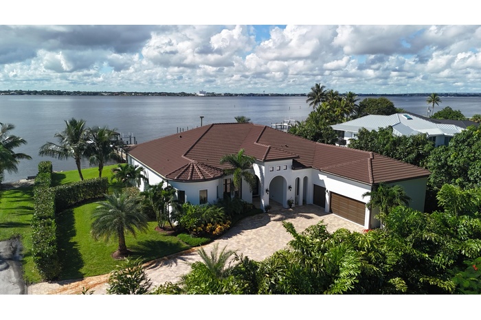FIRST TIME ON MARKET! Premier waterfront location built in 2020. Modern-Mediterranean home close to downtown Jensen Beach and Stuart. Spectacular southern exposure and wide-water view. Direct ocean access minutes from the St. Lucie Inlet. No low bridges - a boater's dream. High coffered ceilings, four spacious bedrooms plus a den, four full baths, and a cabana bath designed for everyday comfort and effortless entertaining. Gourmet chef's kitchen, top notch appliances, quartzite counters, custom cabinetry, walk-in pantry. Private waterfront with covered dock, two high-speed boat lifts, personal watercraft lift, and lowered platform for kayaks and paddle boards. Room for your yacht or sport-fish. Heated saltwater pool, spa tub, sun shelf, and iridescent glass tile. 3-car garage, impact windows & sliders, huge covered patio, backup generator, 1,000 lb in-ground propane tank. Perfect balance of comfort, convenience, and breathtaking waterfront views. Don't miss your chance to own it!