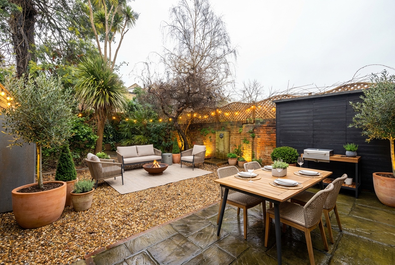 Landscaped garden with patio and summer house