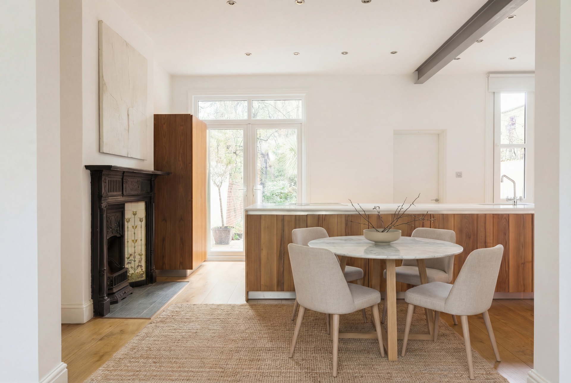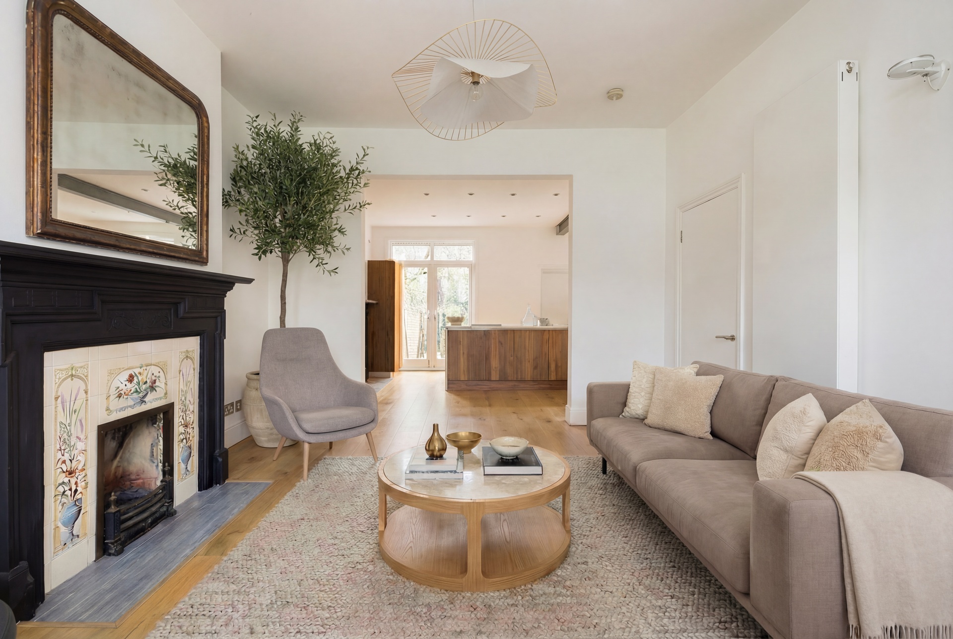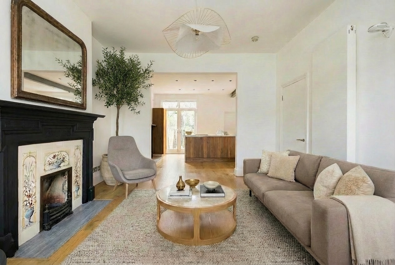 The principal reception room is centred around a feature fireplace and flows seamlessly into a superb open-plan kitchen and breakfast room, creating a natural hub for both everyday life and entertaining. Throughout the house, warm wooden floors and a carefully curated neutral palette create a calm, cohesive and sophisticated interior.