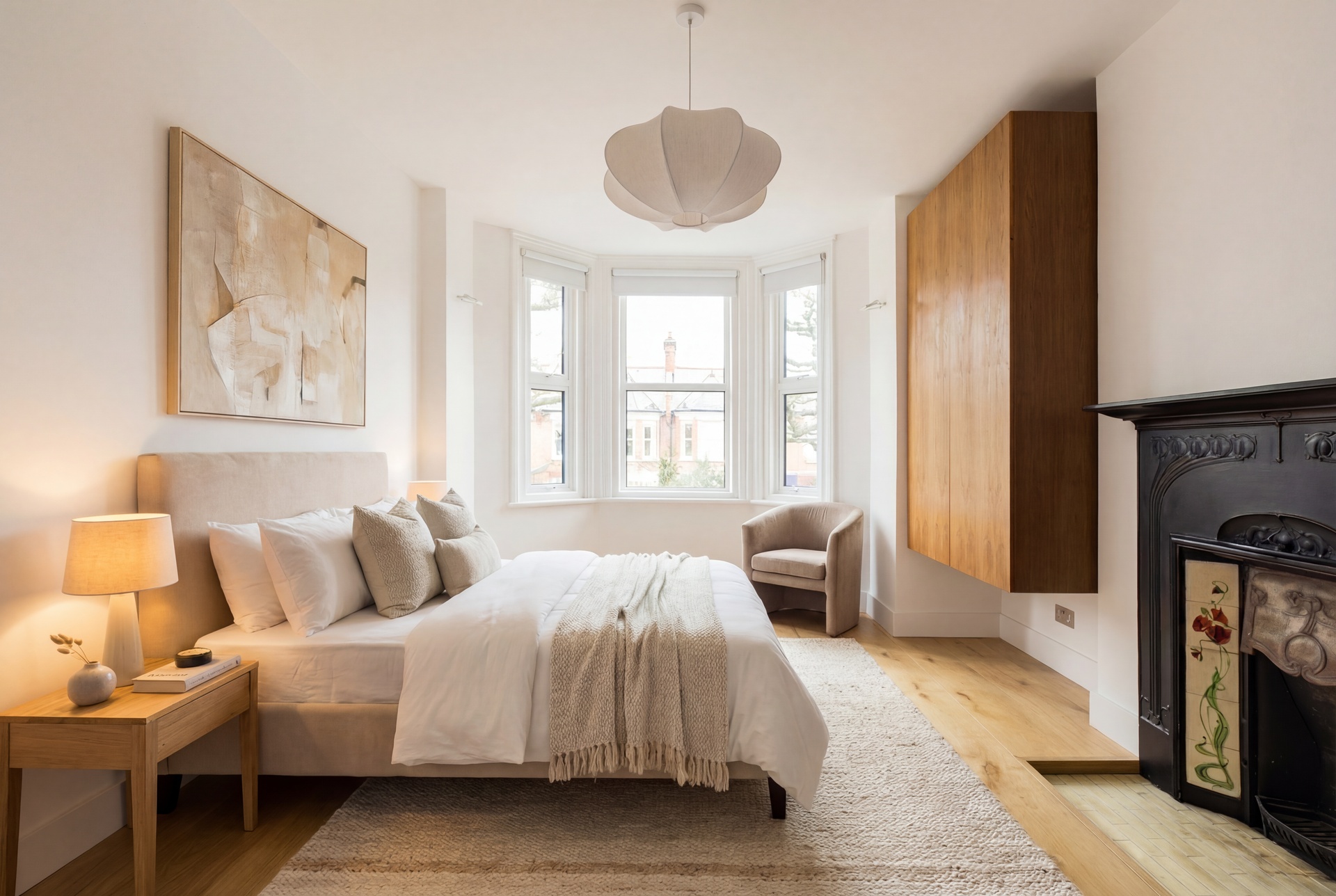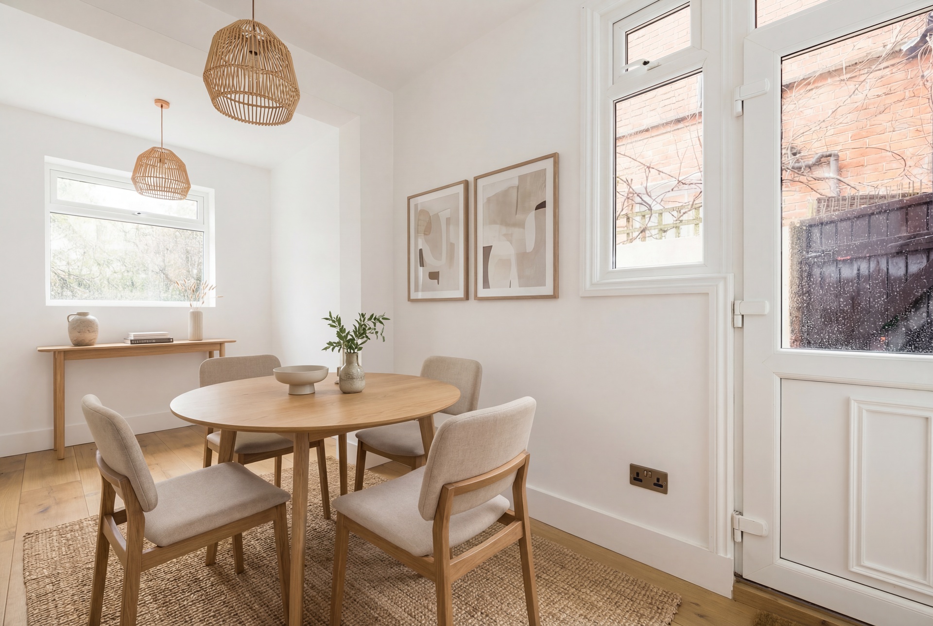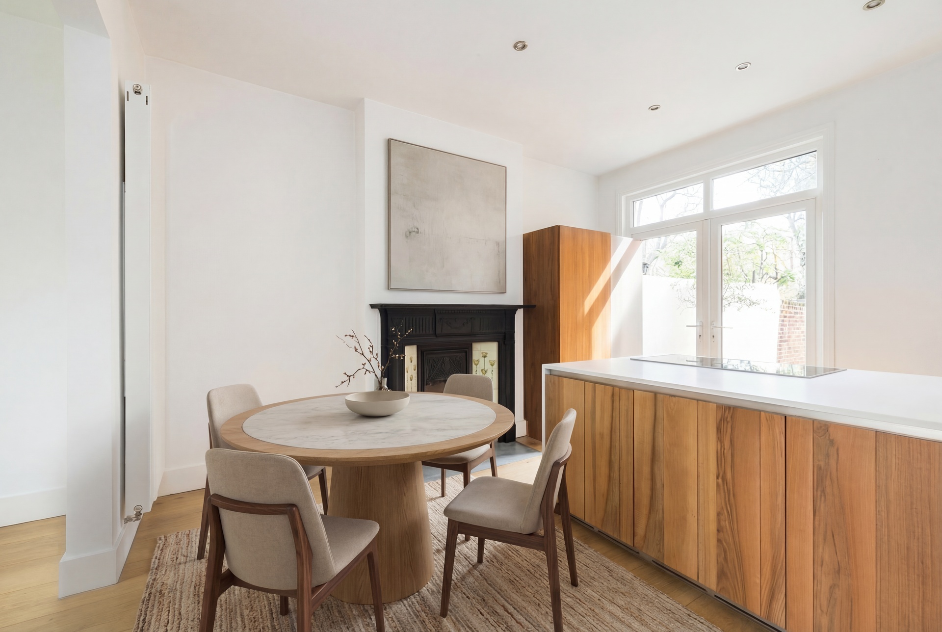 The principal reception room is centred around a feature fireplace and flows seamlessly into a superb open-plan kitchen and breakfast room, creating a natural hub for both everyday life and entertaining. Throughout the house, warm wooden floors and a carefully curated neutral palette create a calm, cohesive and sophisticated interior.